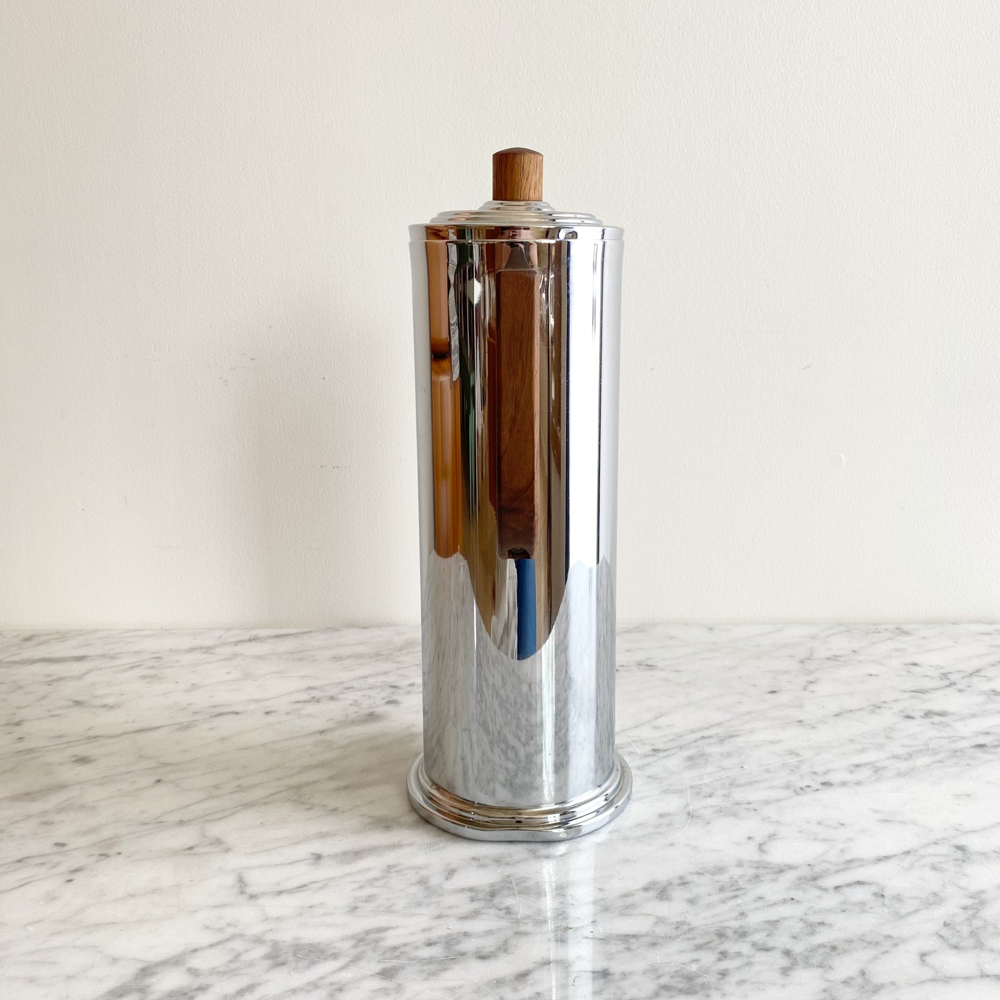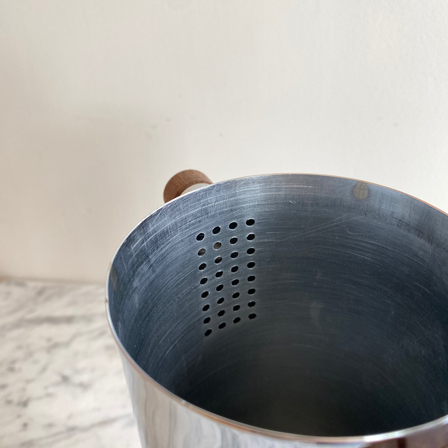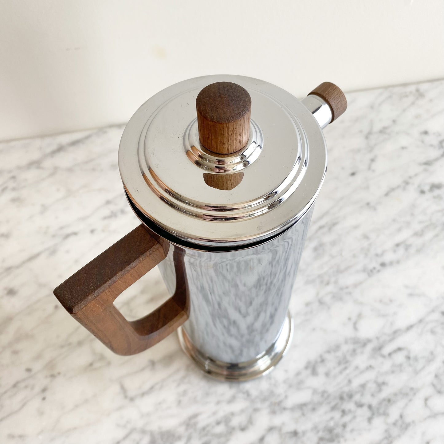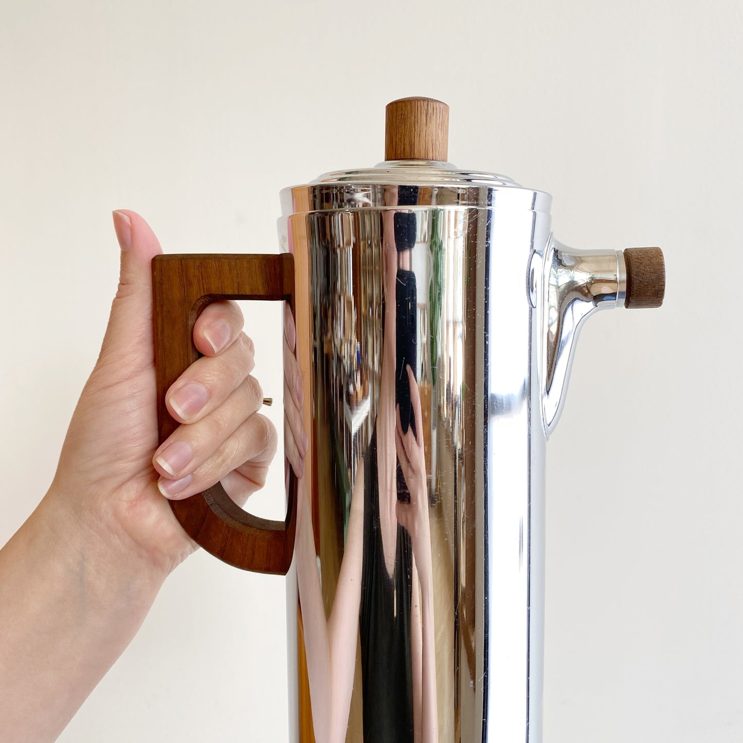 Fantastic vintage polished stainless steel pitcher featuring wooden handles and sleek art deco style.