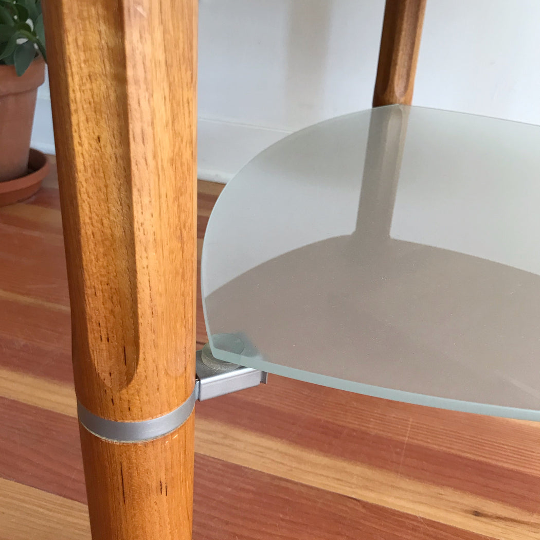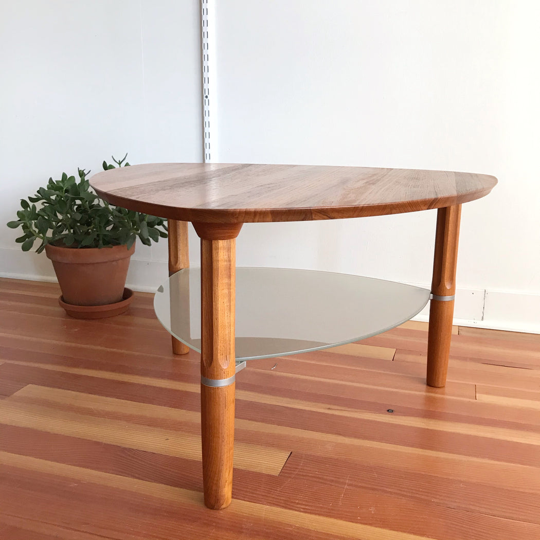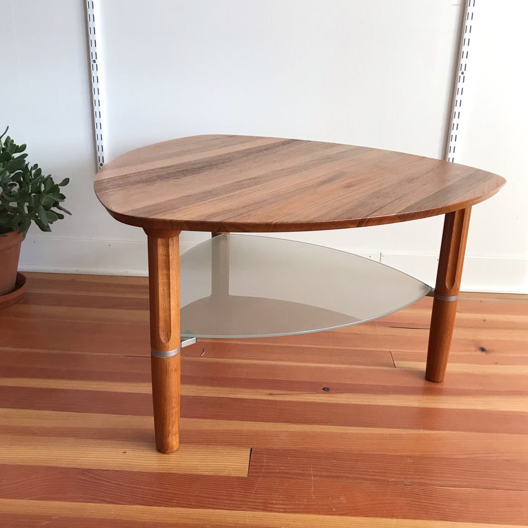 A gorgeous vintage teak side table with unique triangular shape and a floating frosted glass shelf below. The legs have a nice vertical cut details as well. It is a great piece for placing in a corner, between two chairs or sofas, or even as a petite coffee table in a smaller living space. Made in Denmark.