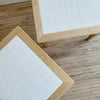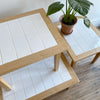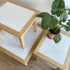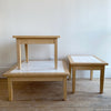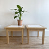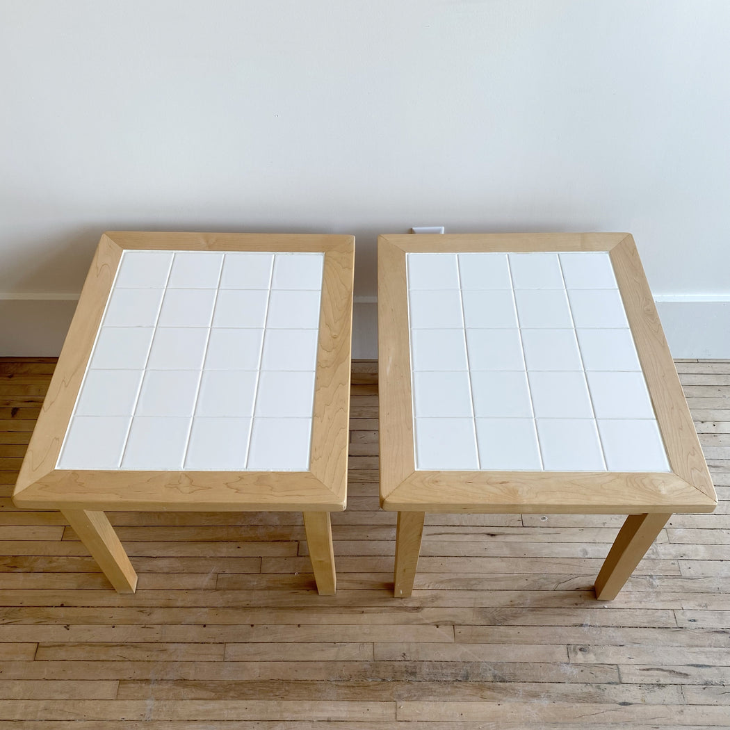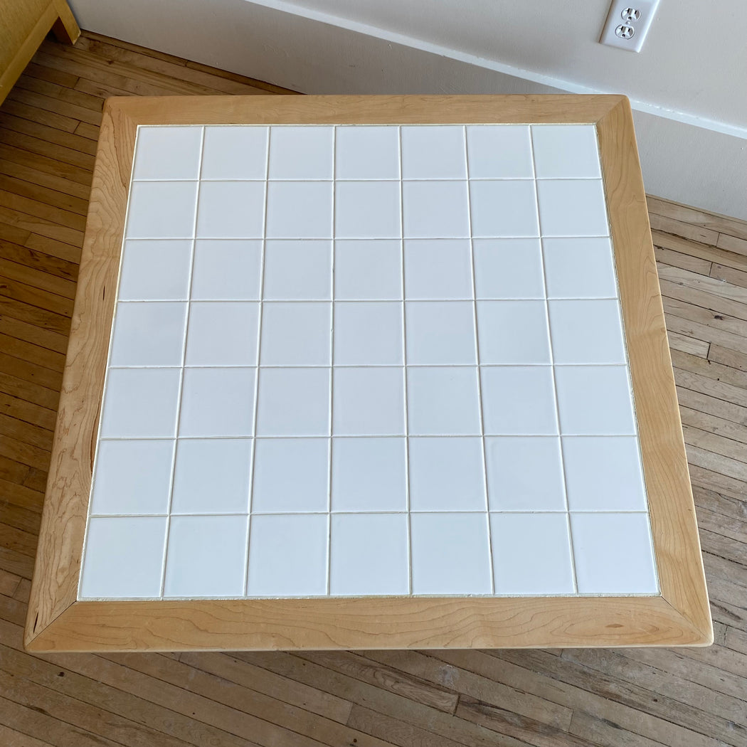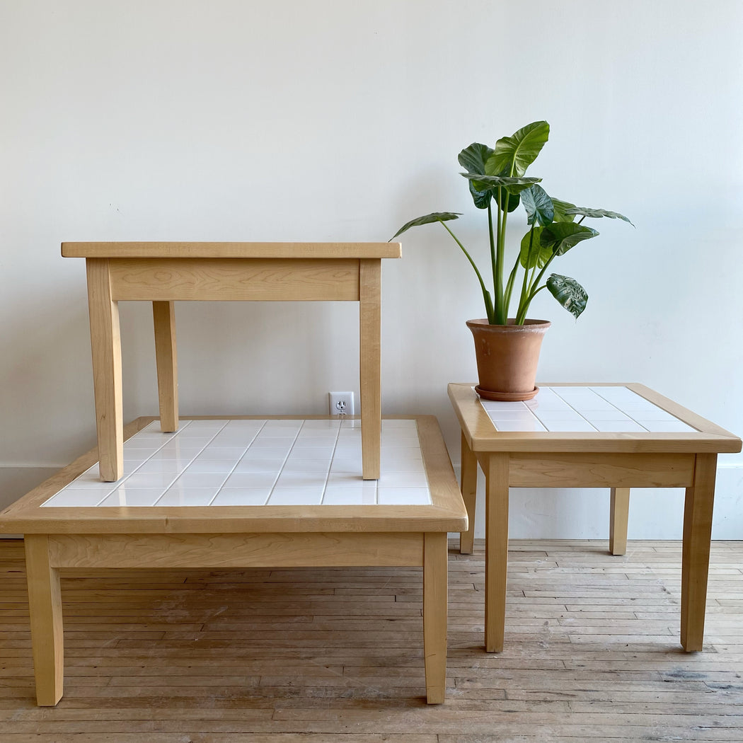 Clean, simple, and contemporary/modern, these living room tables are sure to brighten any room. They are constructed of solid maple frames and legs, and have glossy white tiles on top in a grid pattern.