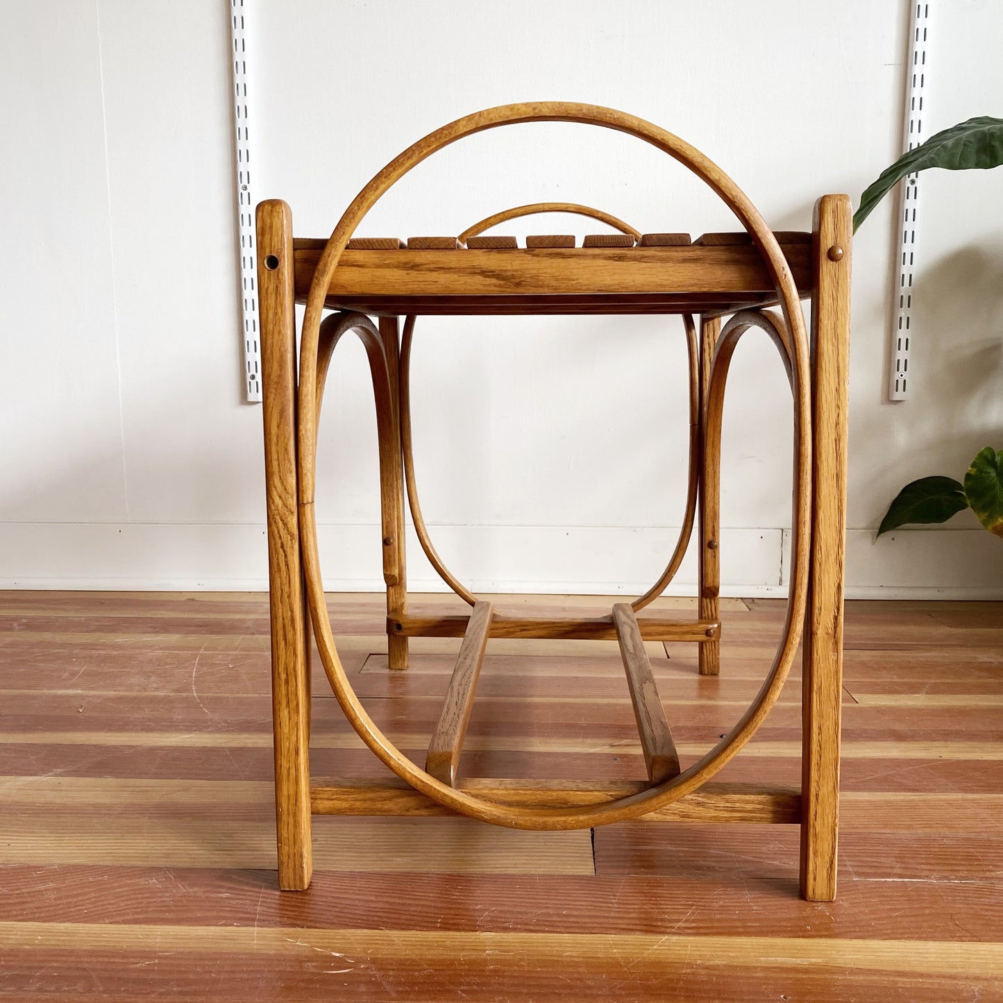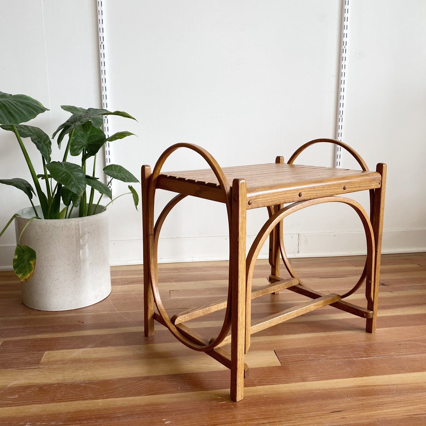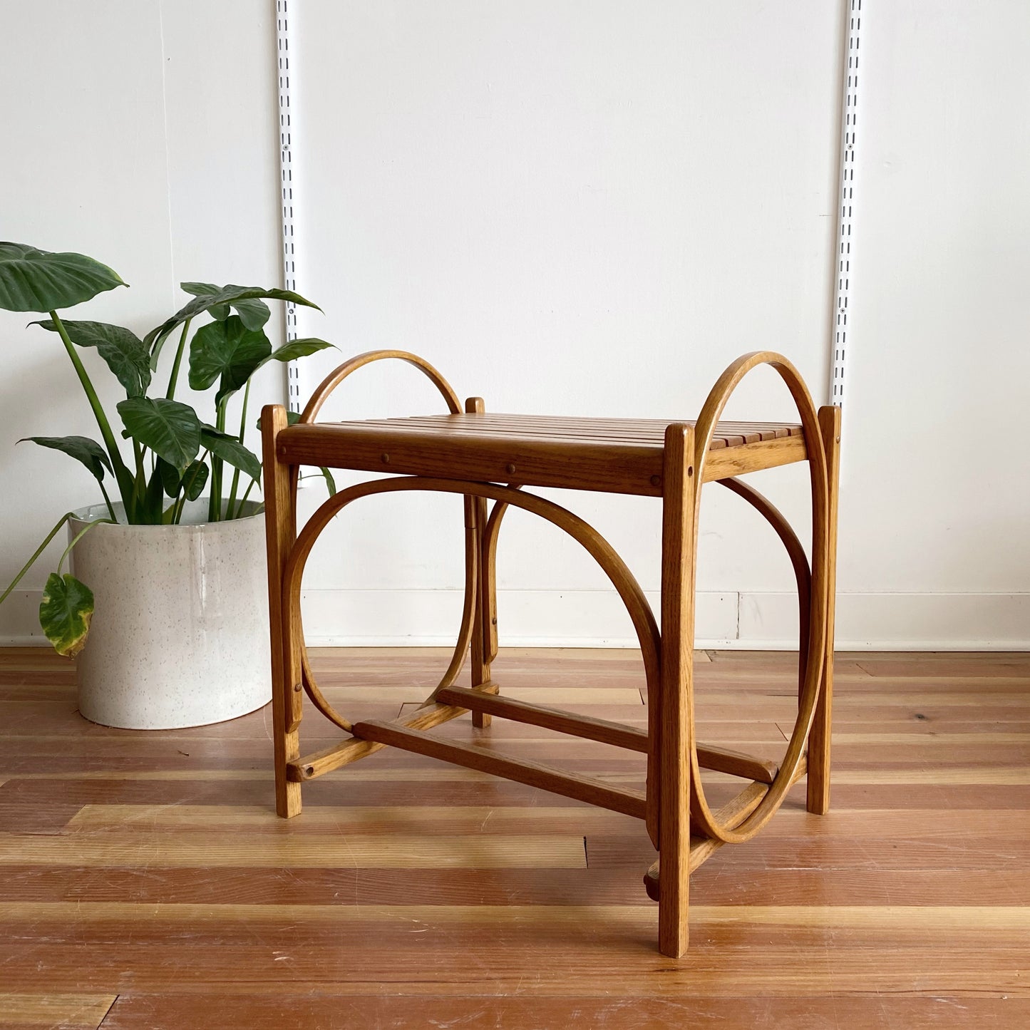 A beautiful, multi-purpose vintage wooden bench/ side table/ plant stand! We love the bentwood details and slat top! It is a super sturdy piece!