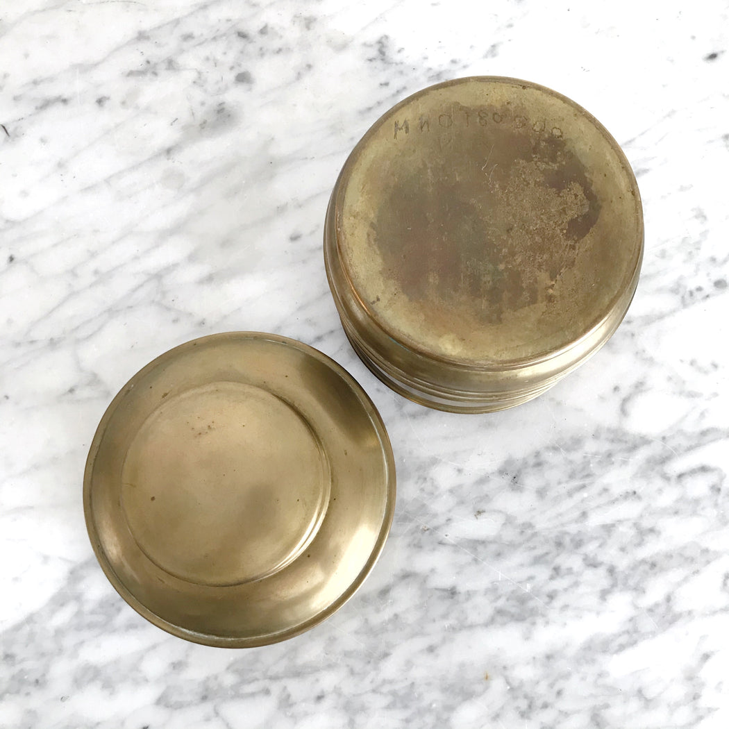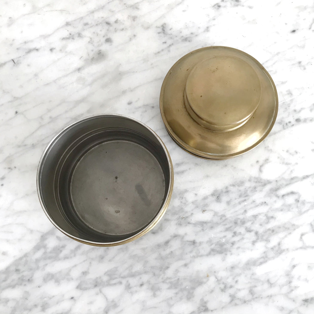 This vintage brass lidded container is the perfect size for storing a variety of household items you want to keep beautifully handy.