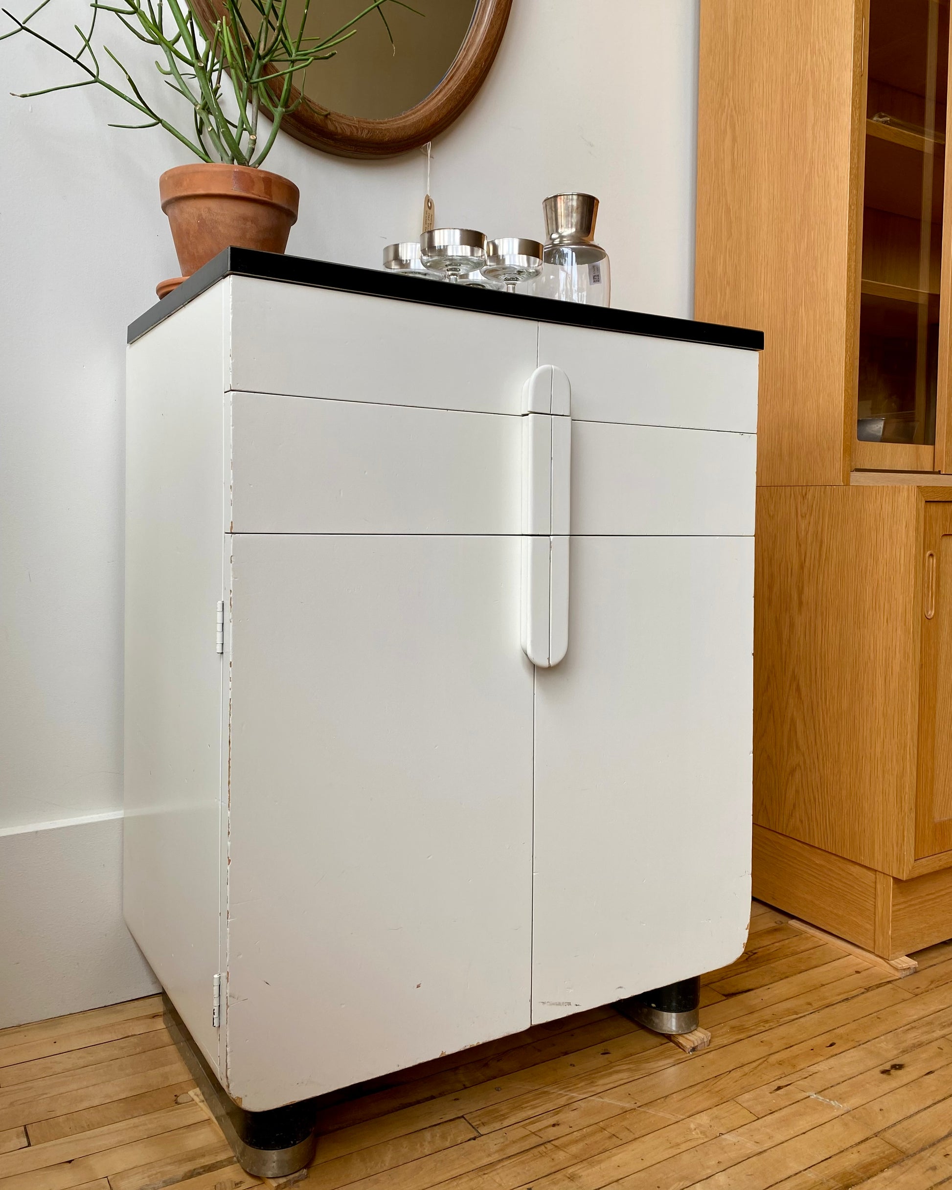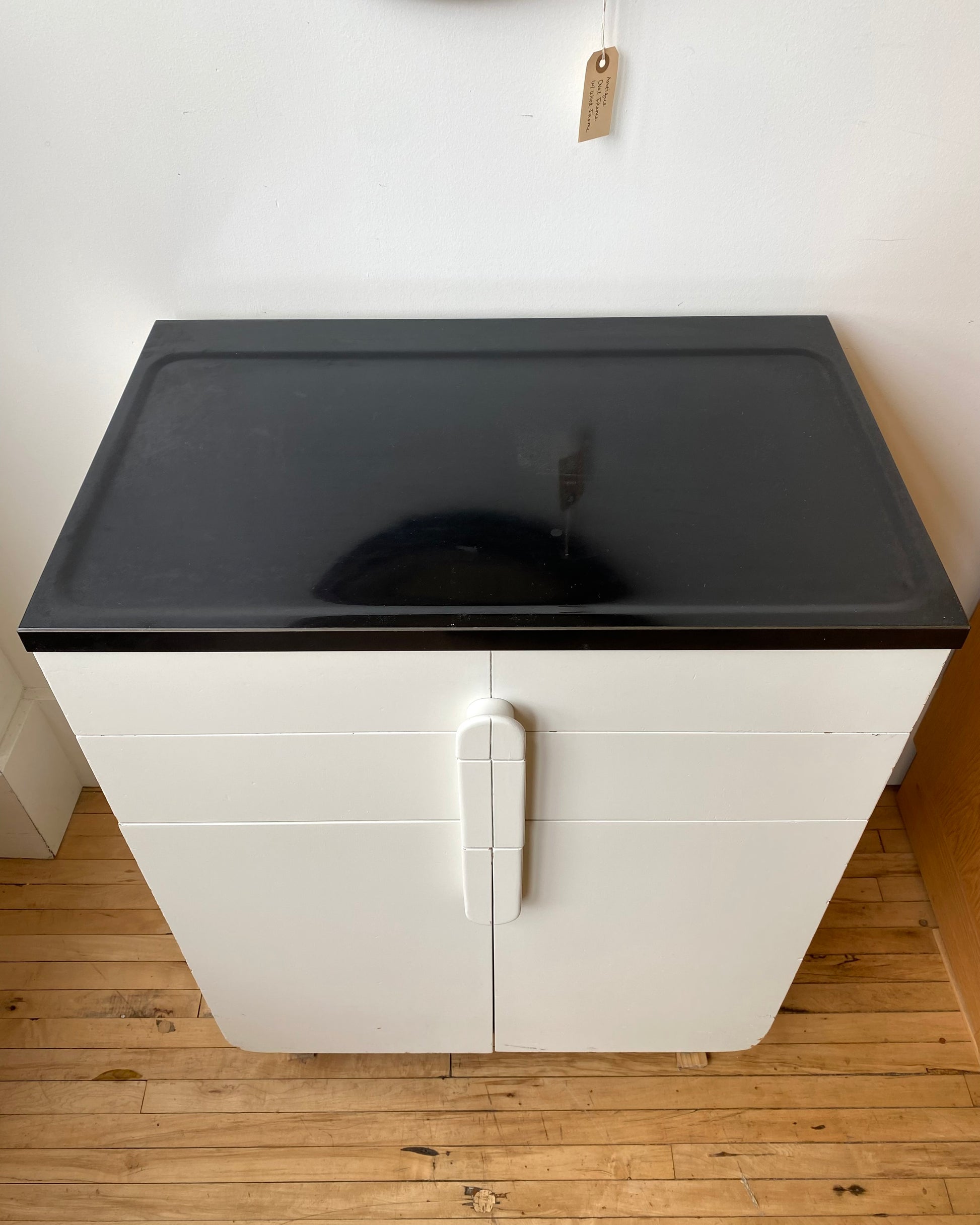Fantastic multi-use vintage cabinet by Hamilton! It features fantastic vintage modern design with rounded handles, which mimic the base/feet. It is a solid wood body with white enamel paint, there are two drawers on the top, and two doors on the bottom and narrow shelf on the interior. The black metal top is nice and durable.