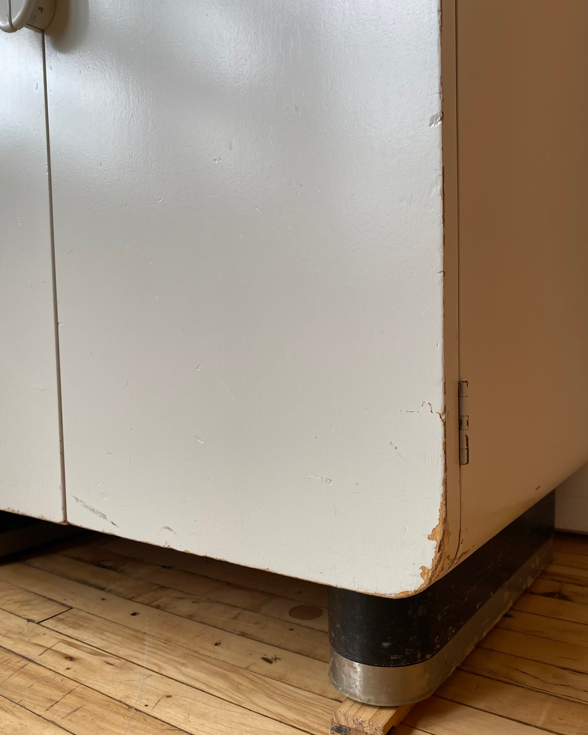 Condition: This is a vintage piece with visible wear consistent with age/use. There are marks on the top and body, including some chips in the paint in small areas. The feet also show scuffs/wear. It originally had a back panel piece that stuck up from the back, but it has been removed.