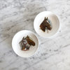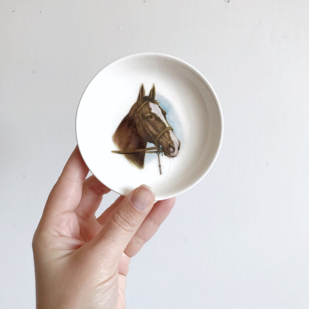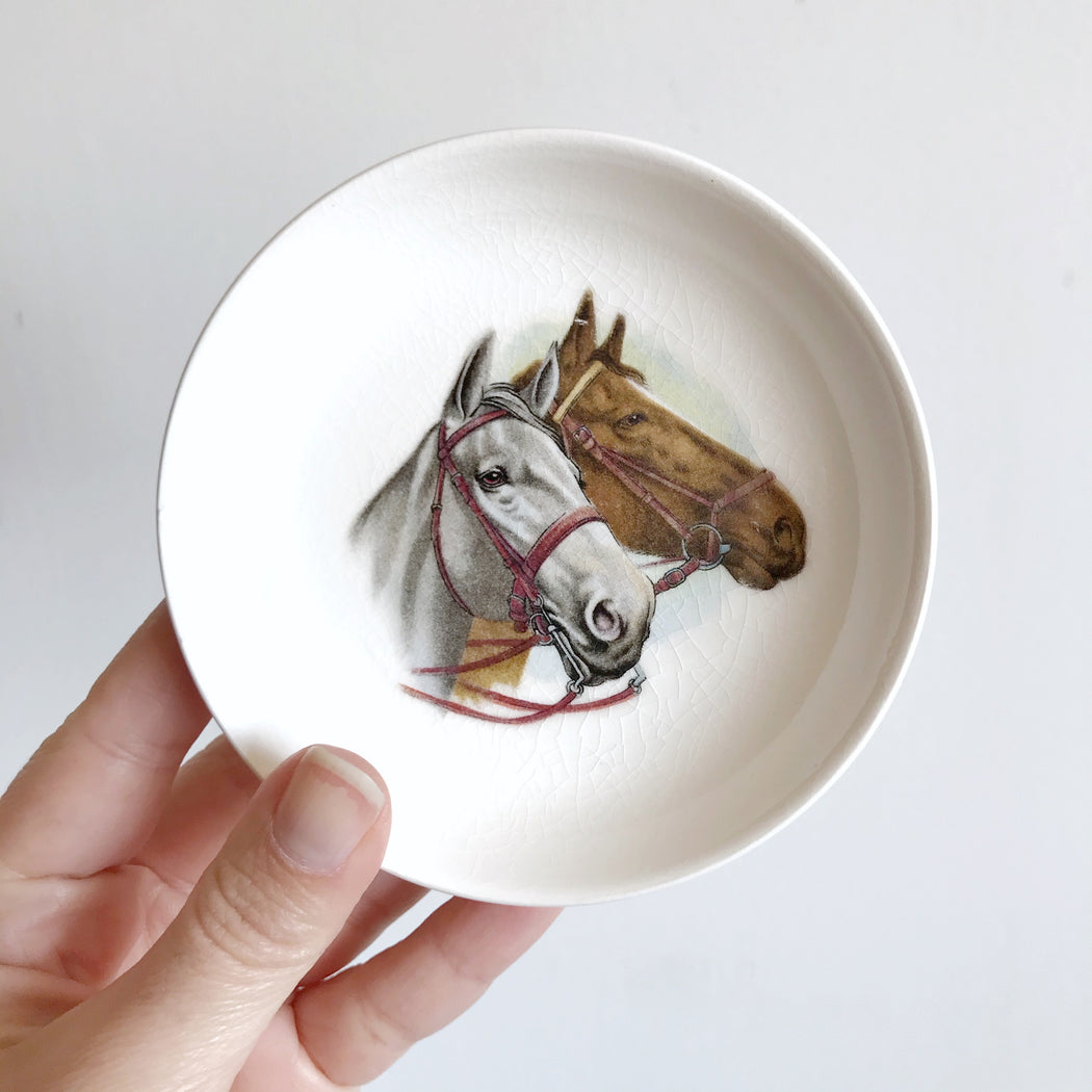 Pretty pair of small vintage dishes with horses! Use them to organize jewelry, keys, or even as coasters! Marked, “Japan”.