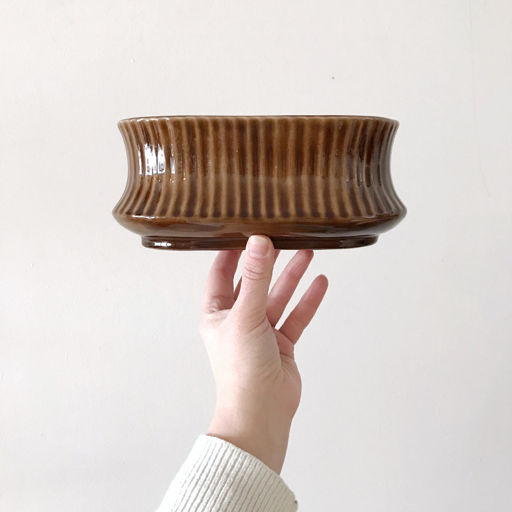 Small vintage ceramic planter with reeded / ribbed texture and warm brown glaze.