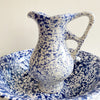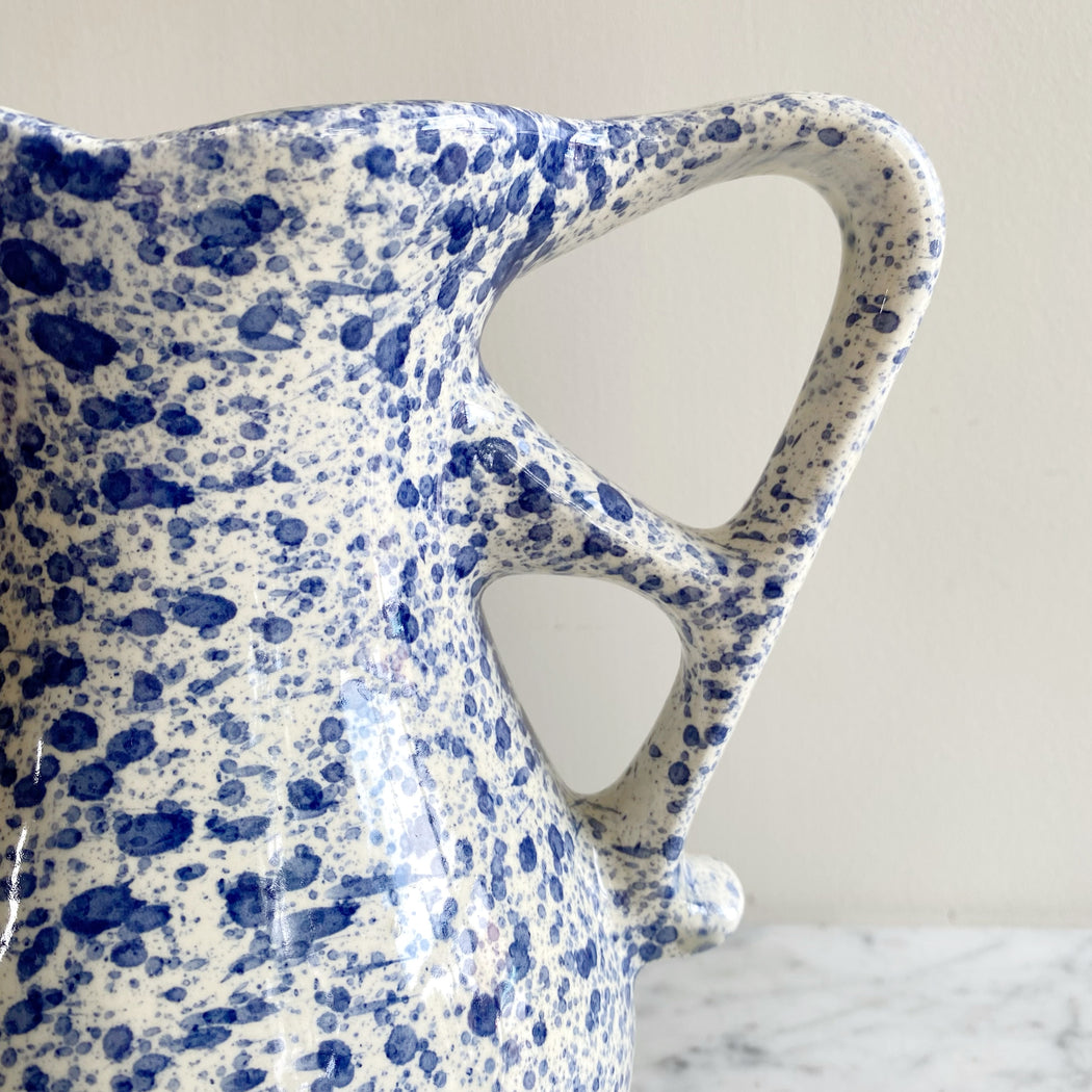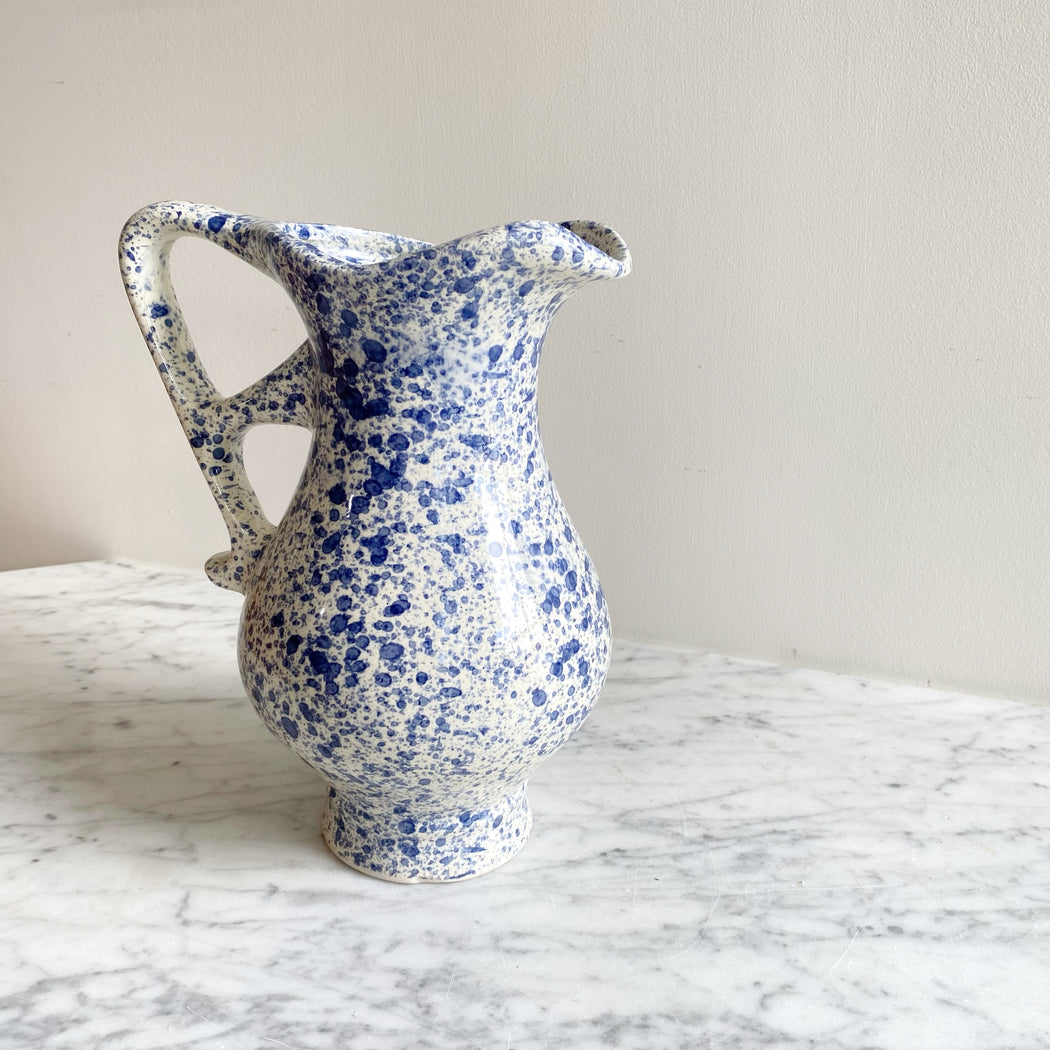 Beautiful found white ceramic pitcher with blue splatter design. A lovely way to add interest and texture to any table setting!
