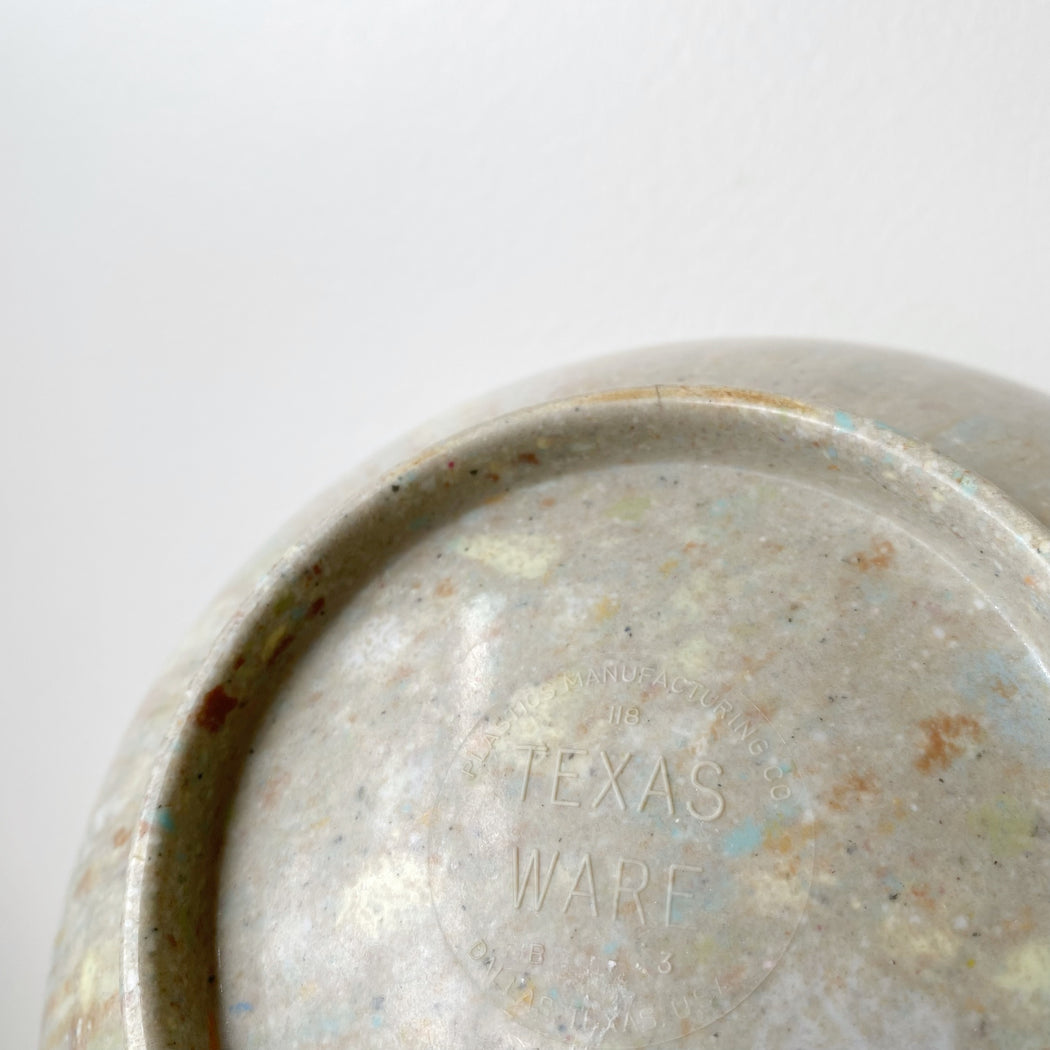 Awesome vintage Texas Ware melamine bowl with a playful multi-colored confetti pattern. Marked, “TEXAS WARE 118, PLASTICS MANUFACTURING CO., DALLAS TEXAS USA”