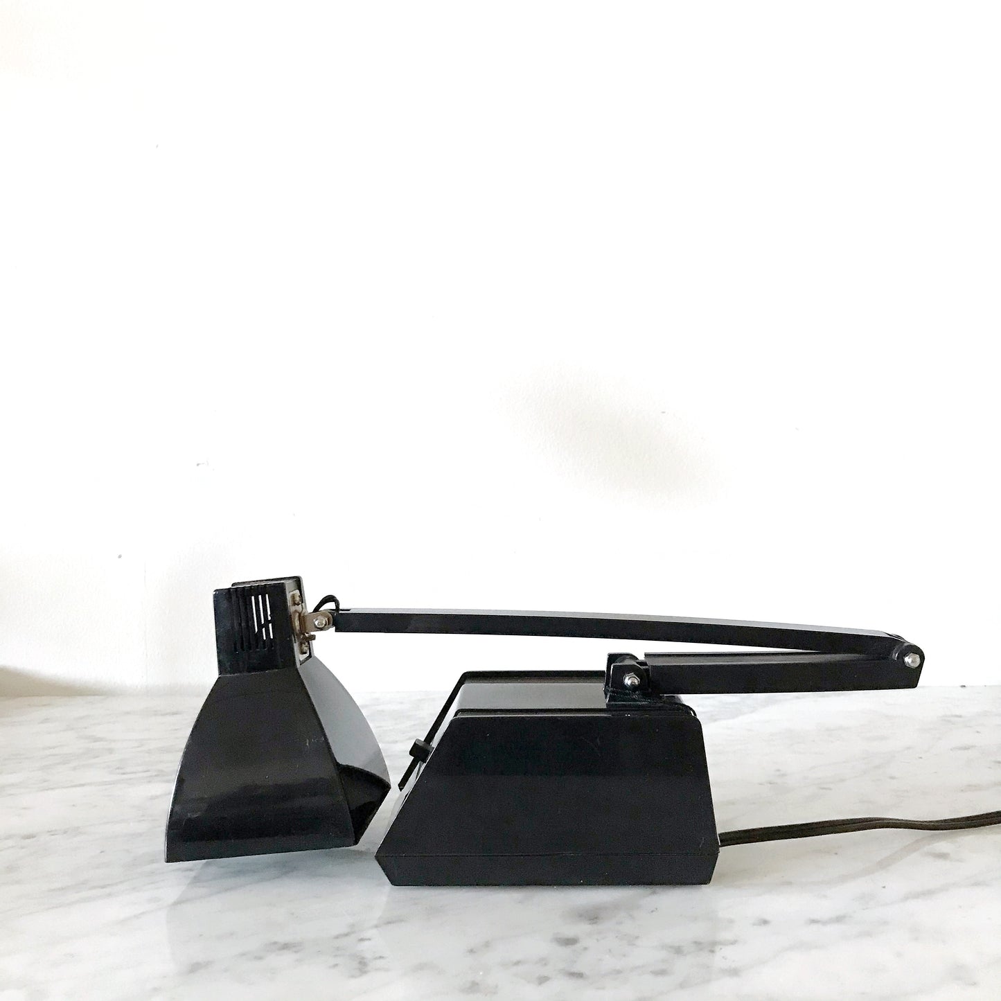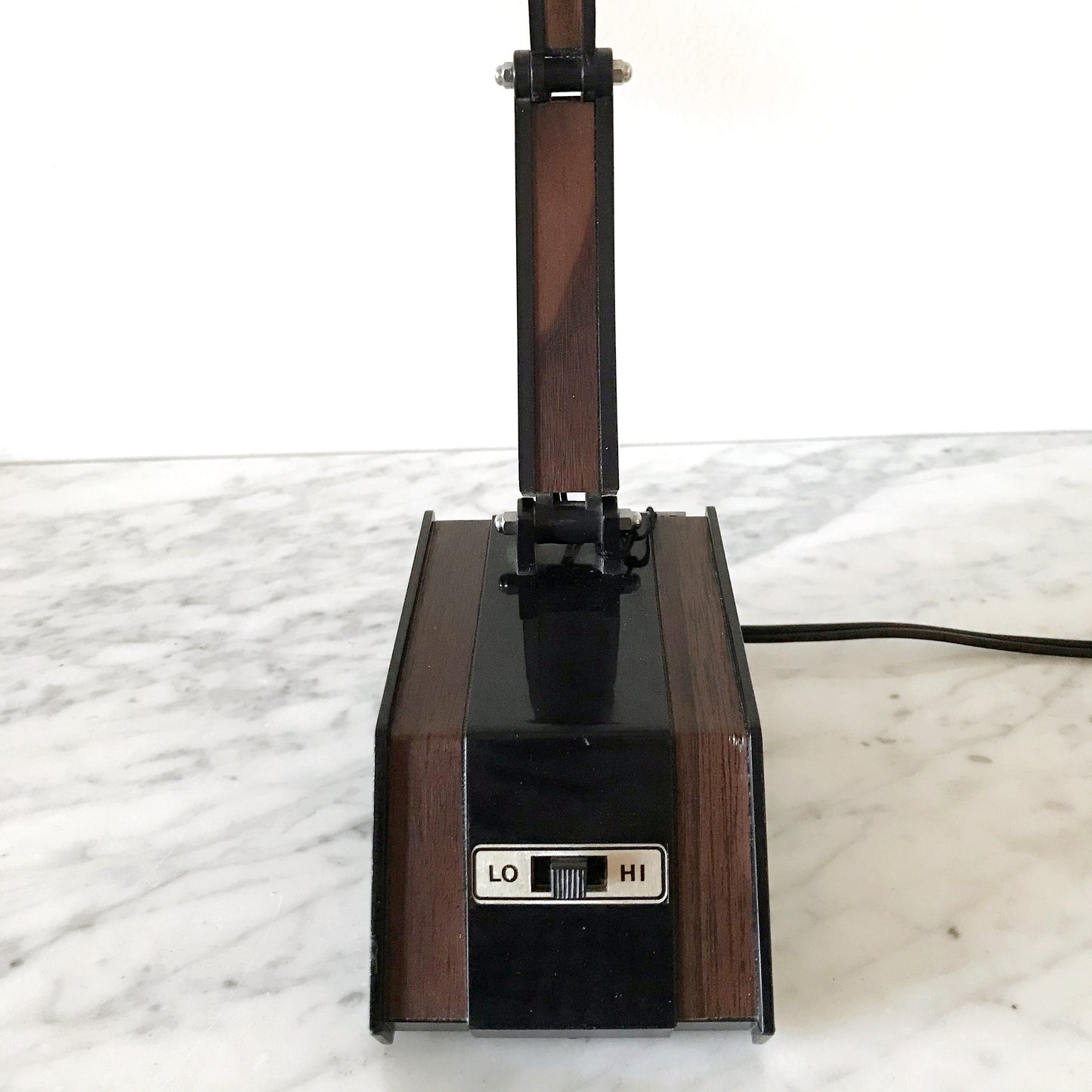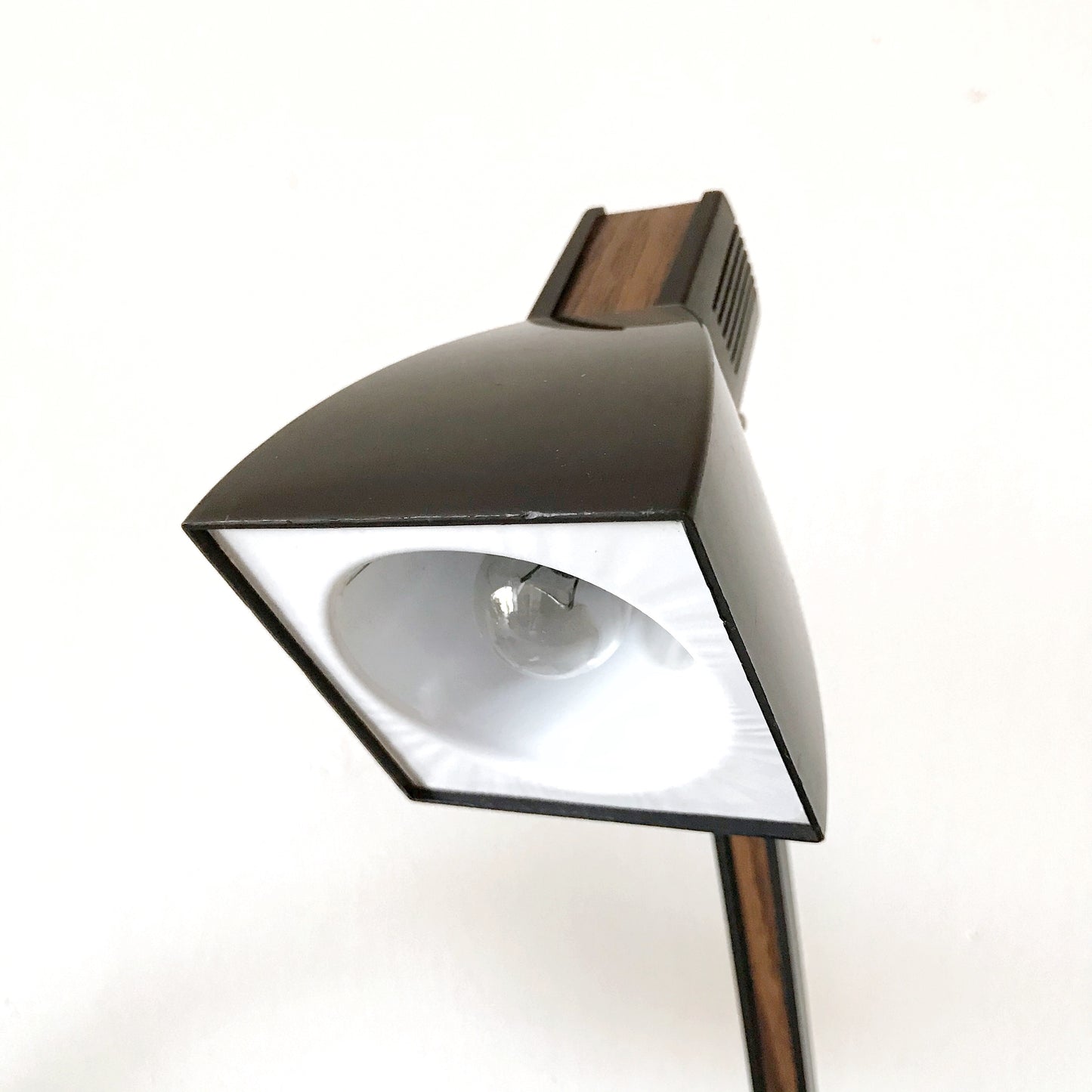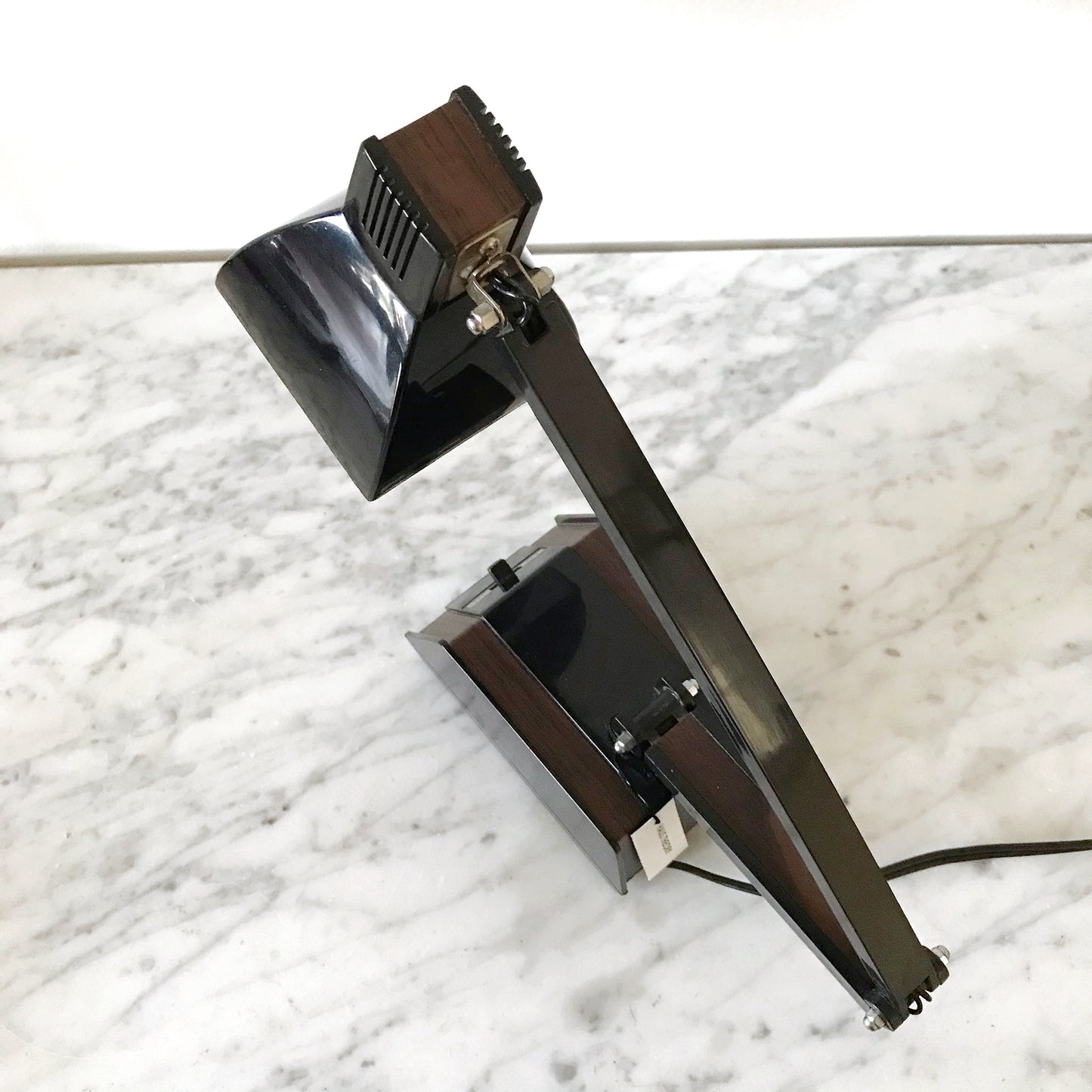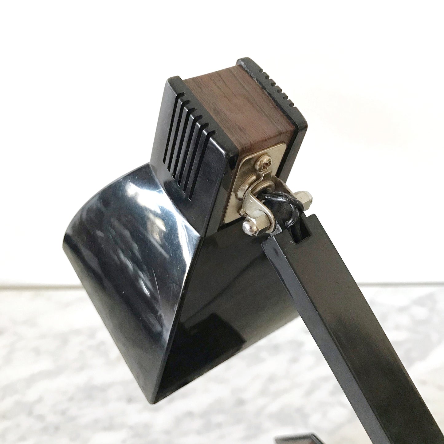 Great vintage desk lamp. Black plastic with faux wood-grain details.