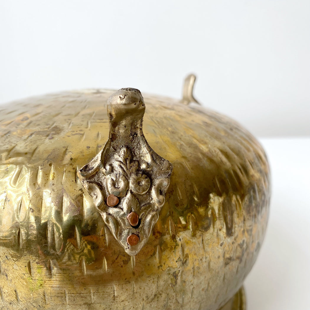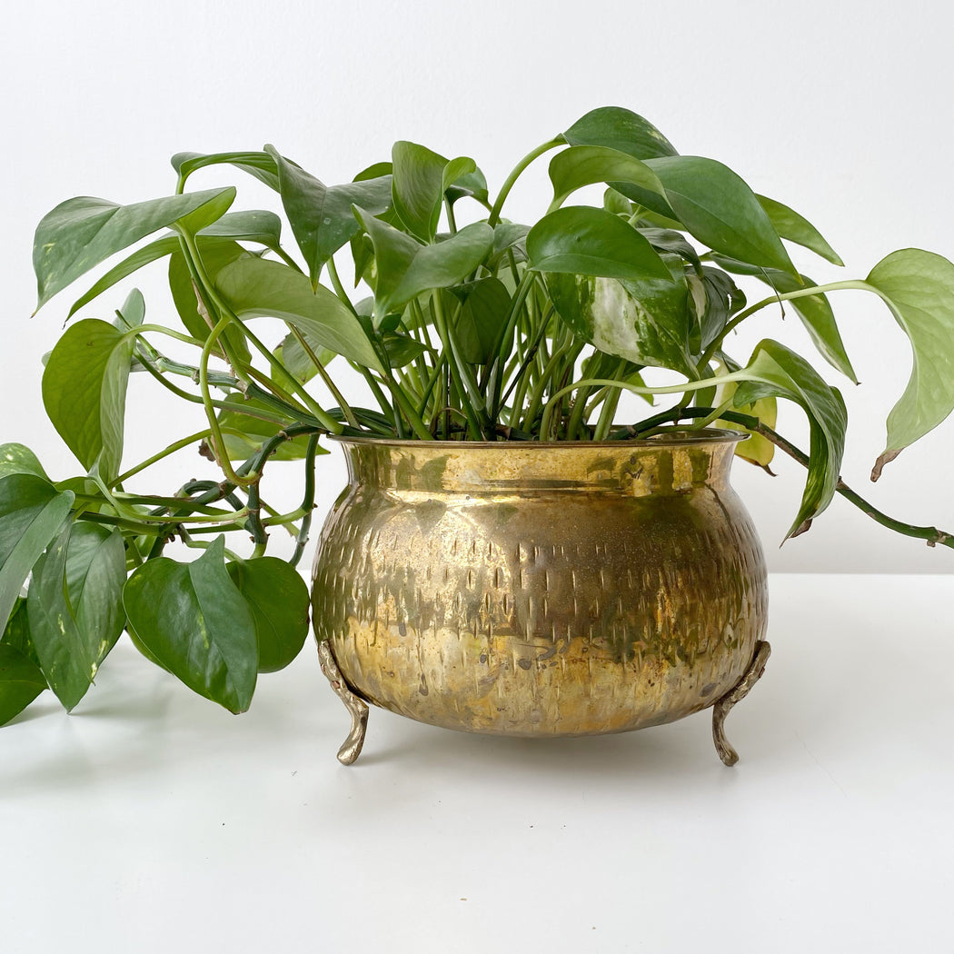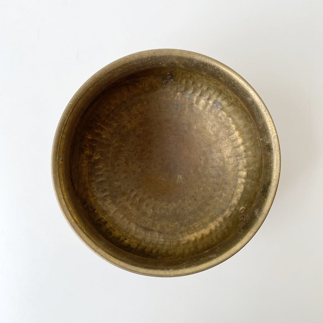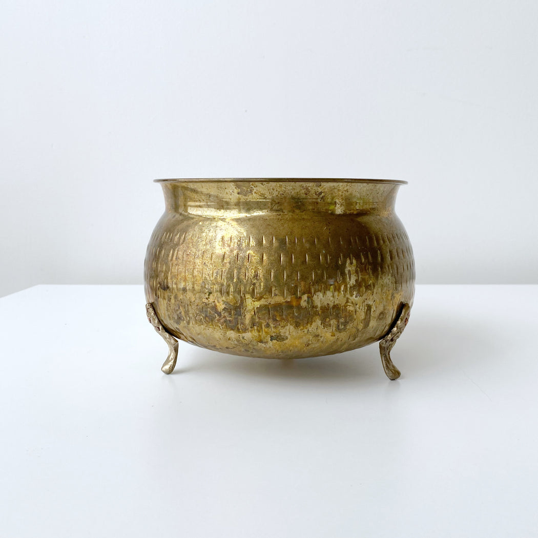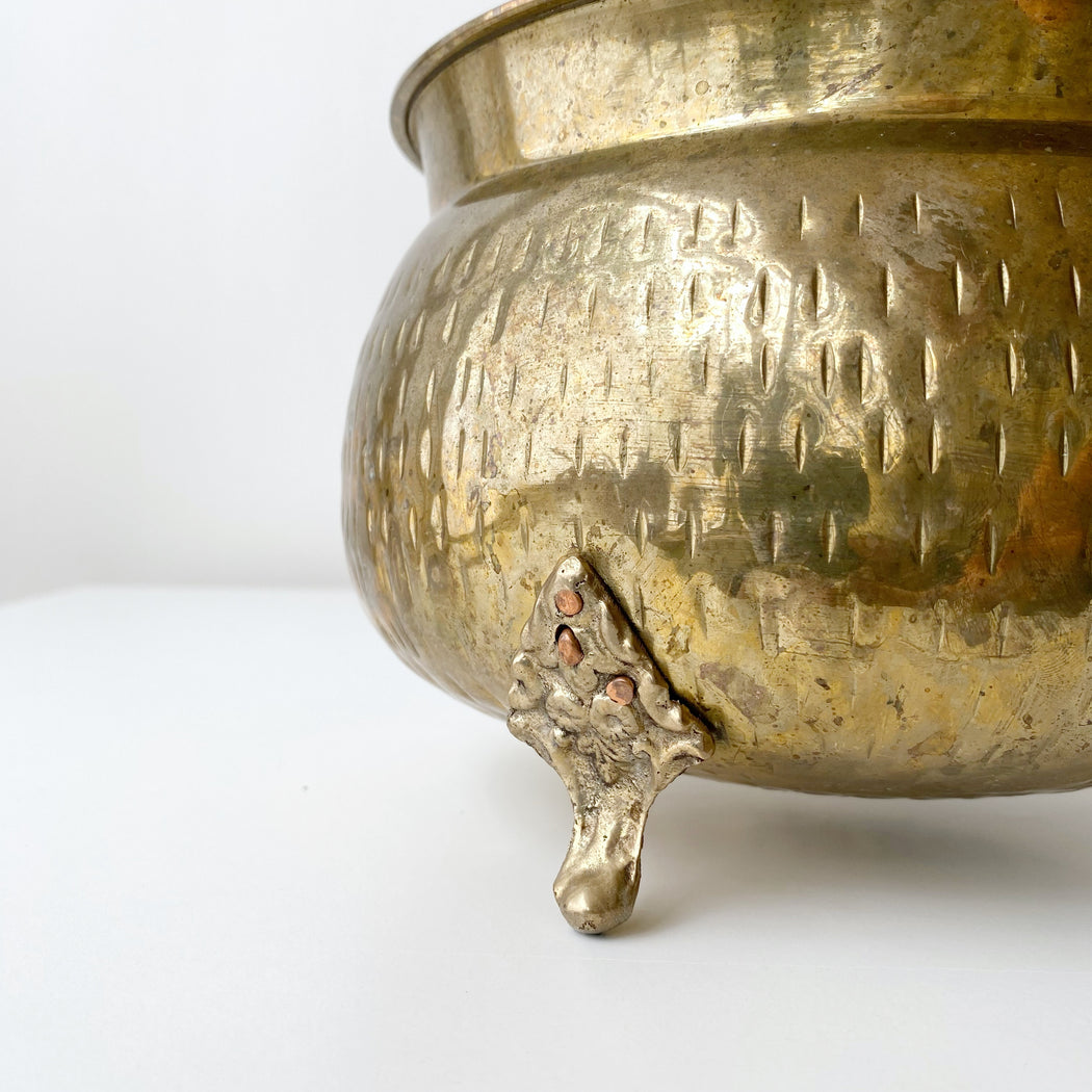 A beautiful vintage brass planter with a unique imprinted dash texture, and the sweetest feet featuring tiny flowers and copper pins on each.