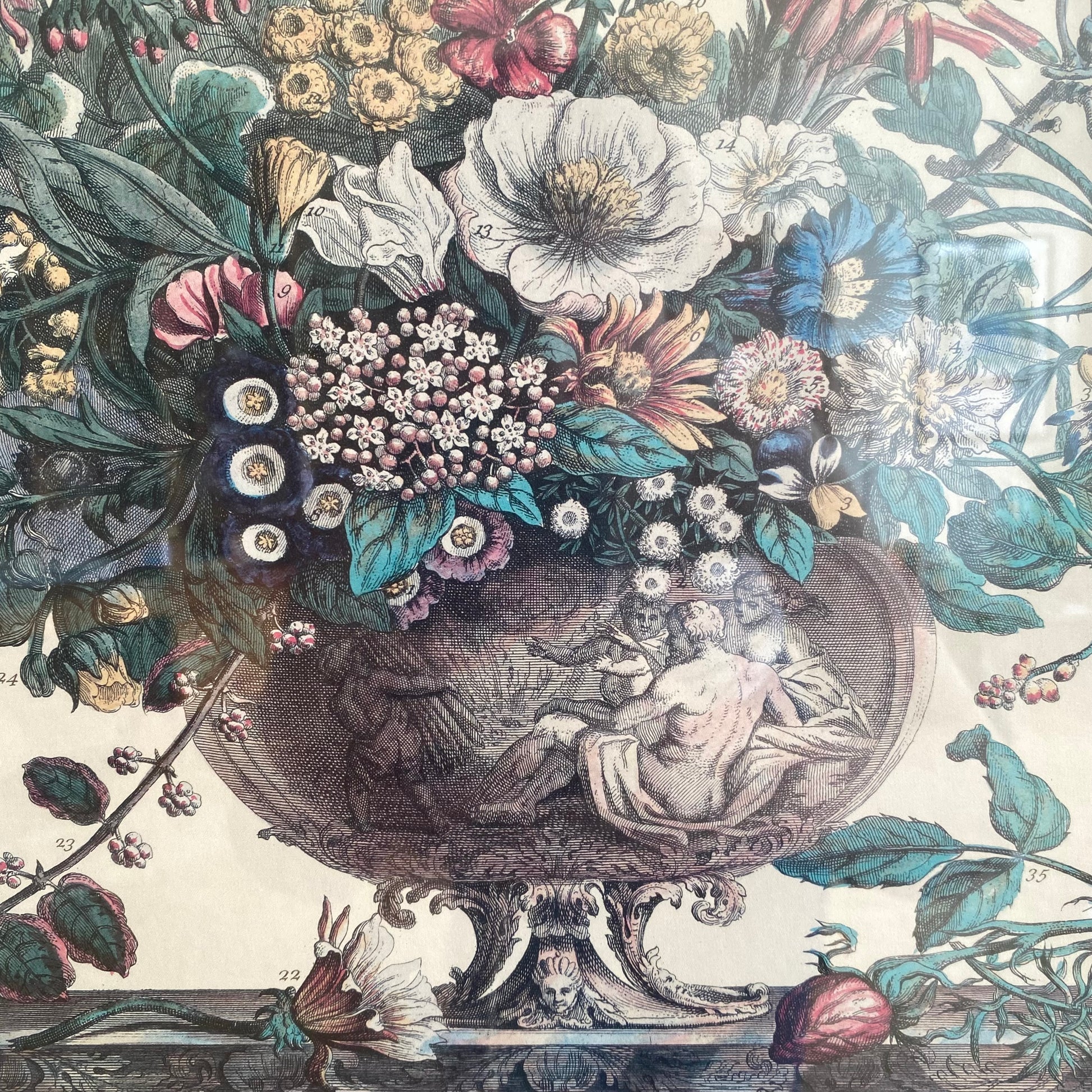 From Robert Furber's Twelve Months of Flowers, originally published in 1730. It is a detailed depiction of seasonal flowers arranged in a vase, with each flower numbered and identified in a key at the bottom of the print.
