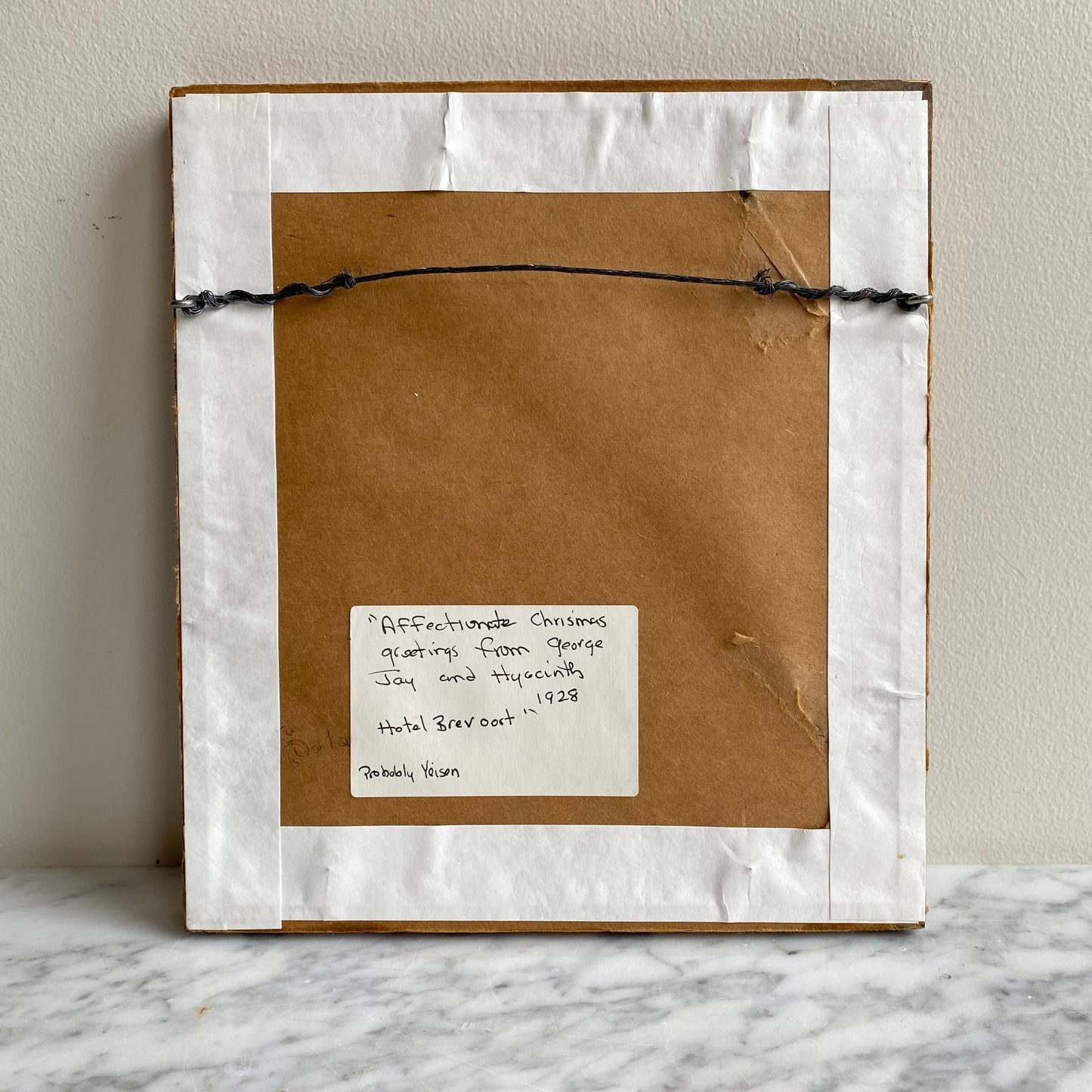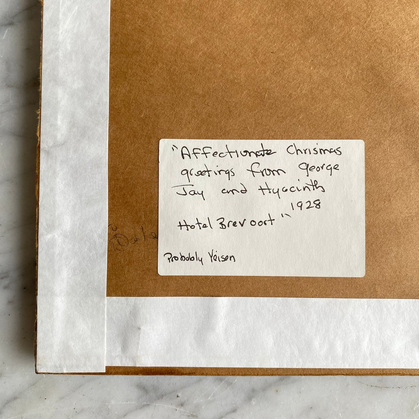 Handwritten label on the back: "Affectionate Christmas greetings from George Jay and Hyacinth 1928, Hotel Brevoort