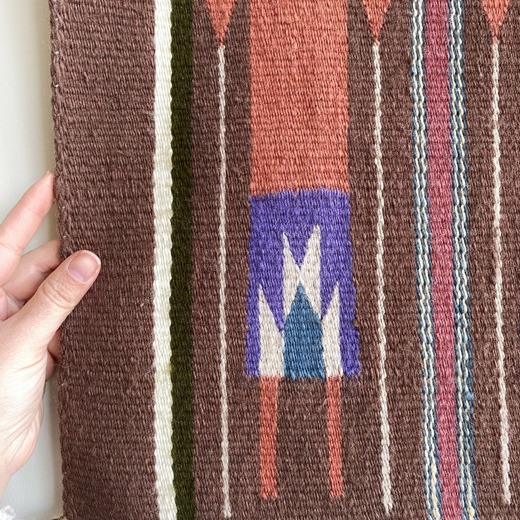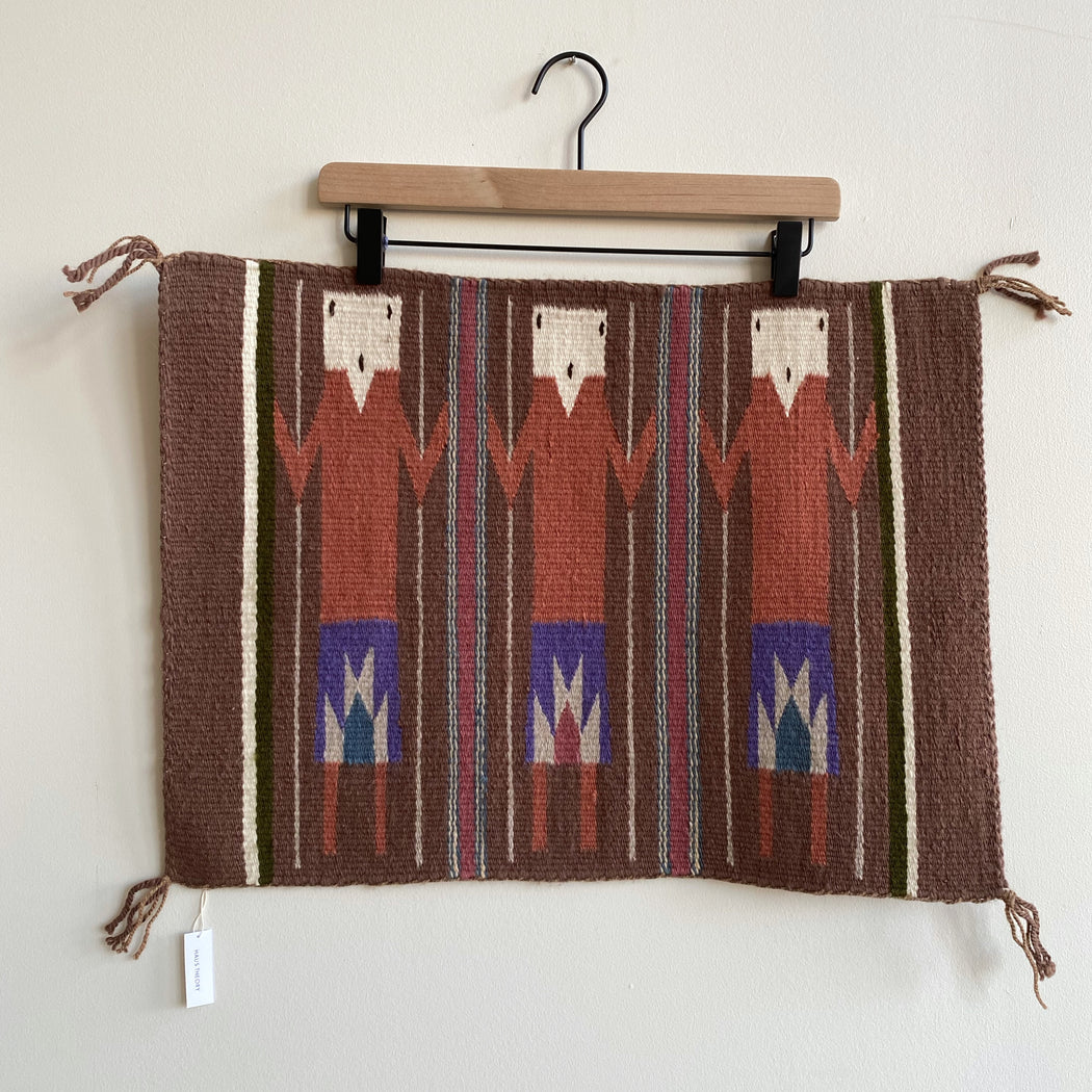 Vintage handwoven textile piece with three figures. A great way to add unique interest and texture to your wall or table!