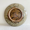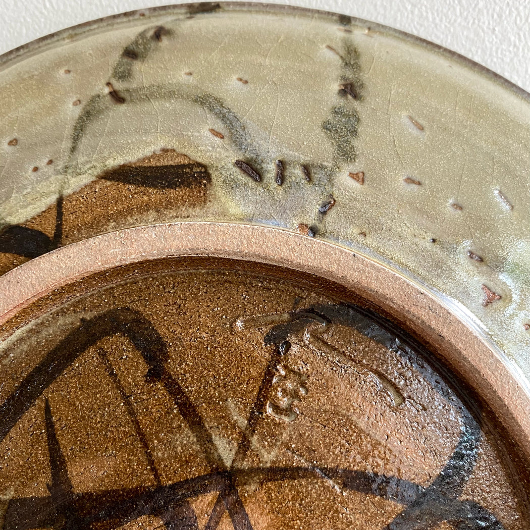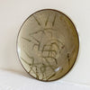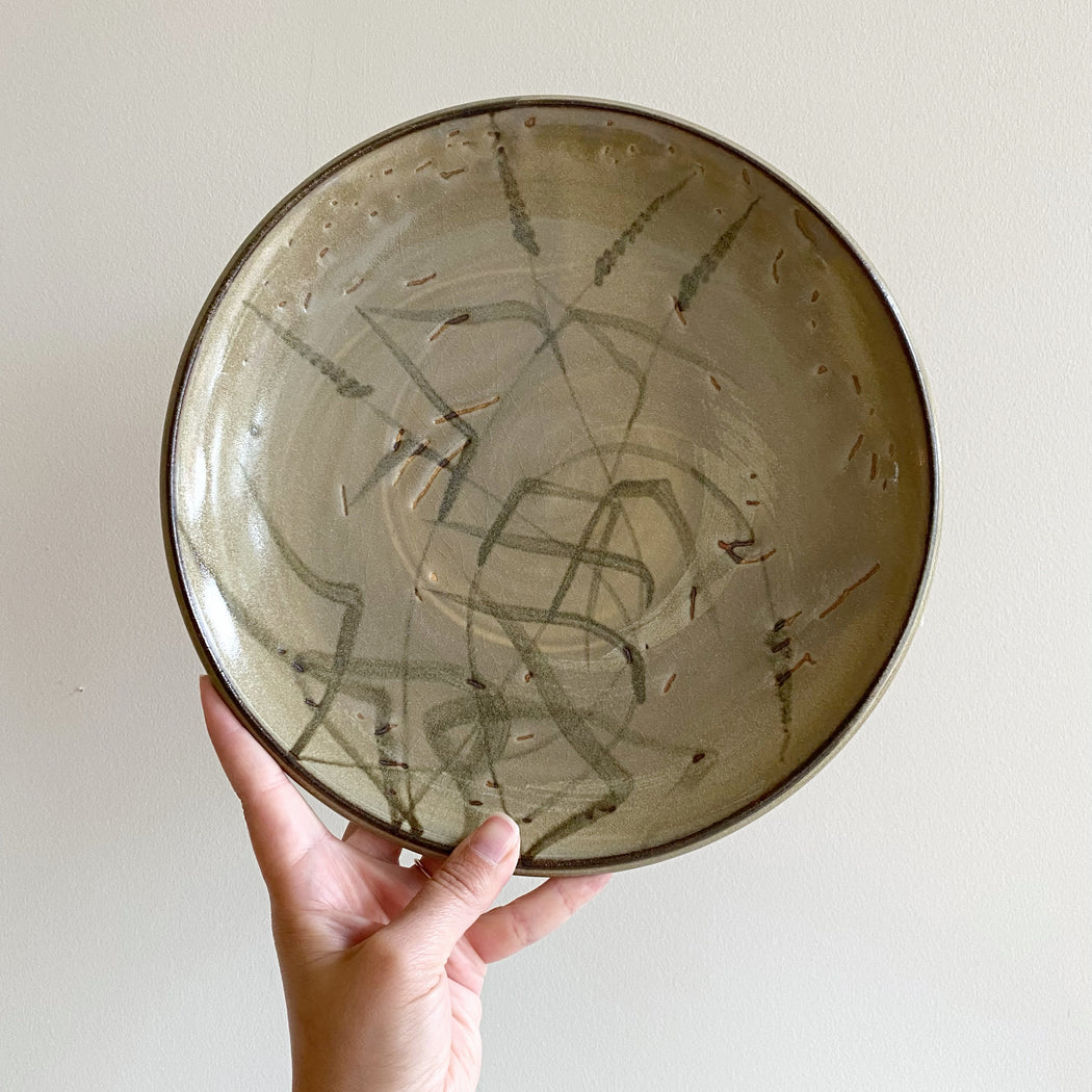 Vintage pottery plate/platter with beautiful hand-painted grass designs on the front and back. It would look beautiful displayed alone on any table, resting on top of a large stack of art books on the coffee table, or even hung on the wall.
