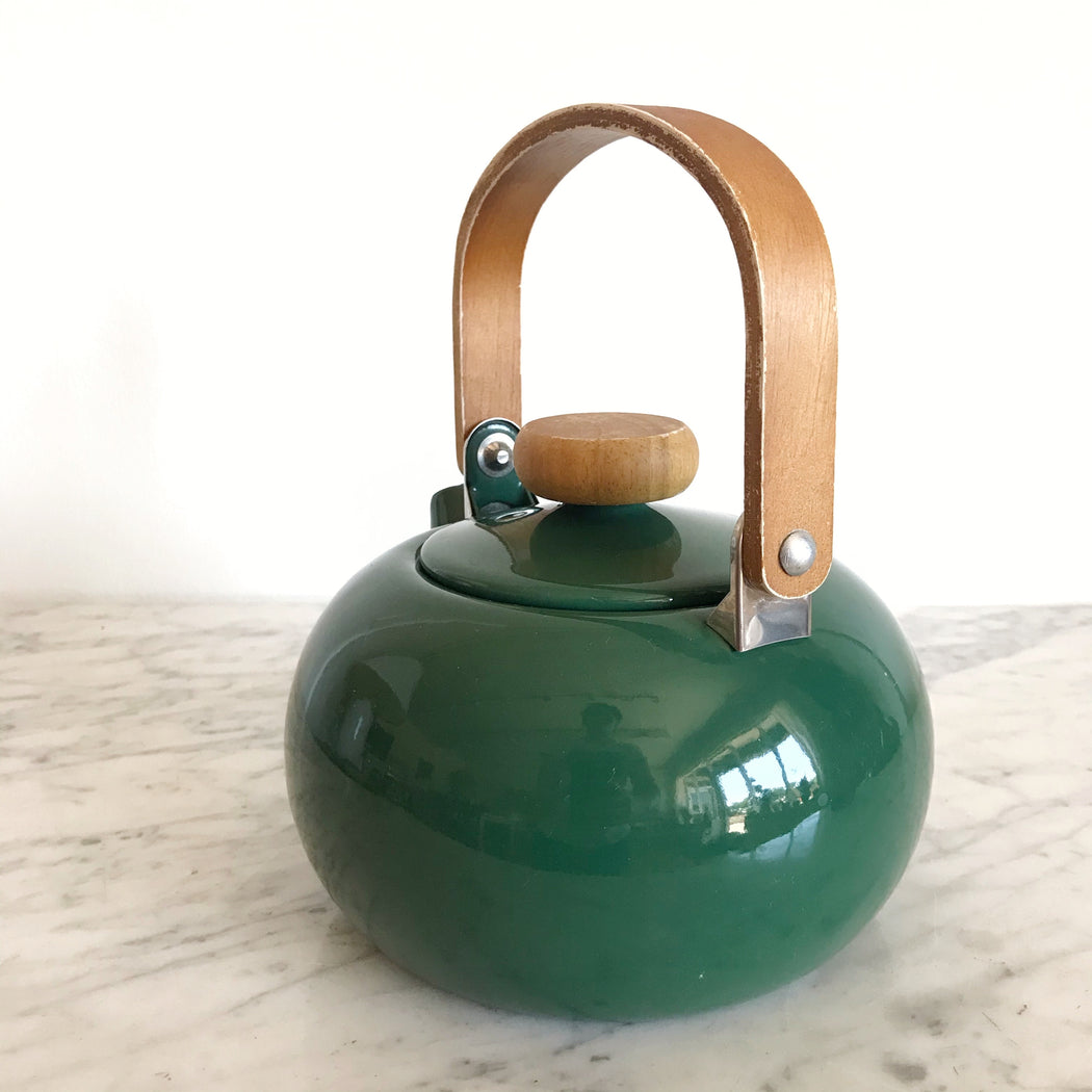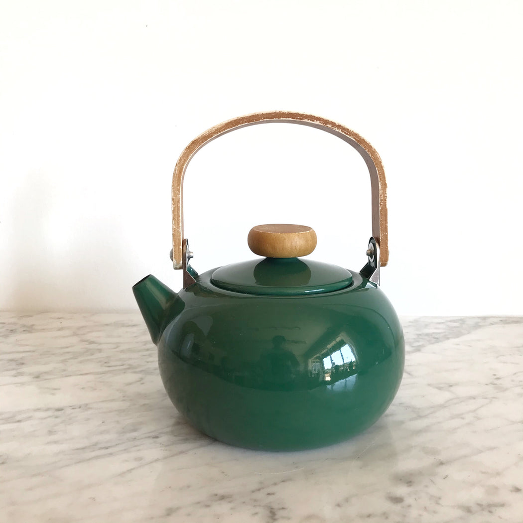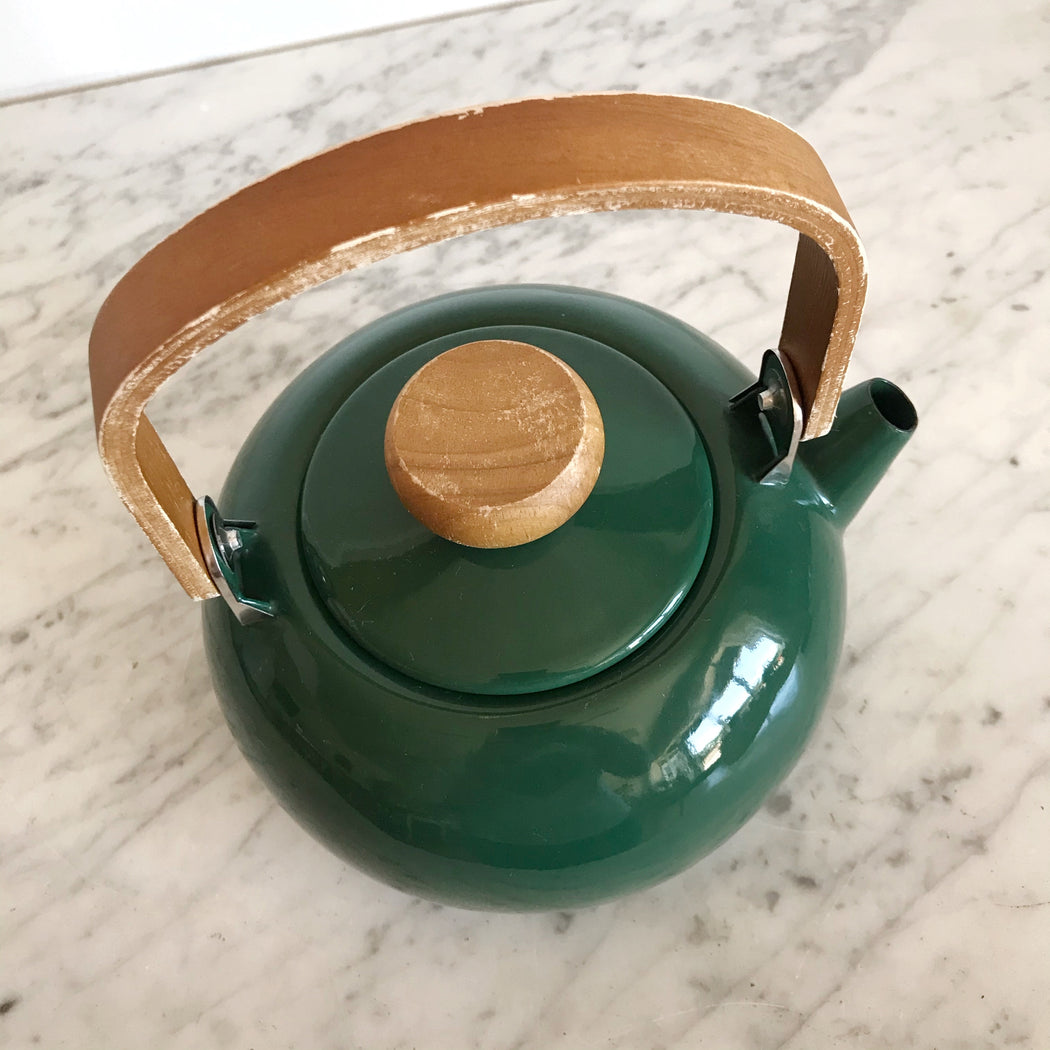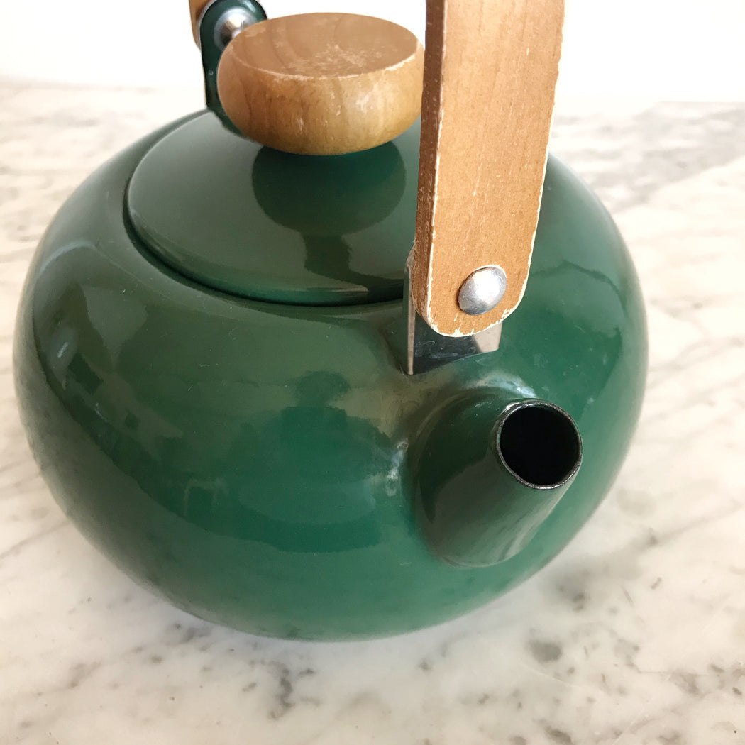 Vintage green enamel kettle for making your favorite cozy time teas!