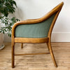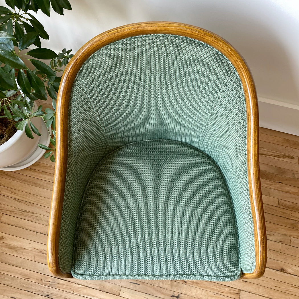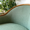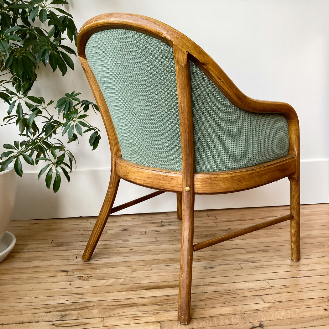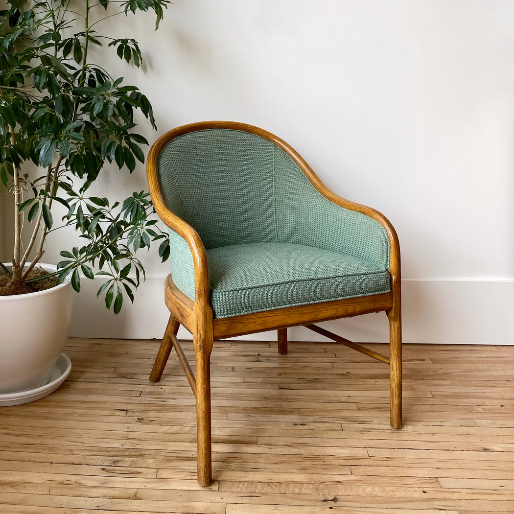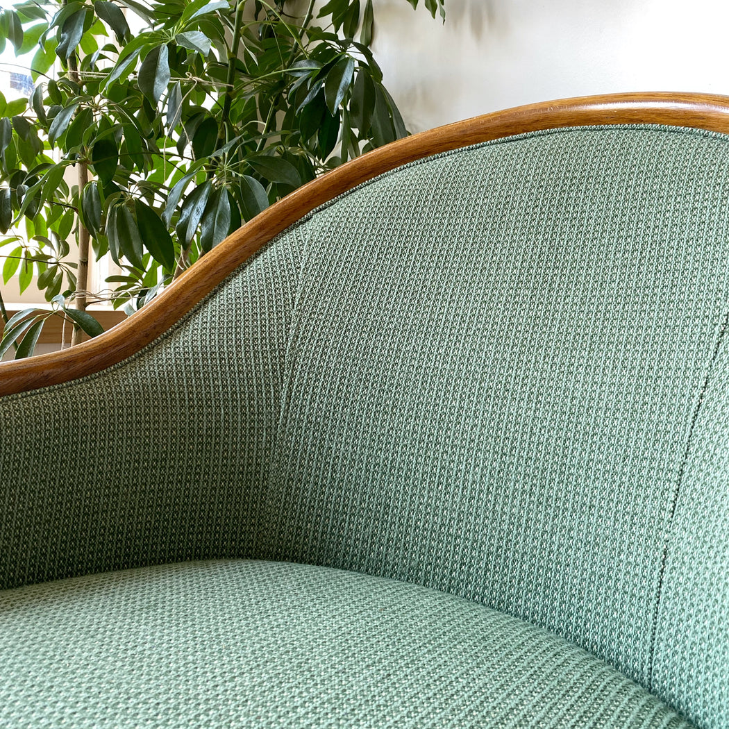 This vintage reading chair features a beautifully curved wood frame, and patterned green fabric upholstery. We love that the back and sides are also upholstered, giving the flexibility of having it placed away from the wall.