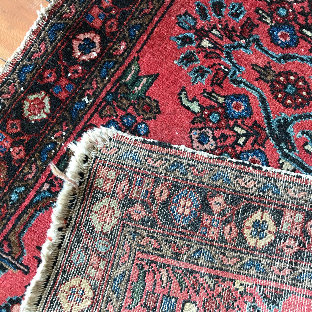 Condition: This is a vintage piece and does have visible wear to the edges and fringe. There is a slight discoloration on one corner (the raspberry color is more peachy). It has been vacuumed front and back.
