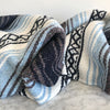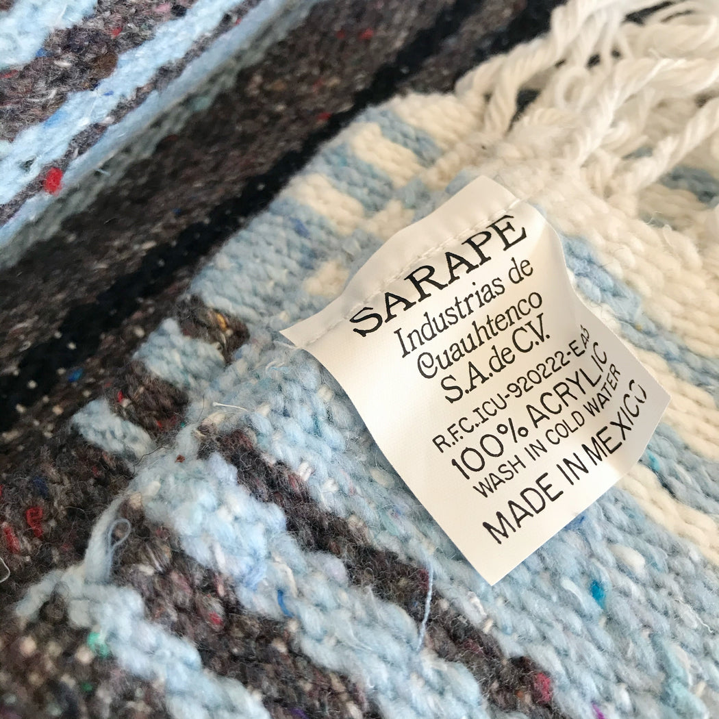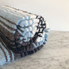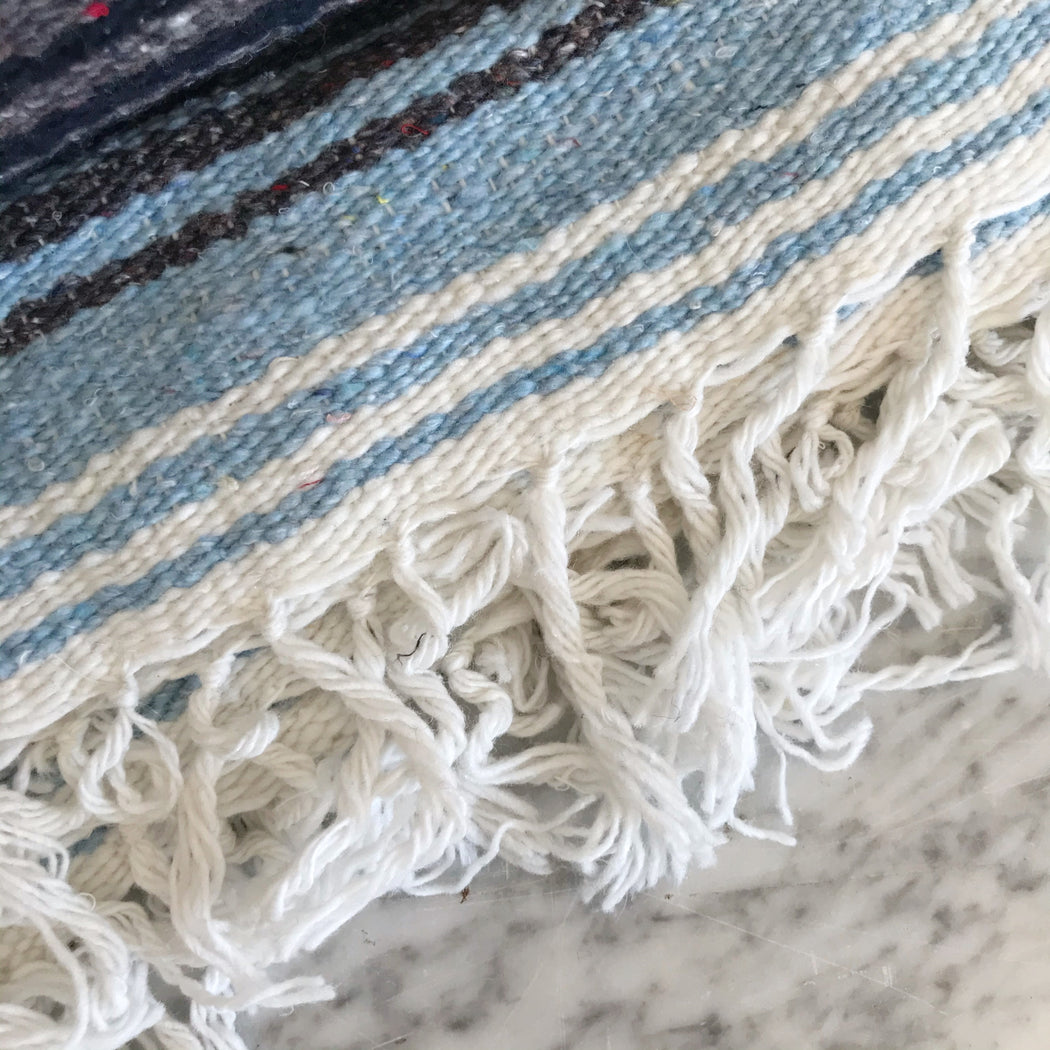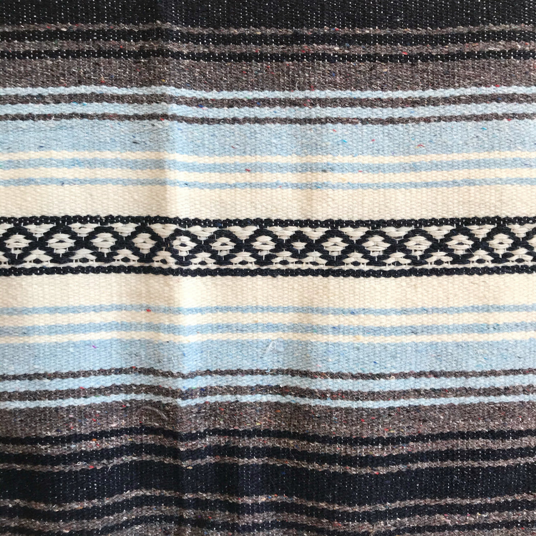 Beautiful vintage (and un-used!) hand-loomed woven blanket with black, brown, white, and light blue stripes. Use it to cozy up with or hang on the wall!