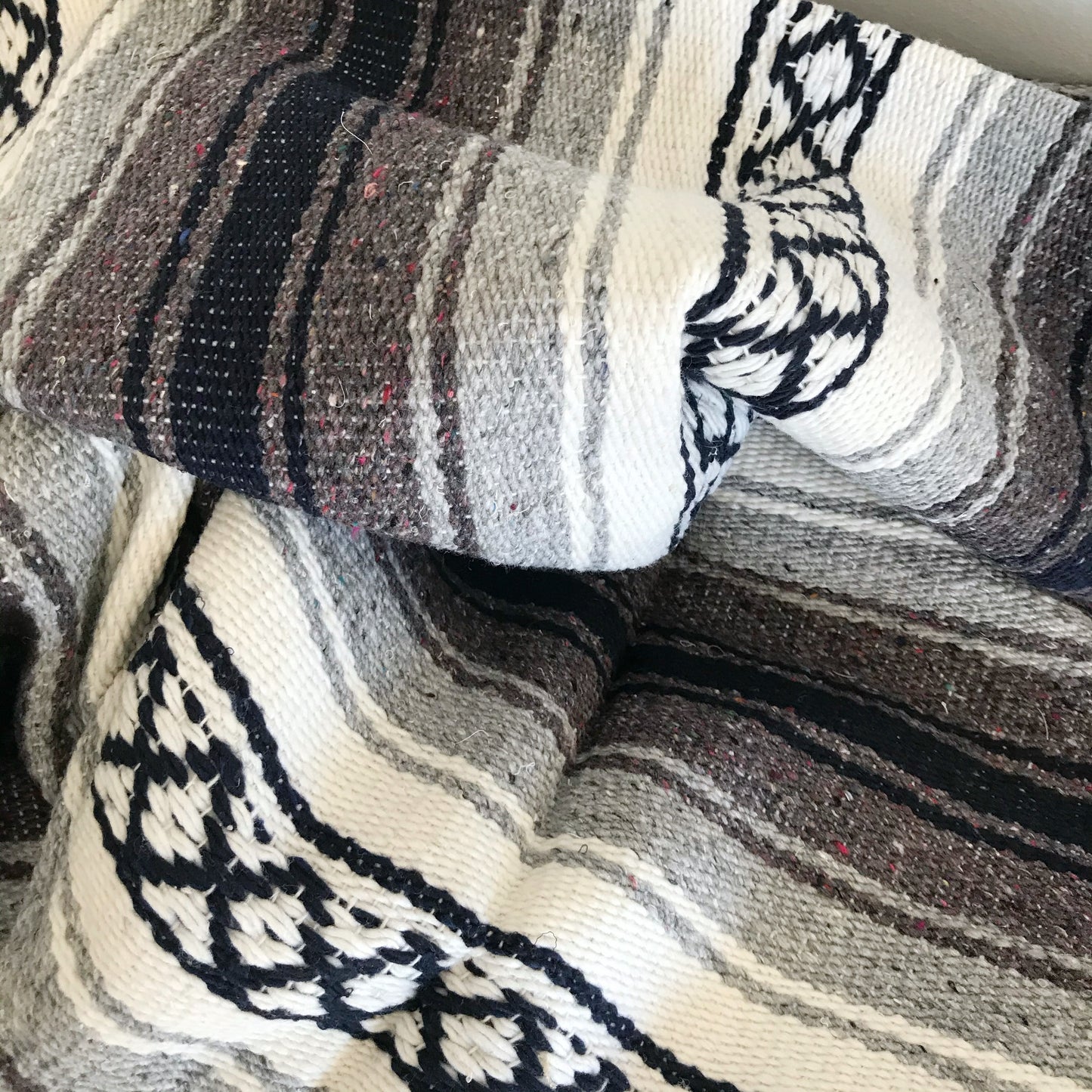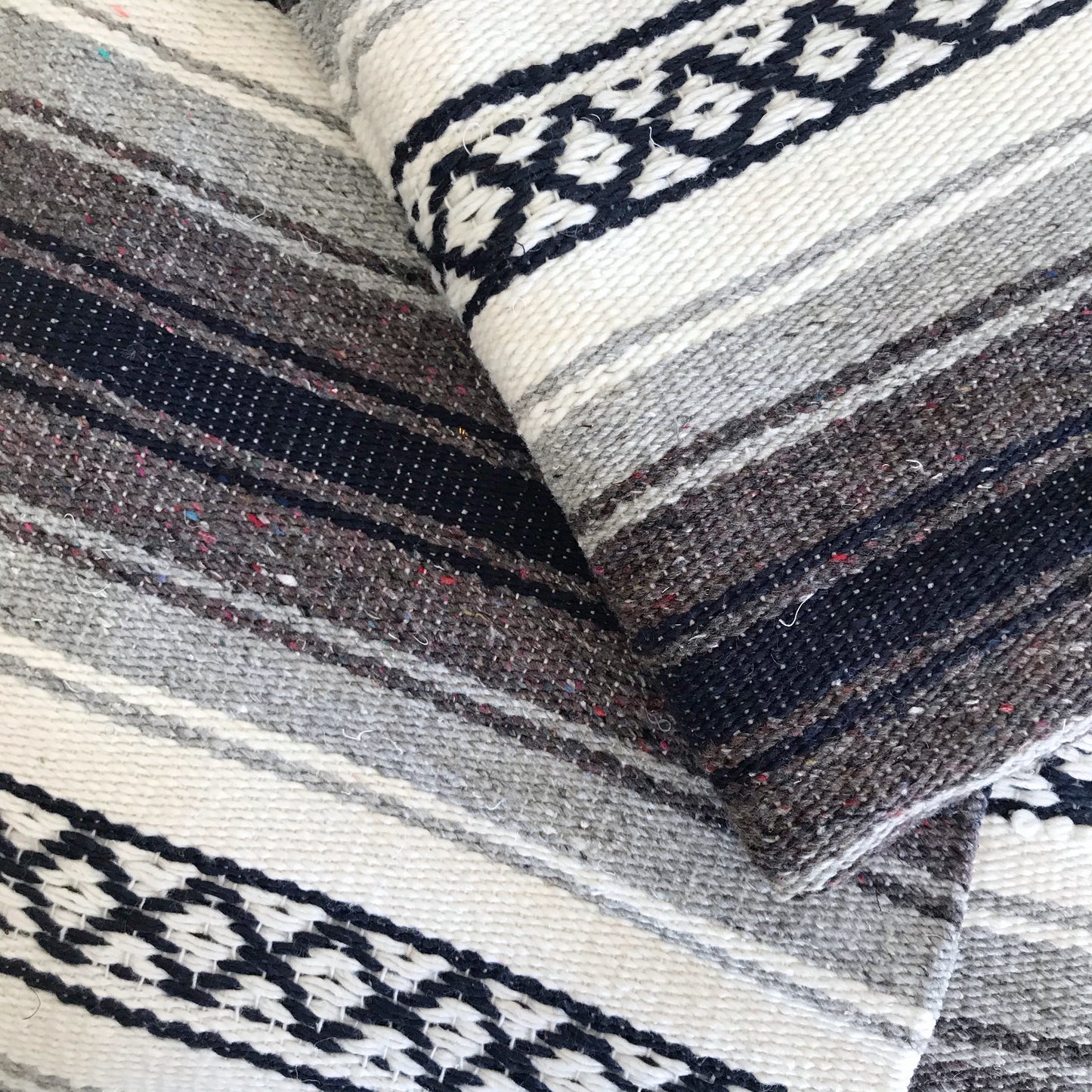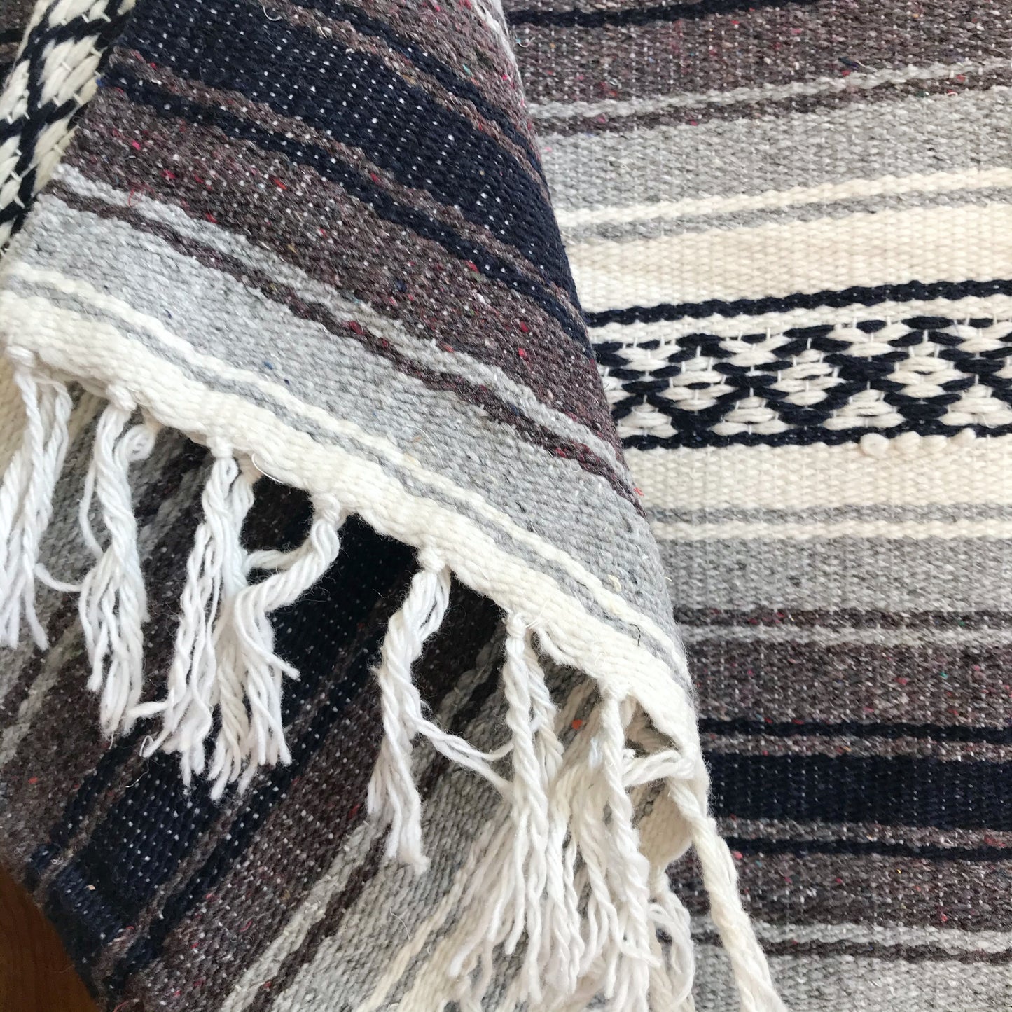 Beautiful vintage (and un-used!) hand-loomed woven blanket with black, brown, white, and light gray stripes. Use it to cozy up with or hang on the wall! Made in Mexico.