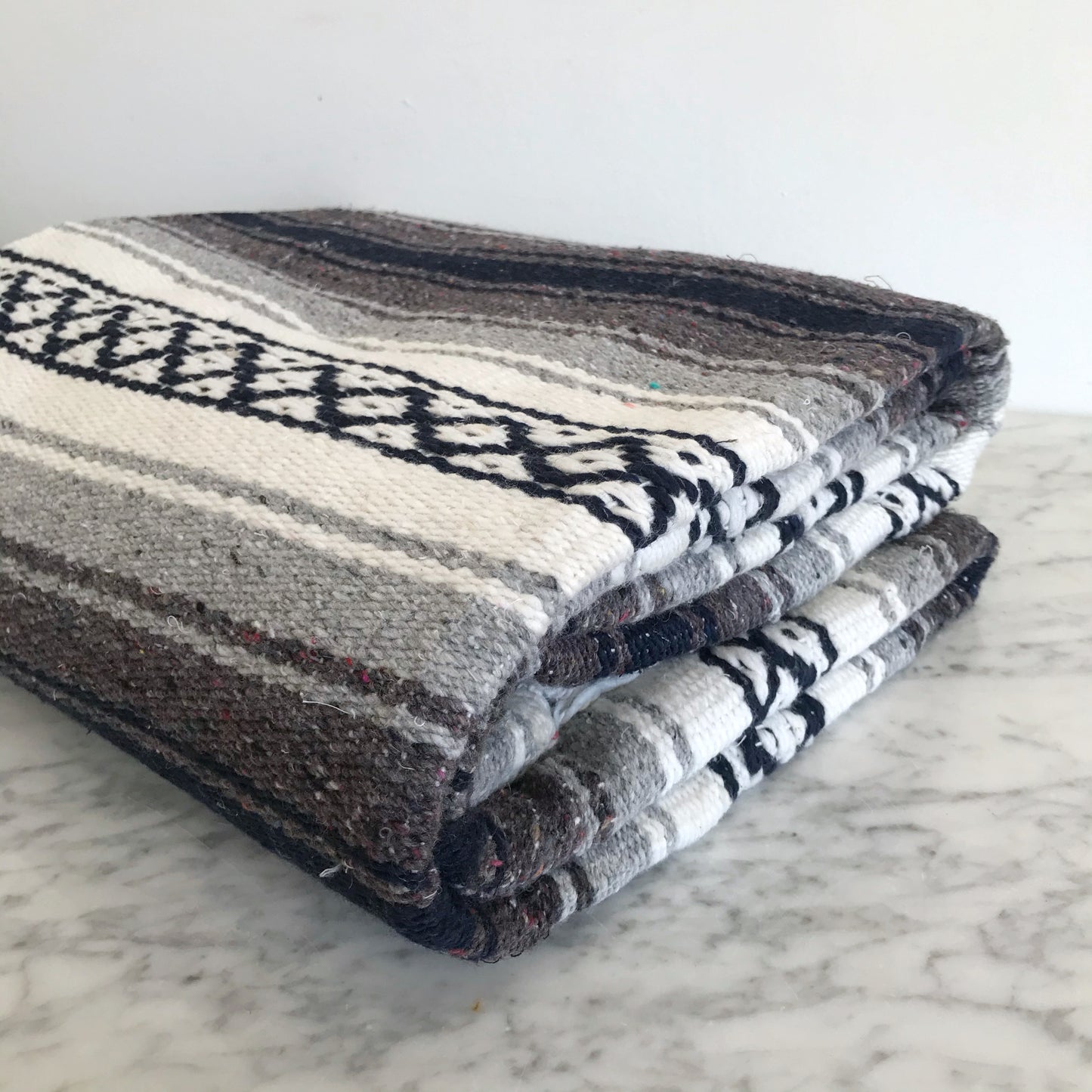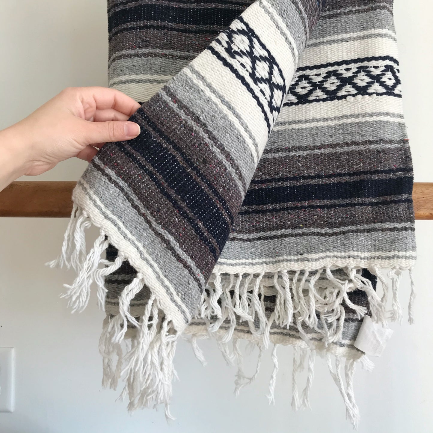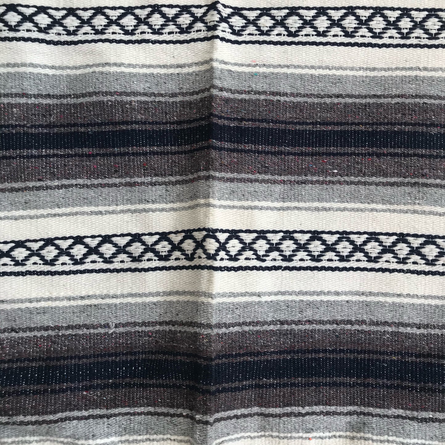 Beautiful vintage (and un-used!) hand-loomed woven blanket with black, brown, white, and light gray stripes. Use it to cozy up with or hang on the wall! Made in Mexico.