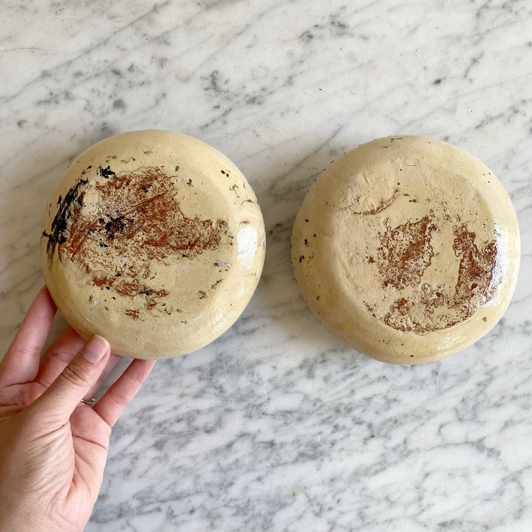 Condition: Rustic pieces with lots of charm and normal wear. The large platter has a chip/crack on the bottom edge (shown in pic).