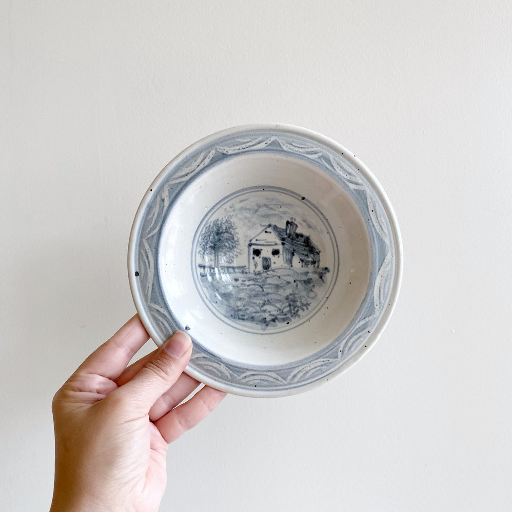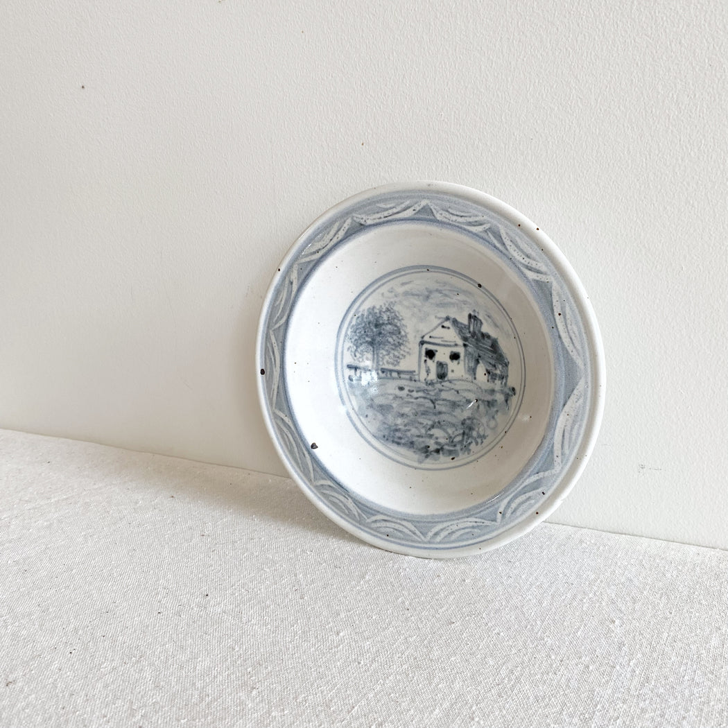 We just adore this vintage ceramic dish with its lovely little hand-painted home in the center! The soft coloring and imagery are inviting and calm-- it makes a nice addition to a coffee table, end table, or even hung on a wall as art.