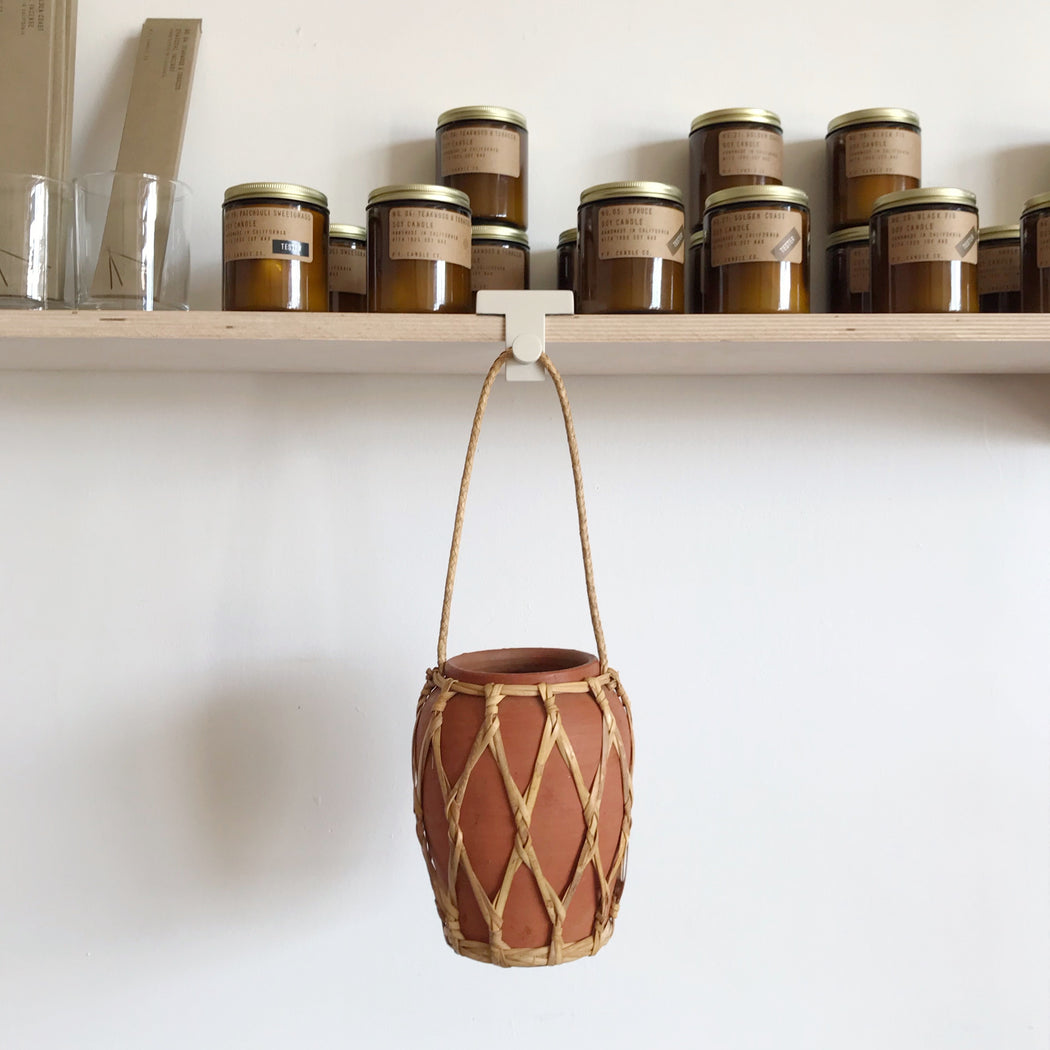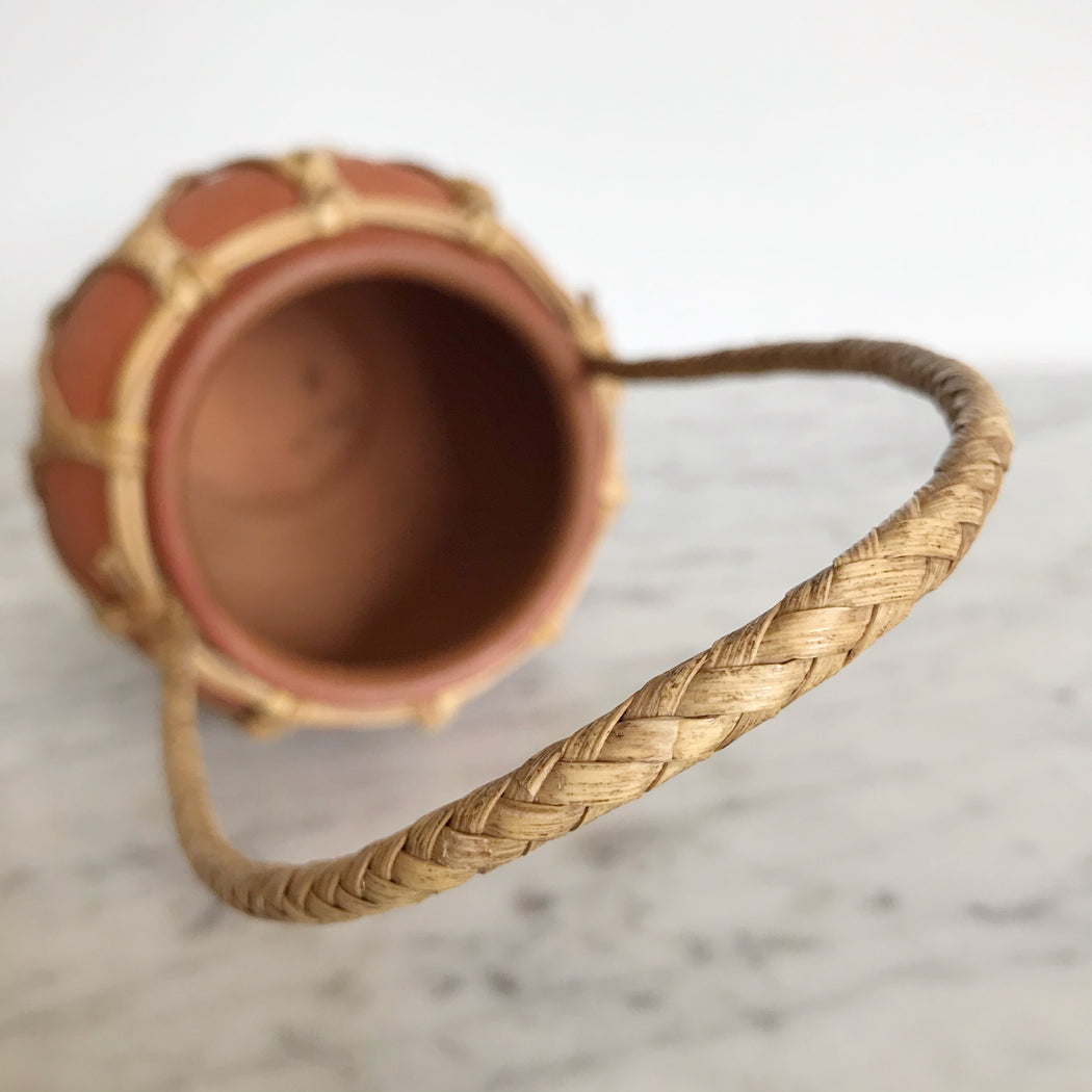 A unique vintage terra cotta jug in a hand-knotted and woven rattan holder. Such a beautiful piece to fill with dried stems and hang anywhere in the home!