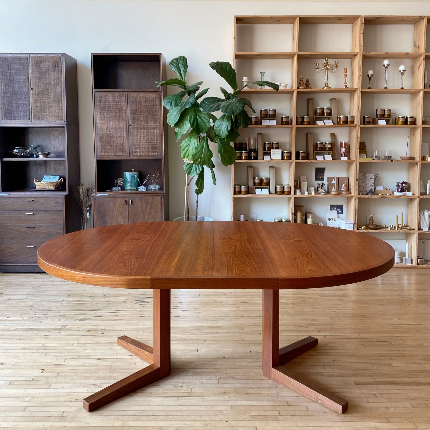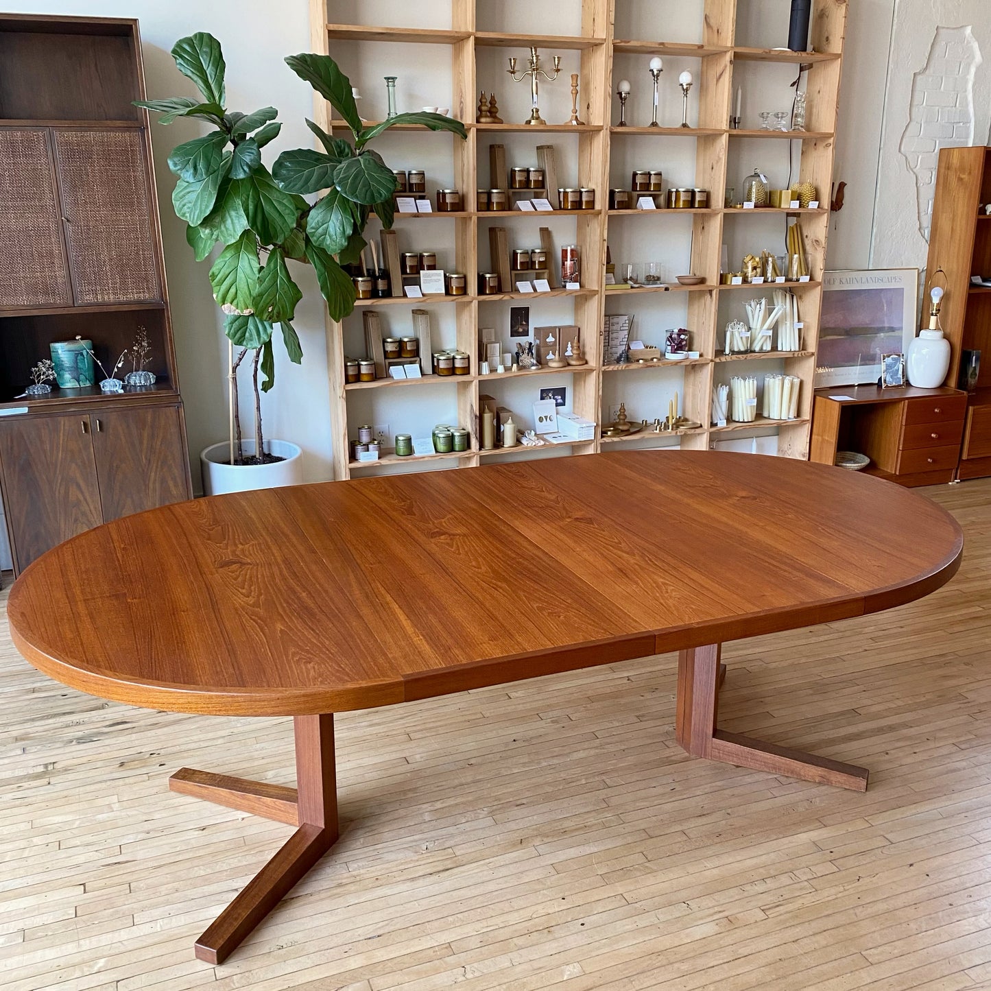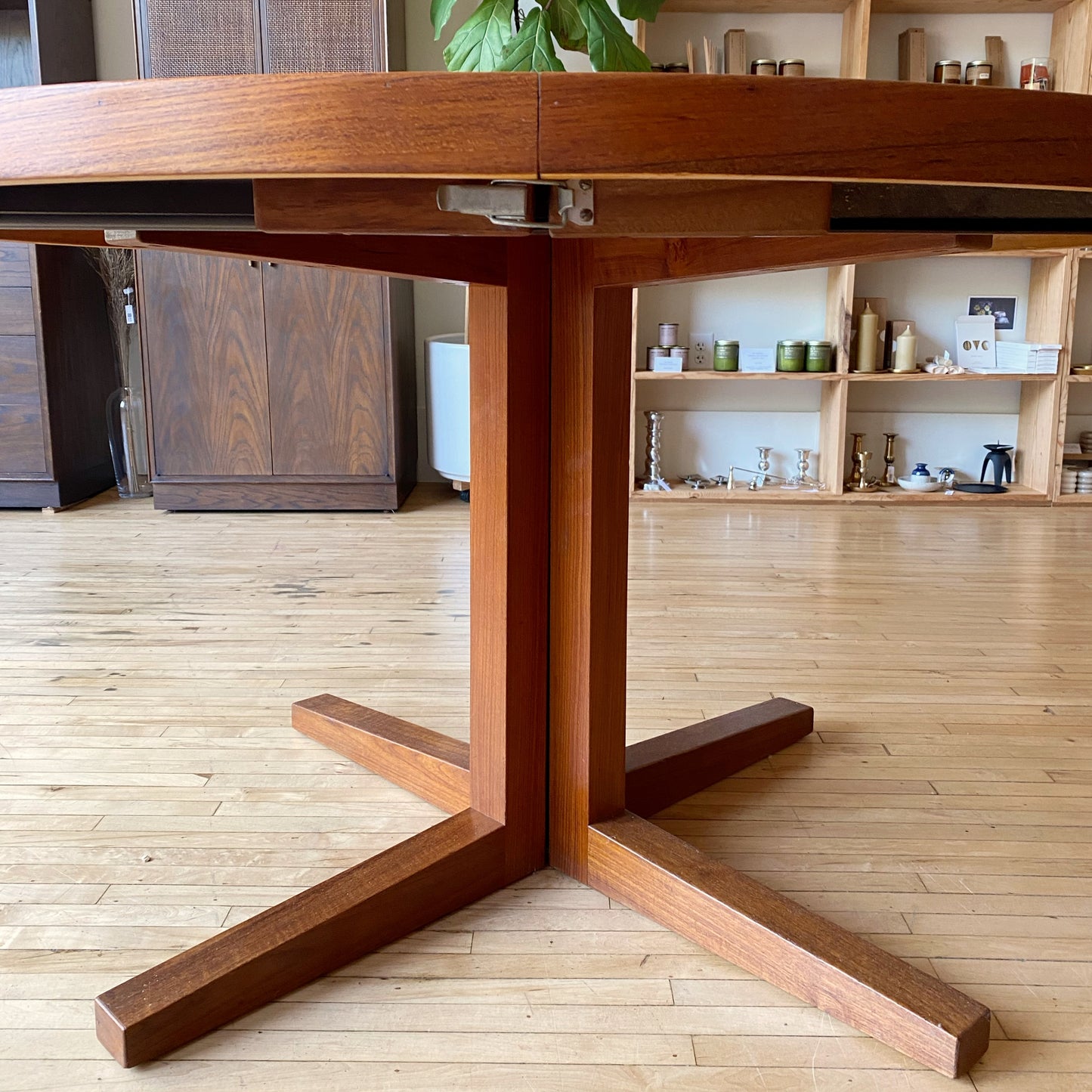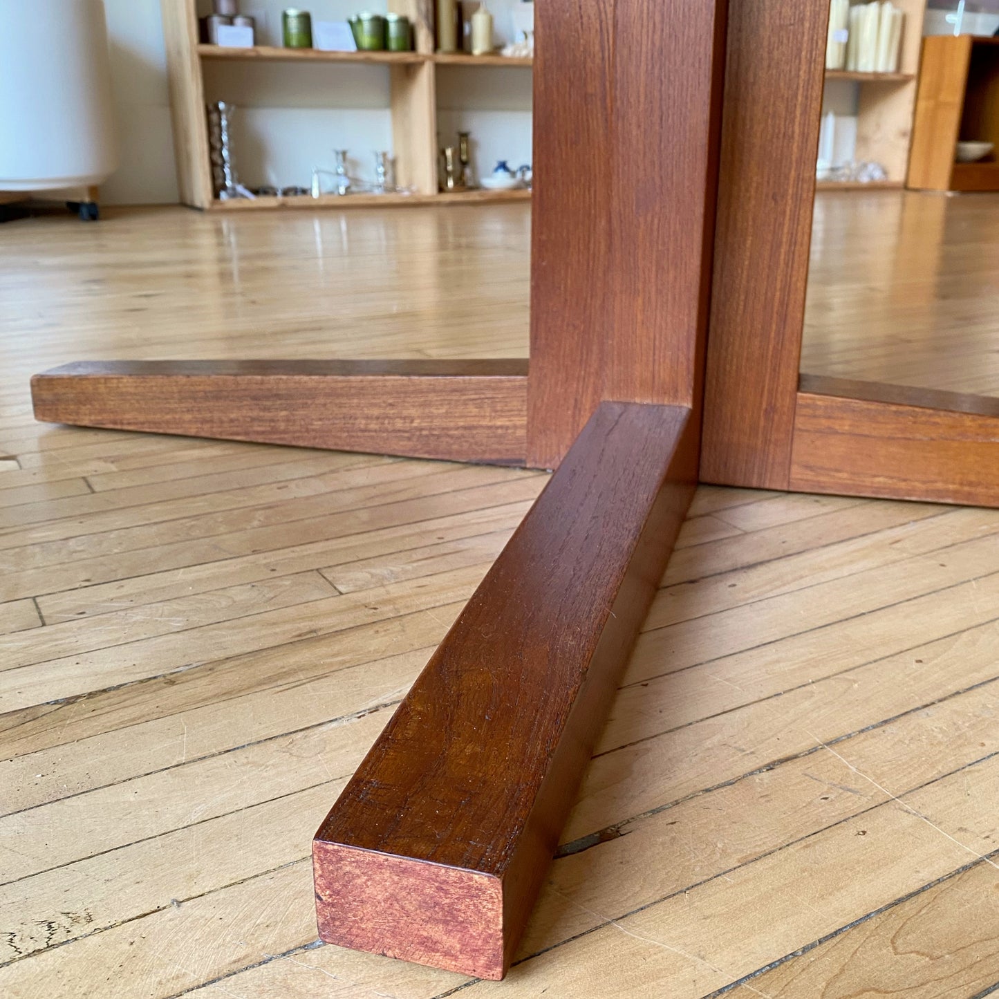 Restored vintage teak dining table with two leaves and pedestal base. Paper label on the bottom reads "International Design Center." We love the beautiful natural teak color and wood grain, as well as the sleek modern squared edges.