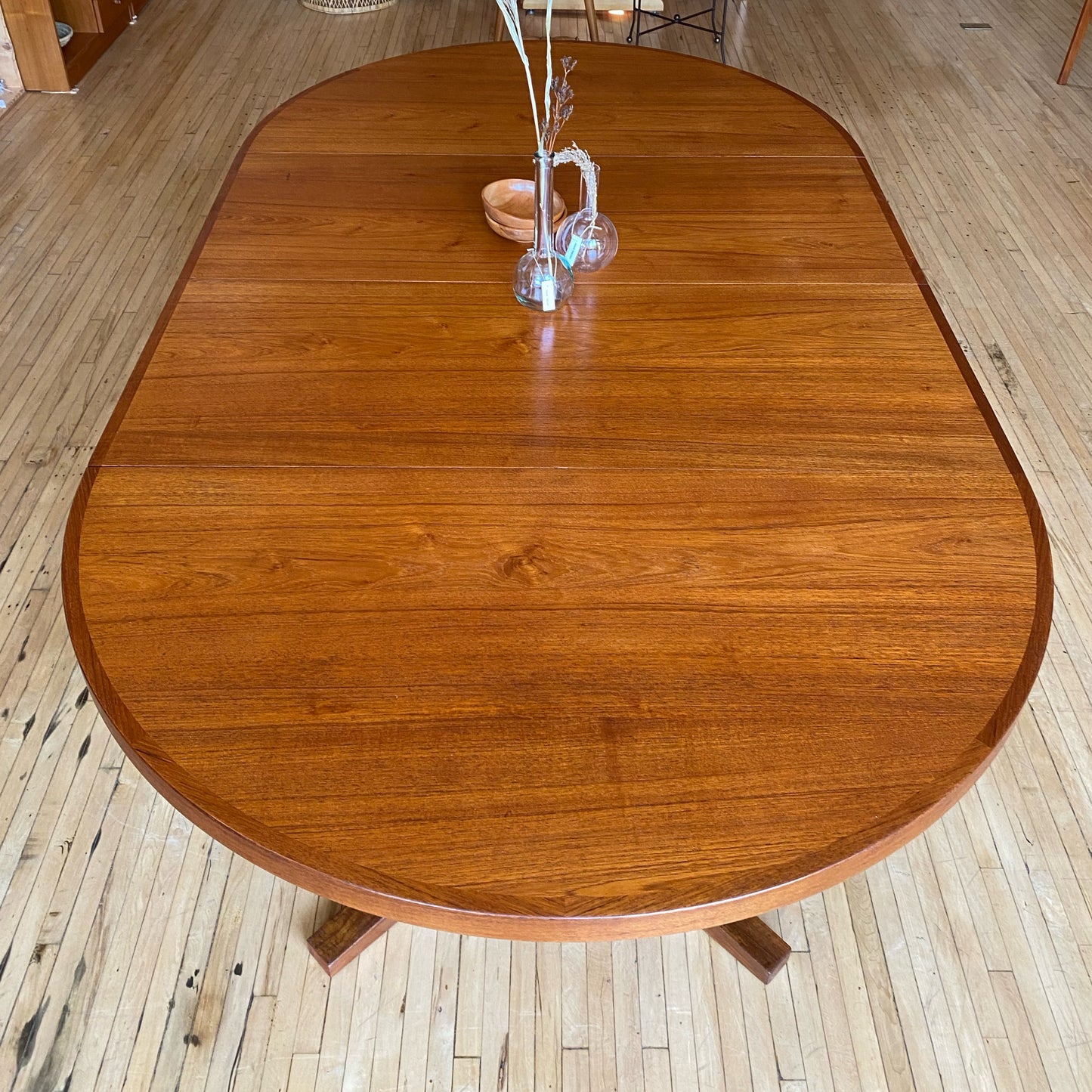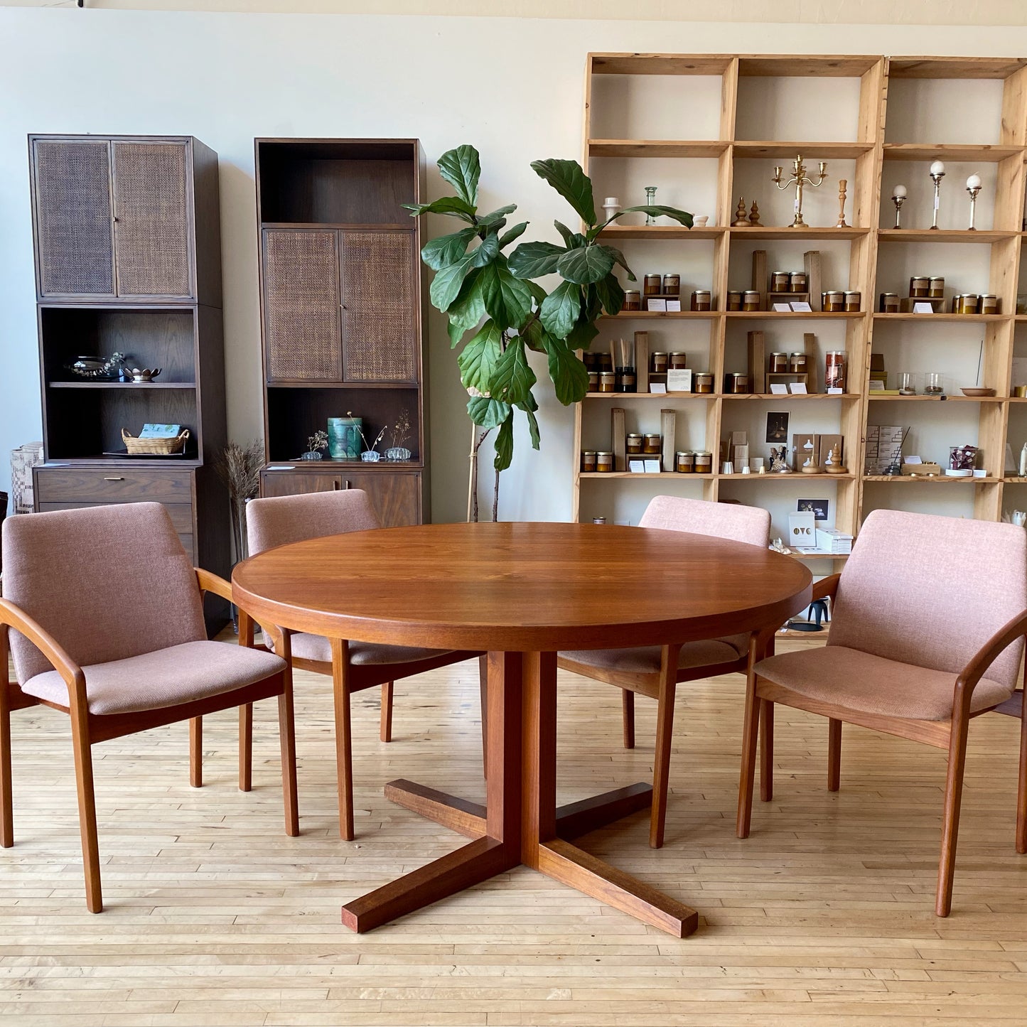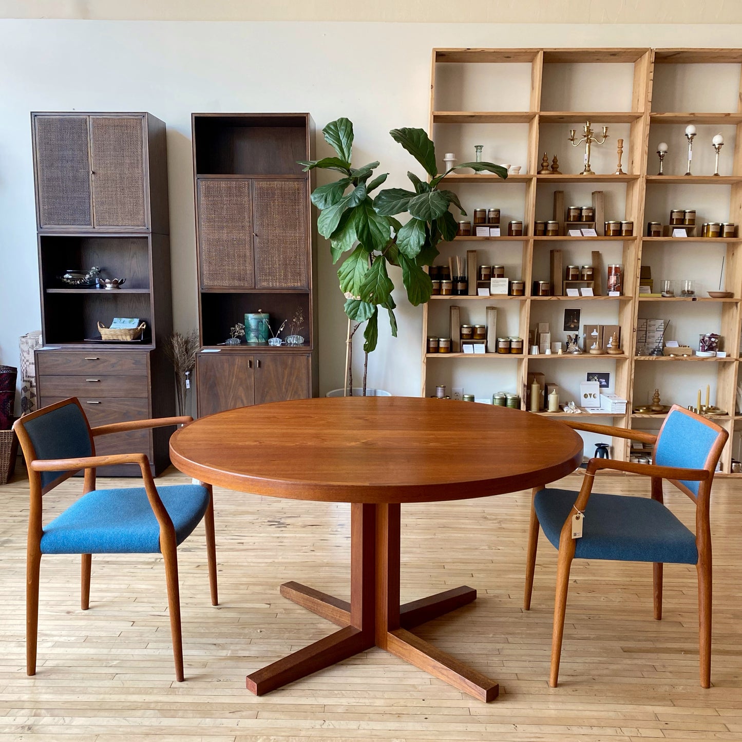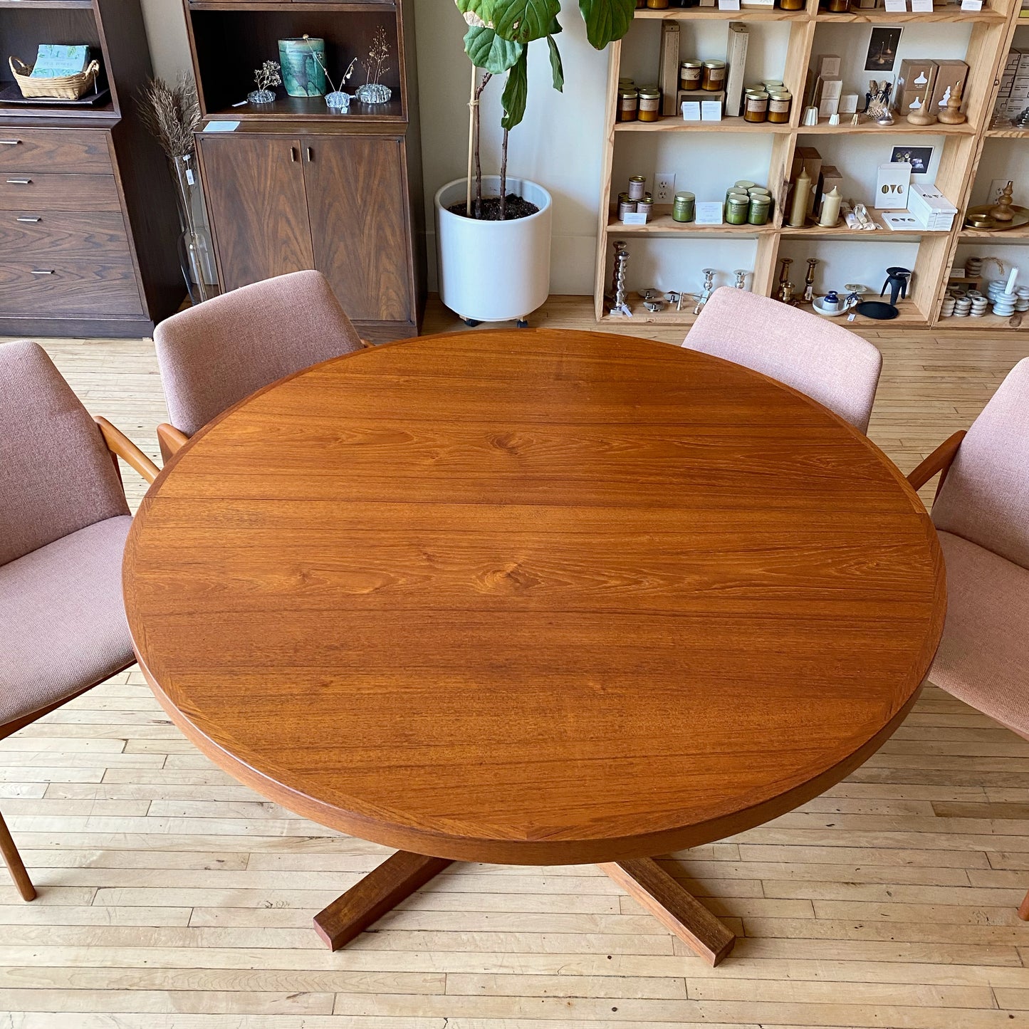 Restored vintage teak dining table with two leaves and pedestal base. Paper label on the bottom reads "International Design Center." We love the beautiful natural teak color and wood grain, as well as the sleek modern squared edges.