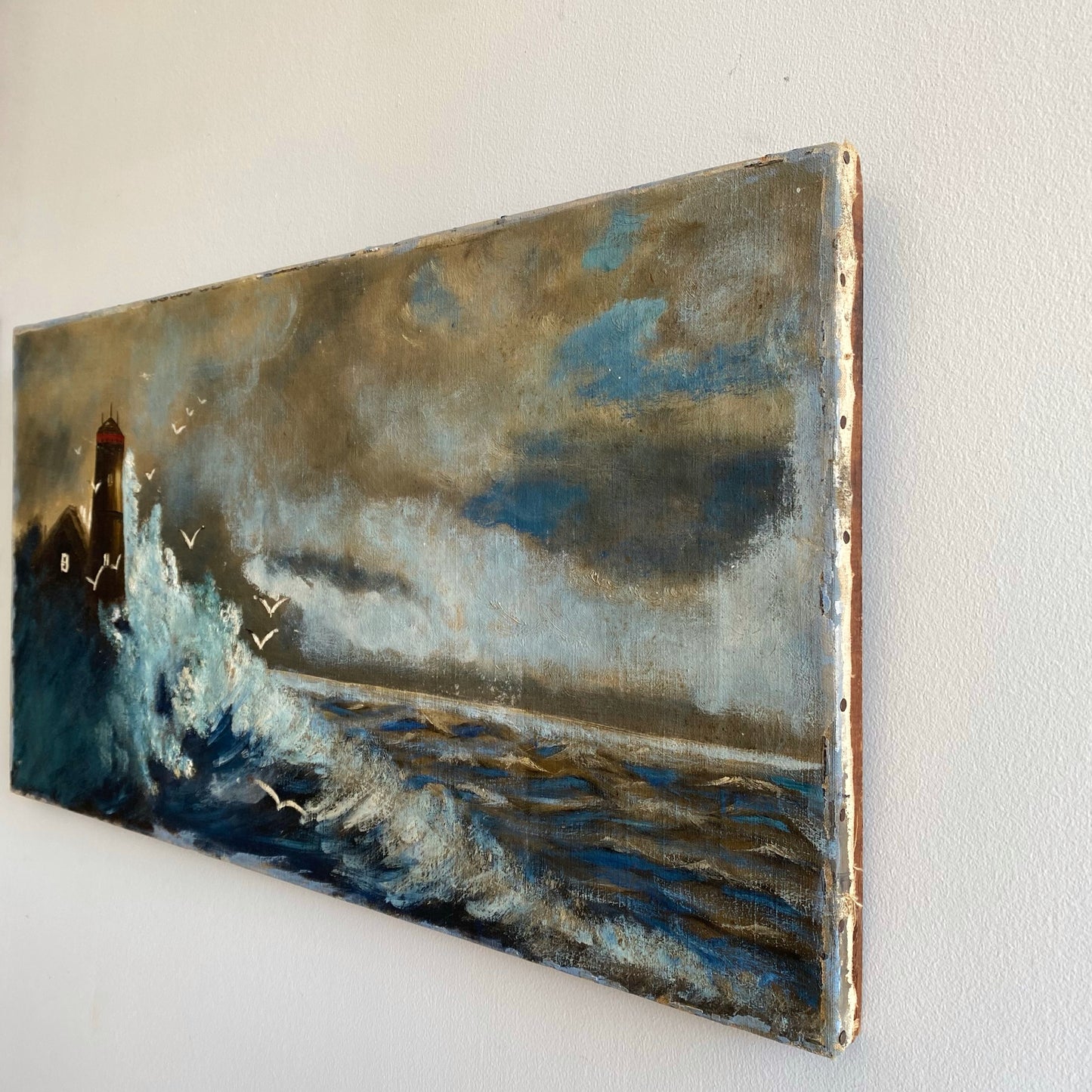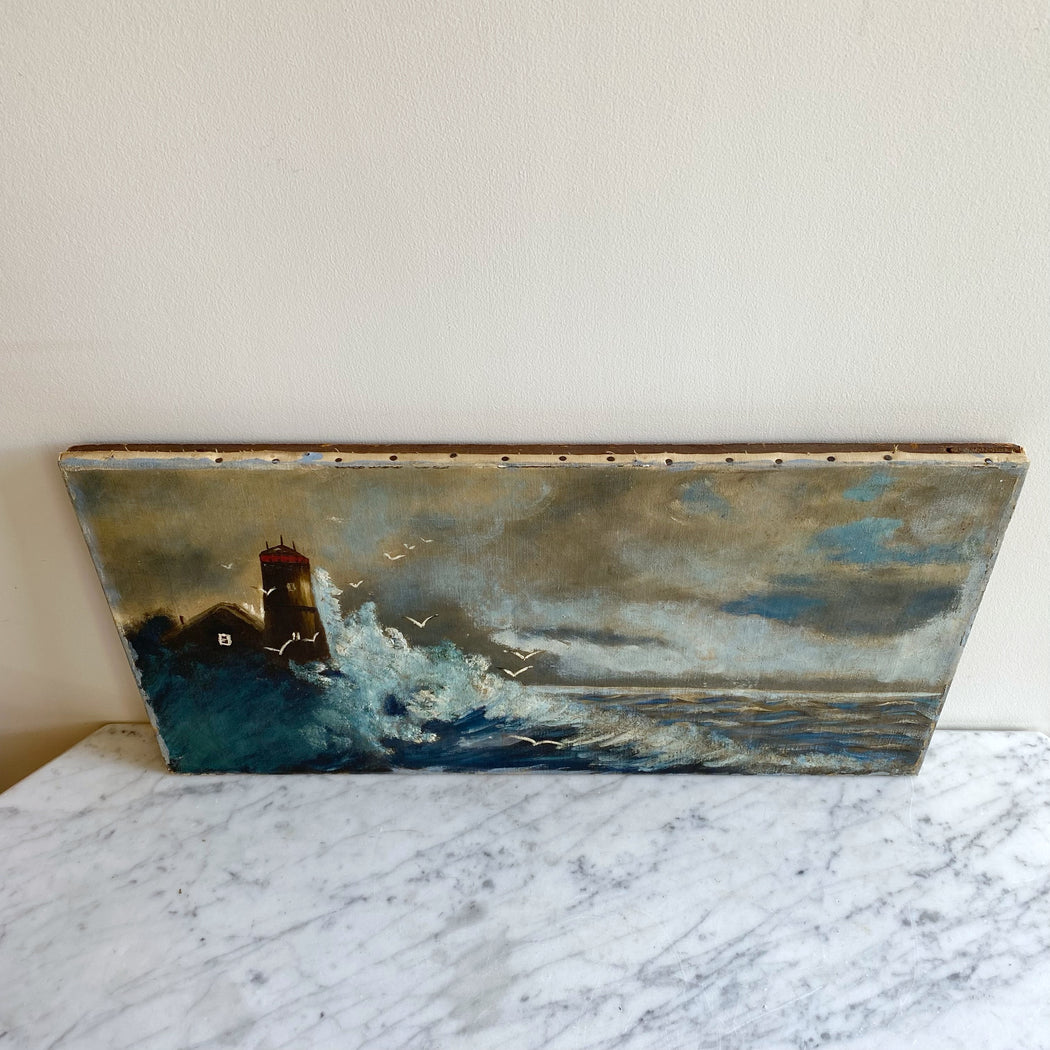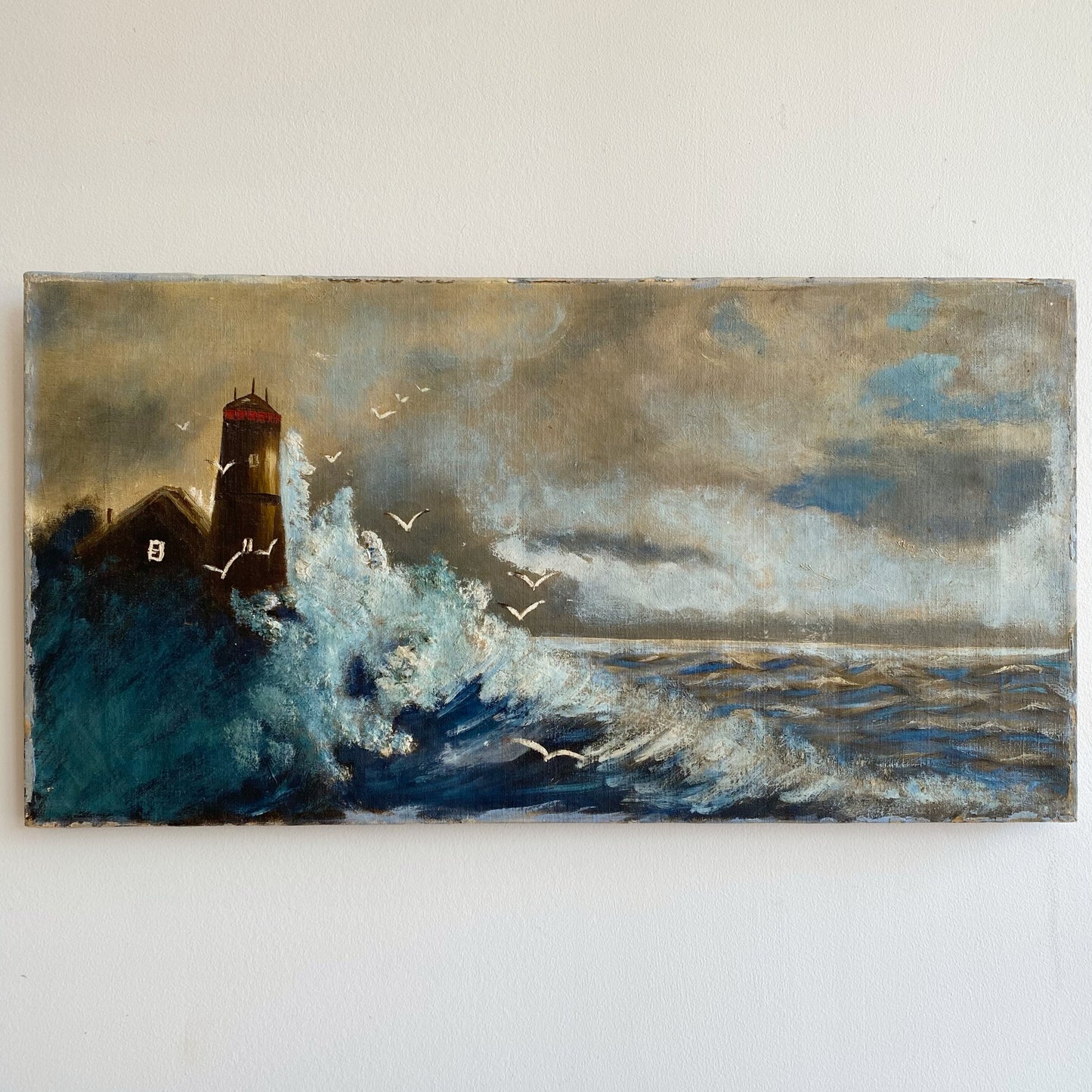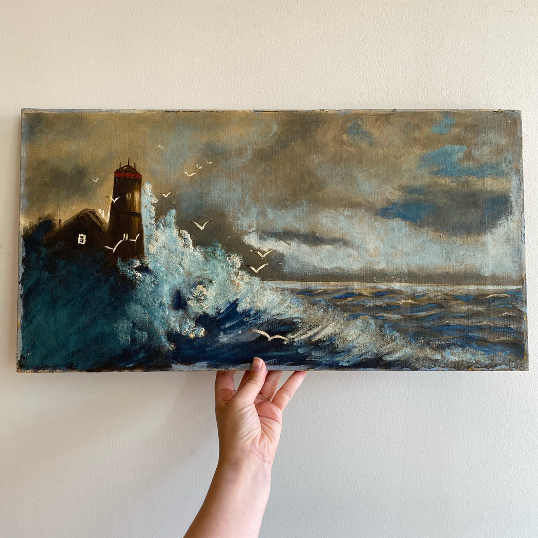Vintage original painting of a lighthouse and waves crashing on the shore. Wonderfully worn and distressed, giving it authentic character and charm. Canvas on wood stretcher.