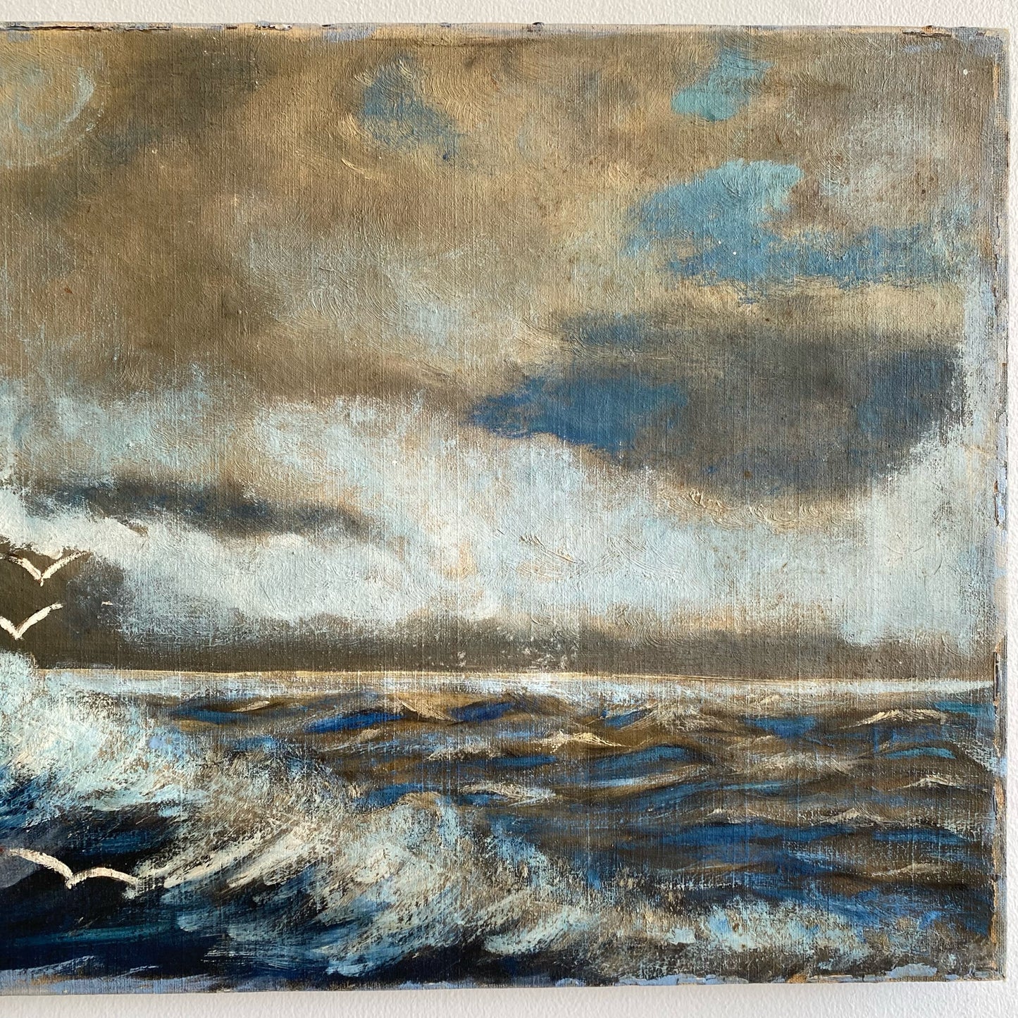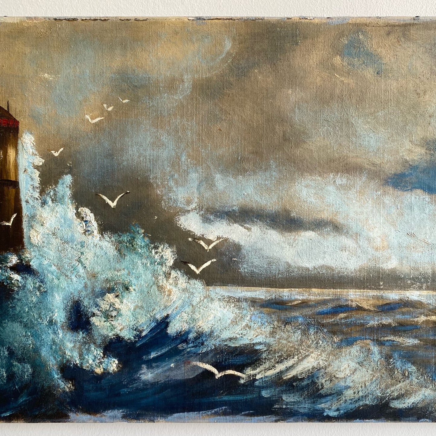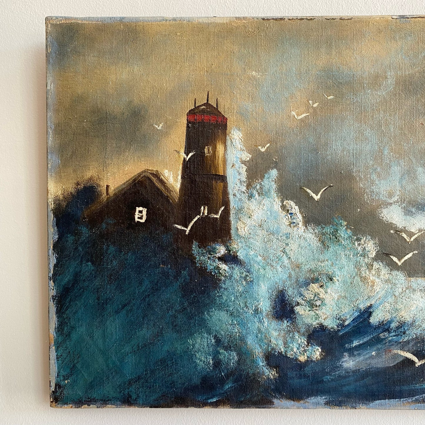 Vintage original painting of a lighthouse and waves crashing on the shore. Wonderfully worn and distressed, giving it authentic character and charm. Canvas on wood stretcher.