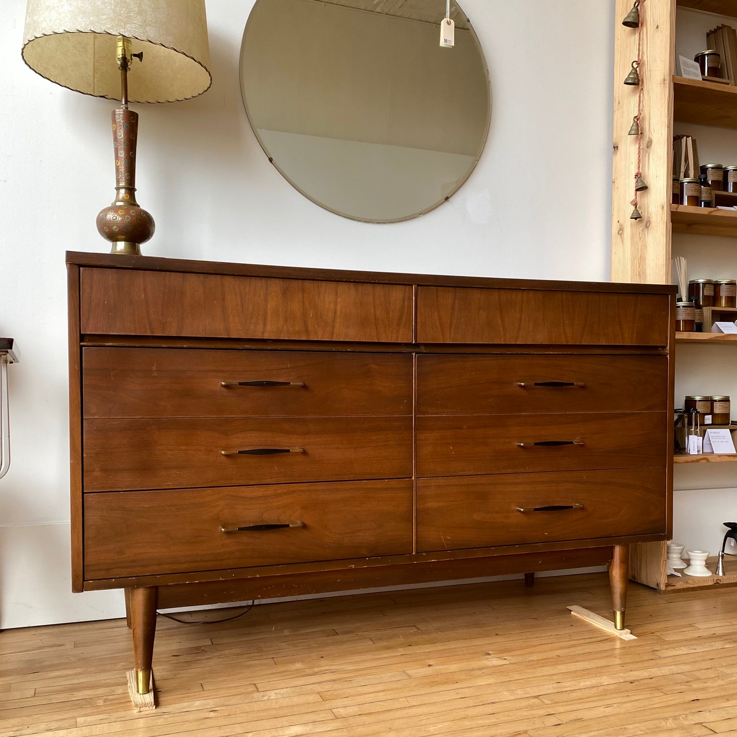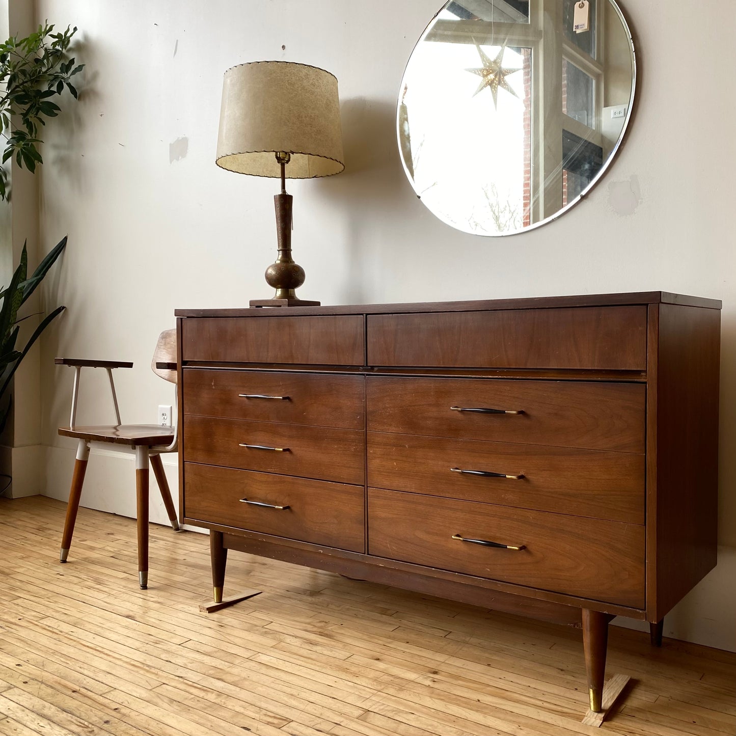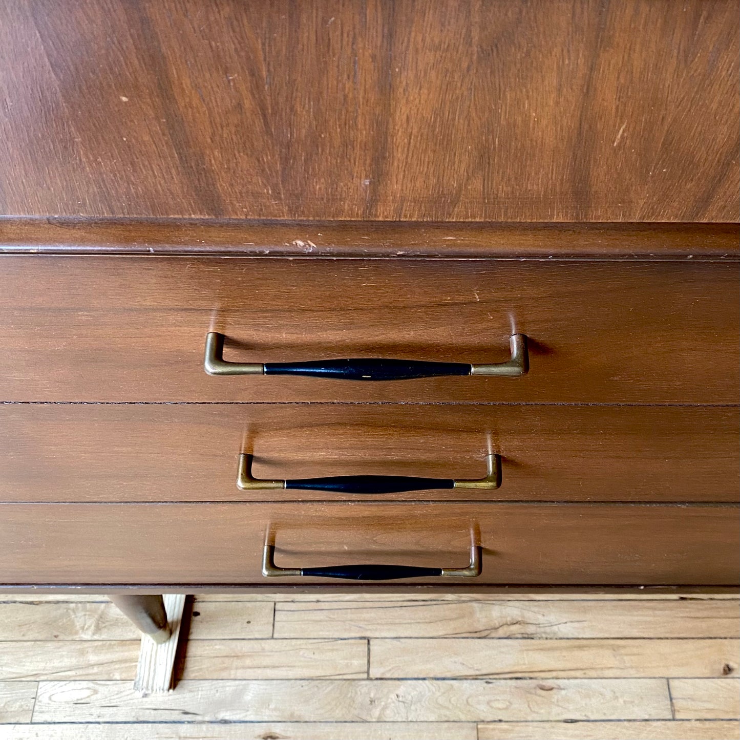 This is a fantastic vintage mid-century modern dresser featuring 6 drawers, original brass and black handles, durable easy-to-clean formica top, and classic tapered legs. There are two regular drawers on the top and bottom rows. The center two drawers are actually double-deep, but have the appearance of being 4 regular drawers.