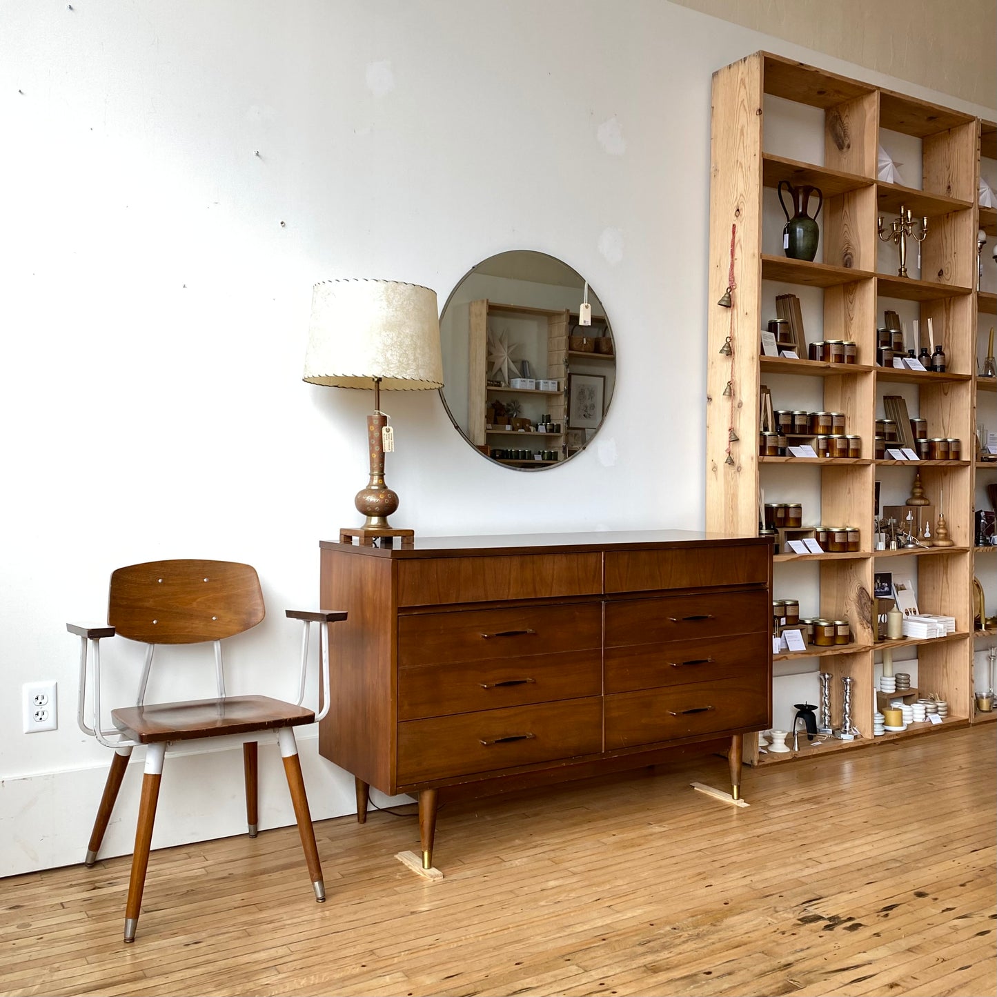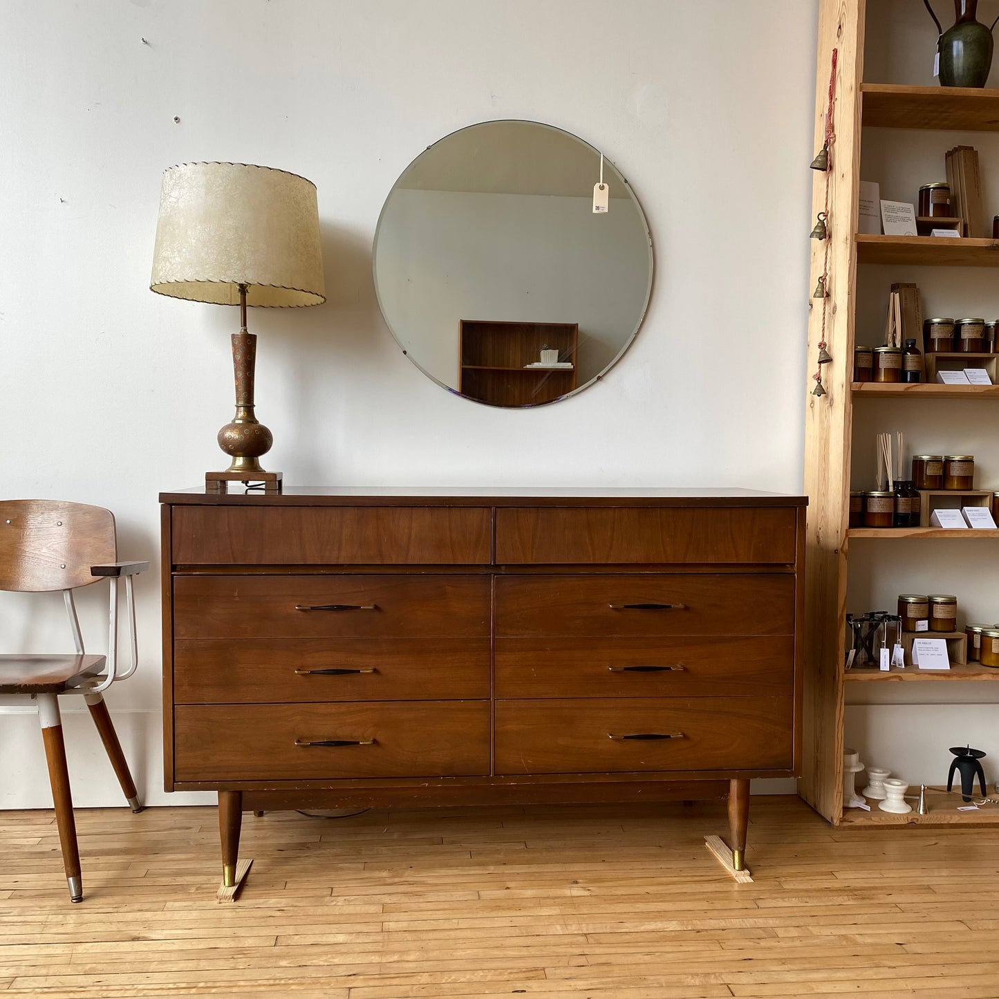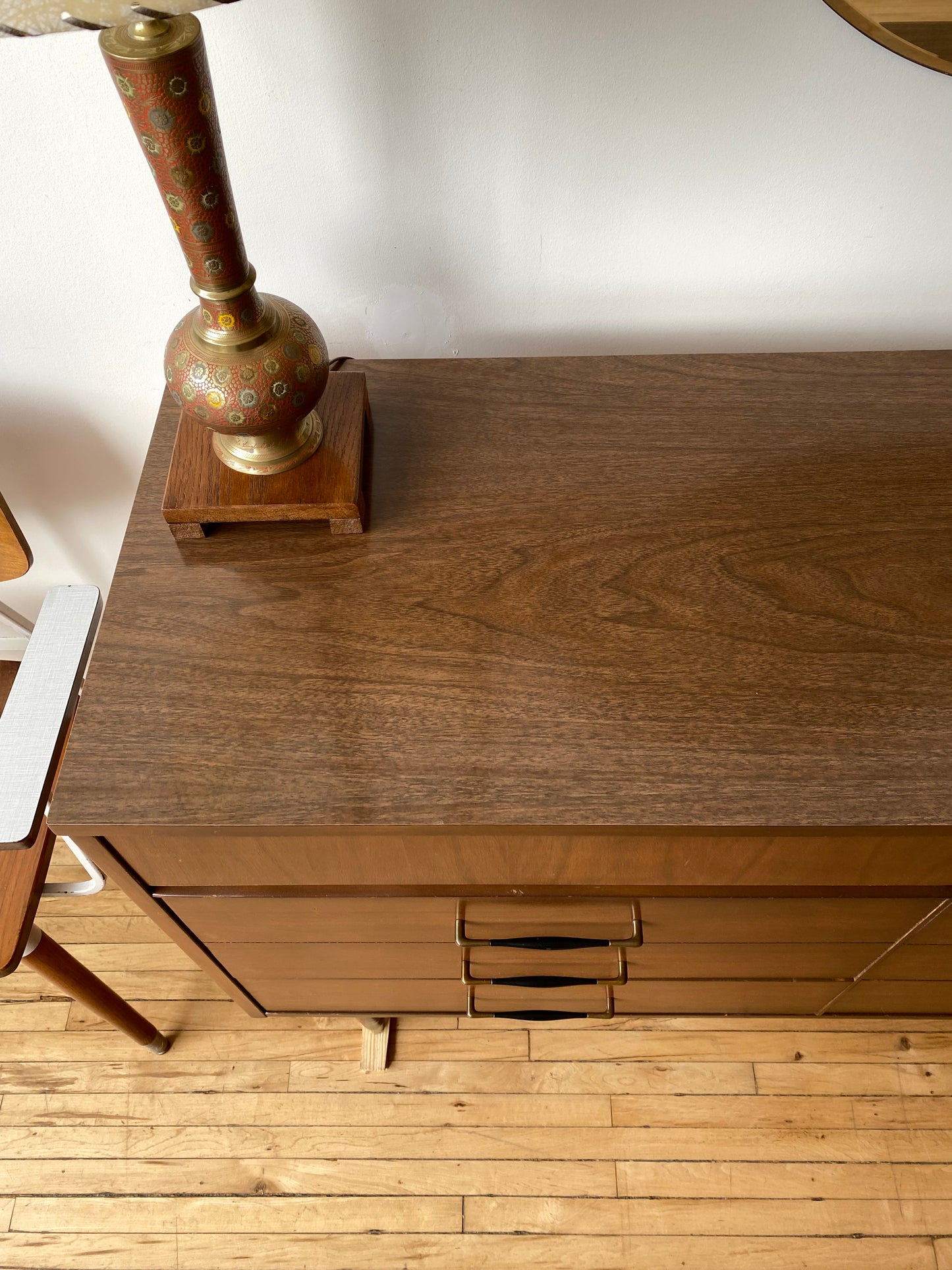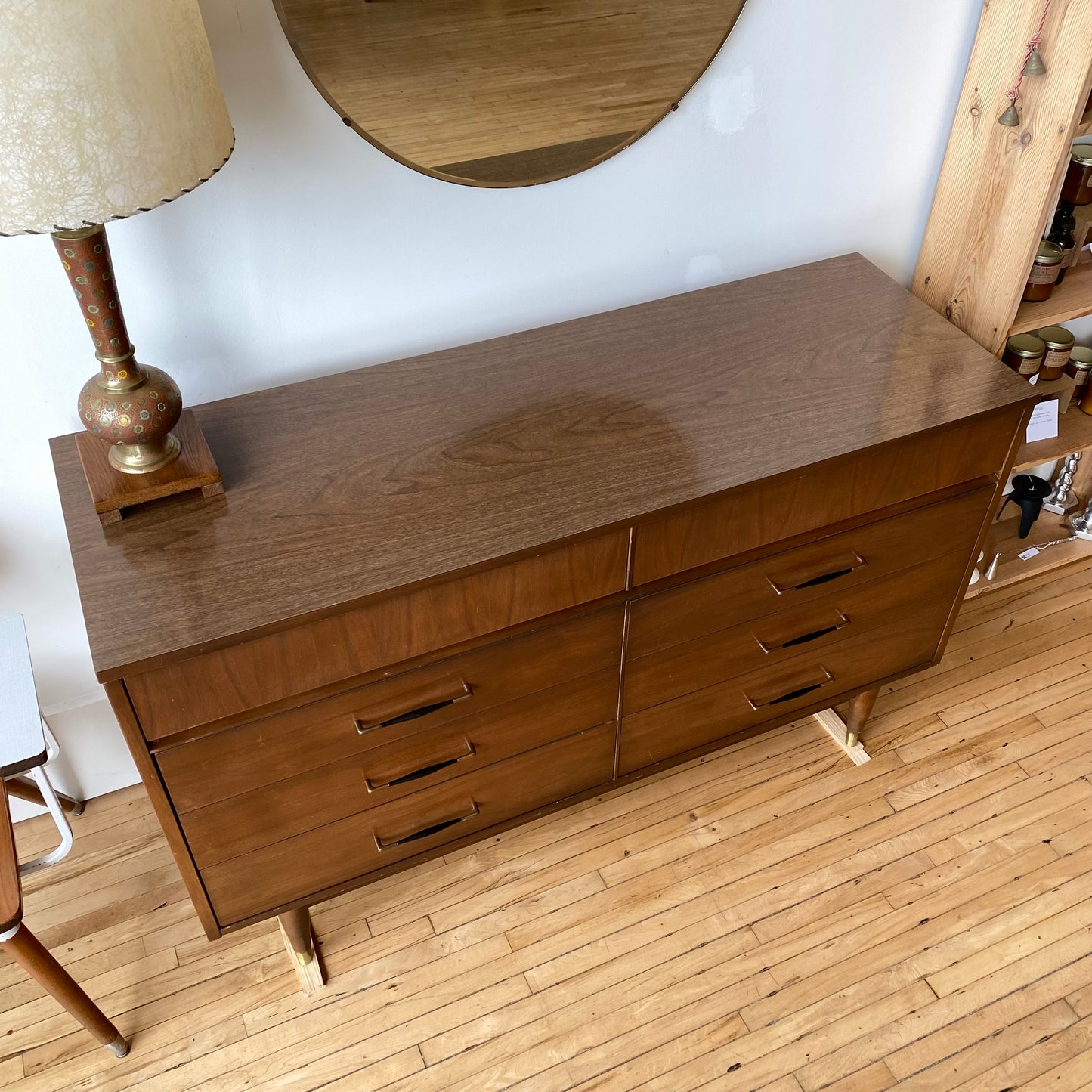 This is a fantastic vintage mid-century modern dresser featuring 6 drawers, original brass and black handles, durable easy-to-clean formica top, and classic tapered legs. There are two regular drawers on the top and bottom rows. The center two drawers are actually double-deep, but have the appearance of being 4 regular drawers.