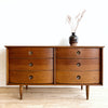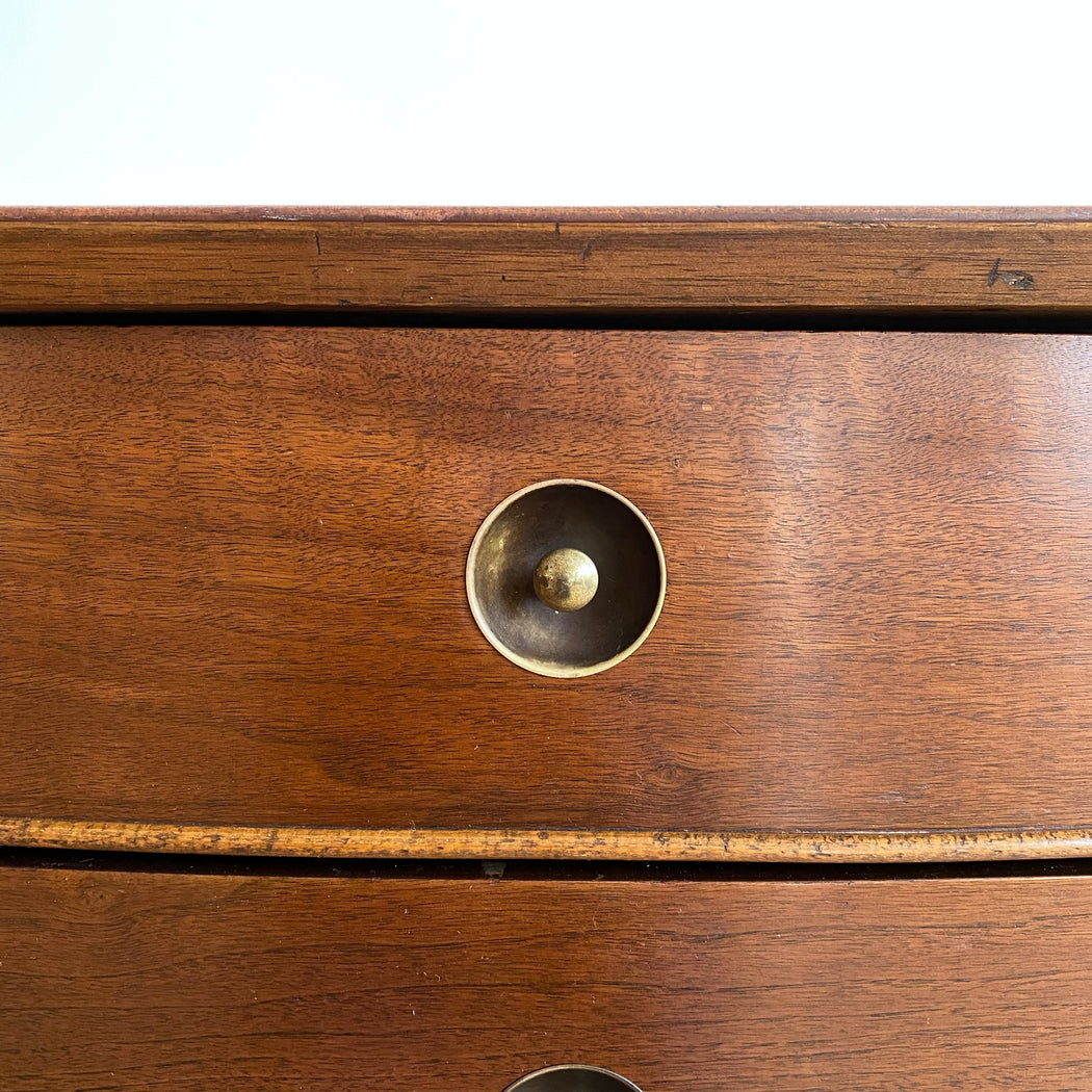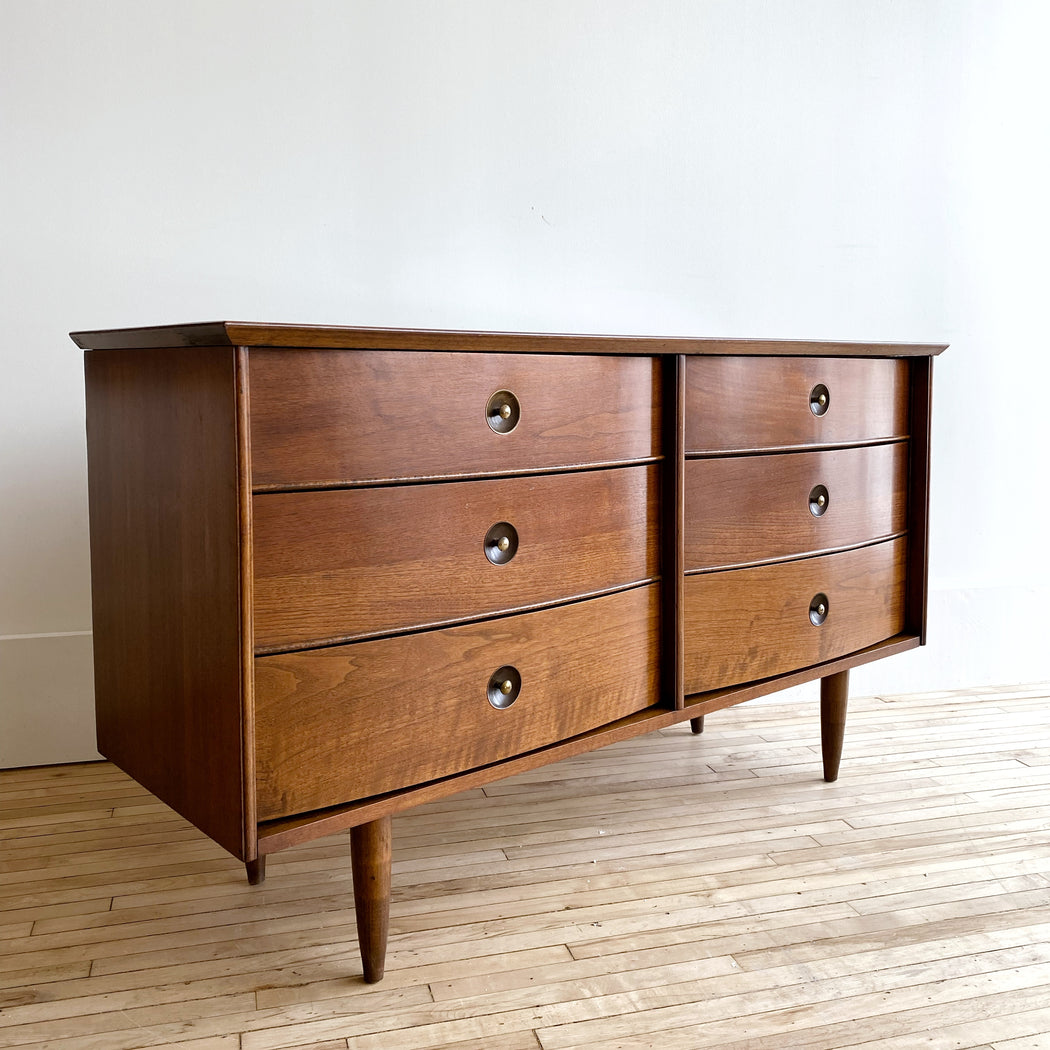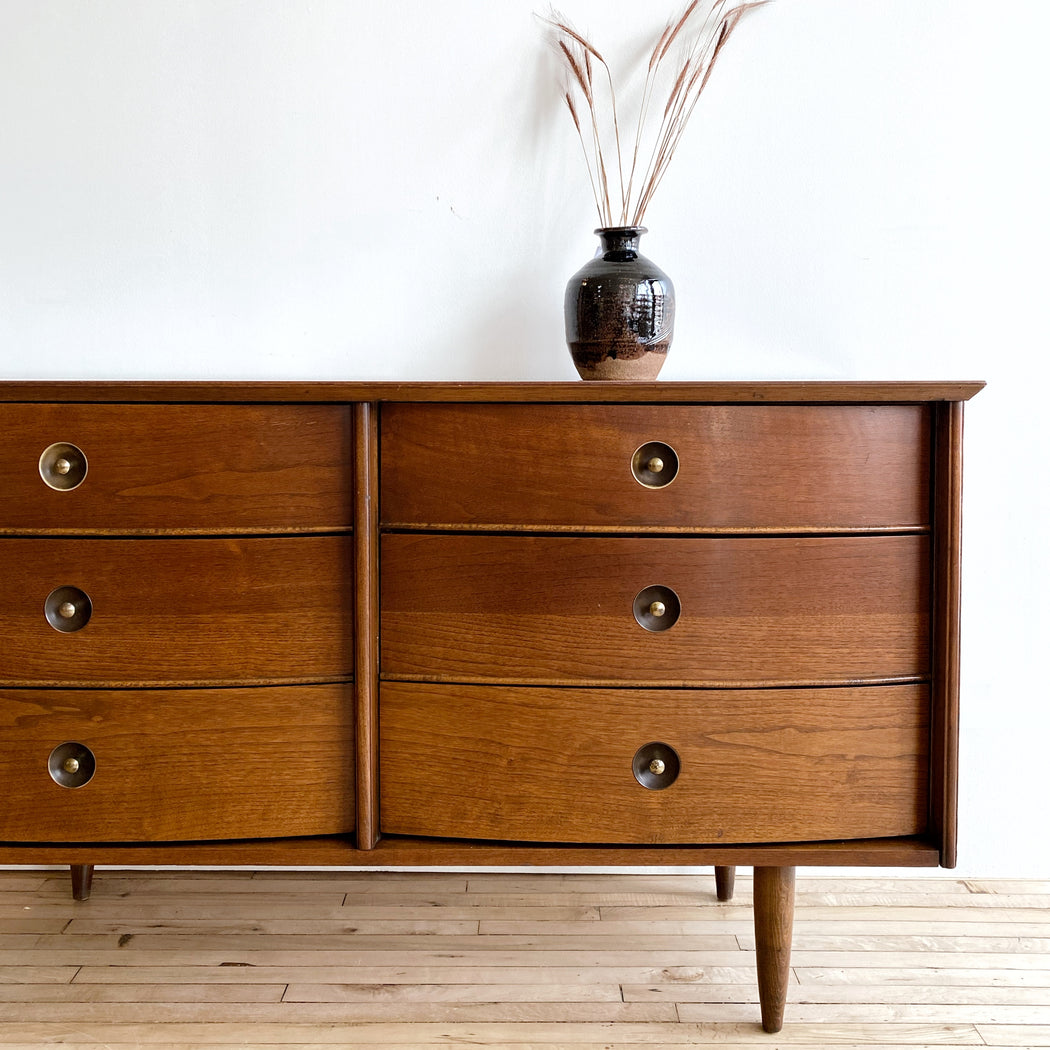 This is a handsome example of mid-century modern design. We love the clean lines, curved drawer fronts, and original brass hardware that has perfect patina and add so much character! The formica top with wood grain pattern is durable and easy to clean, which is great for a high-use, high traffic area or kids room.