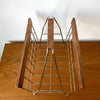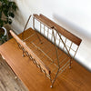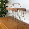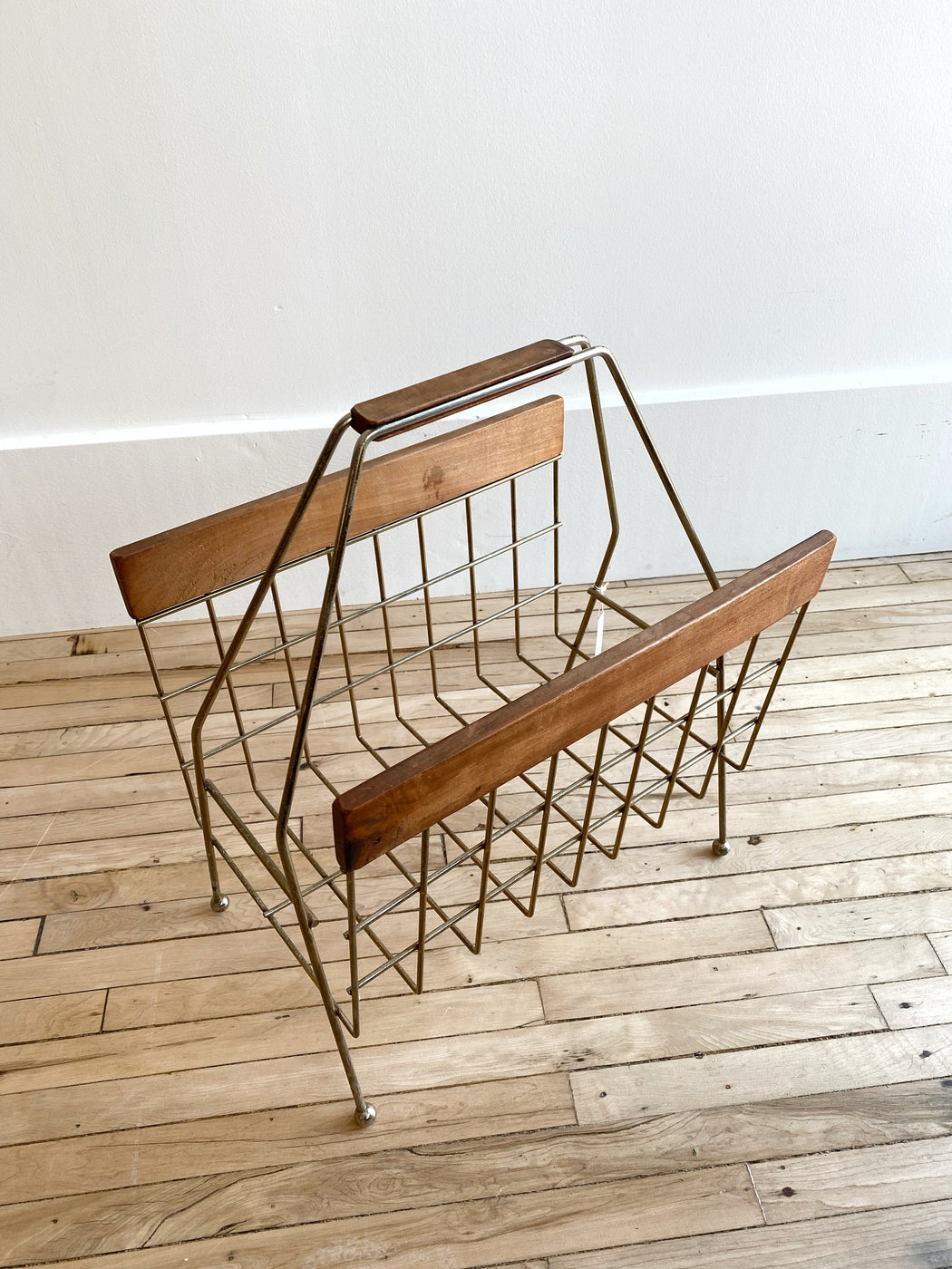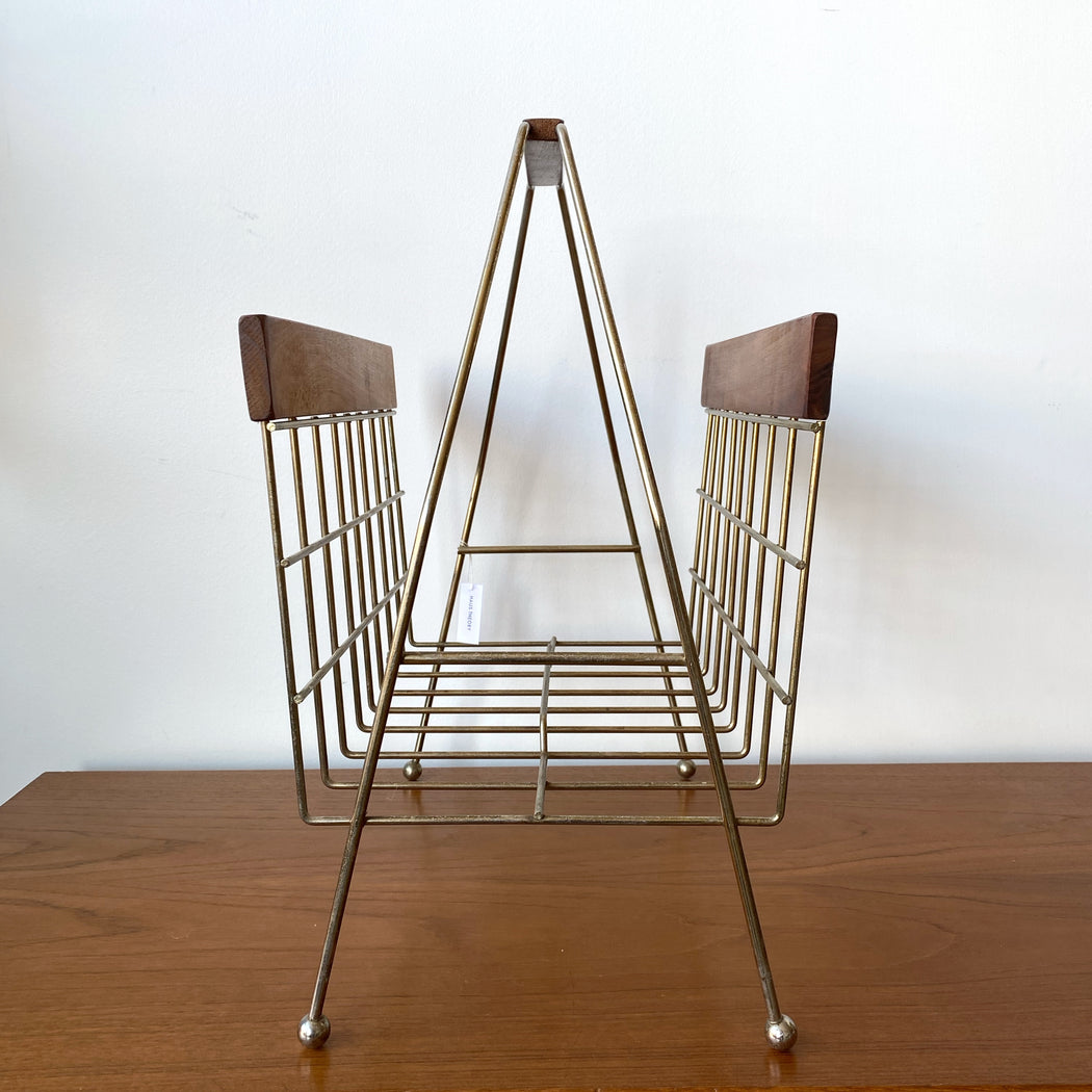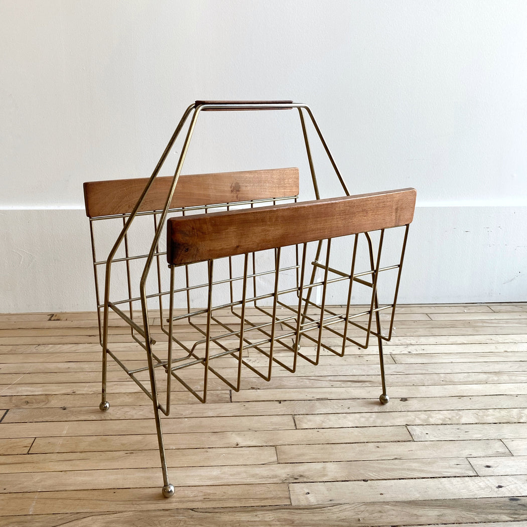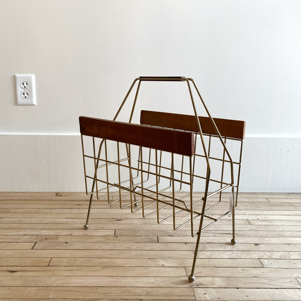 A personal fave, this large vintage MCM magazine rack is great for all your current reads or albums! We love the strong metal frame, wooden rails and handle, and tiny ball feet.