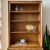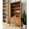 It comes apart into two pieces for easier moving and transport. The top features three shelves, dividing it into four sections, and the base features two drawers with original brass pulls.