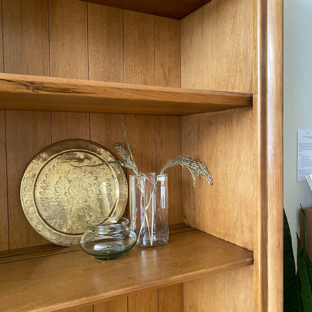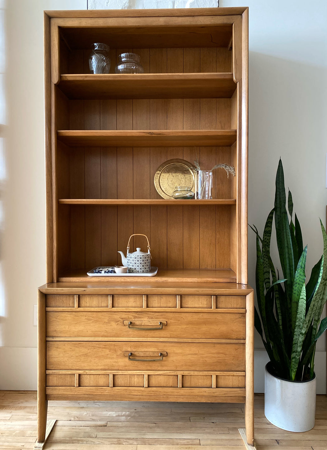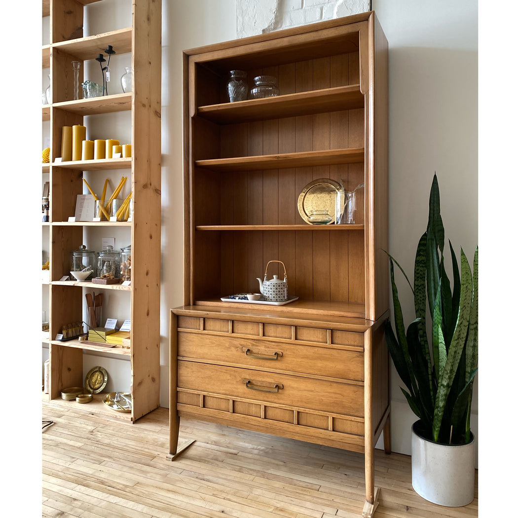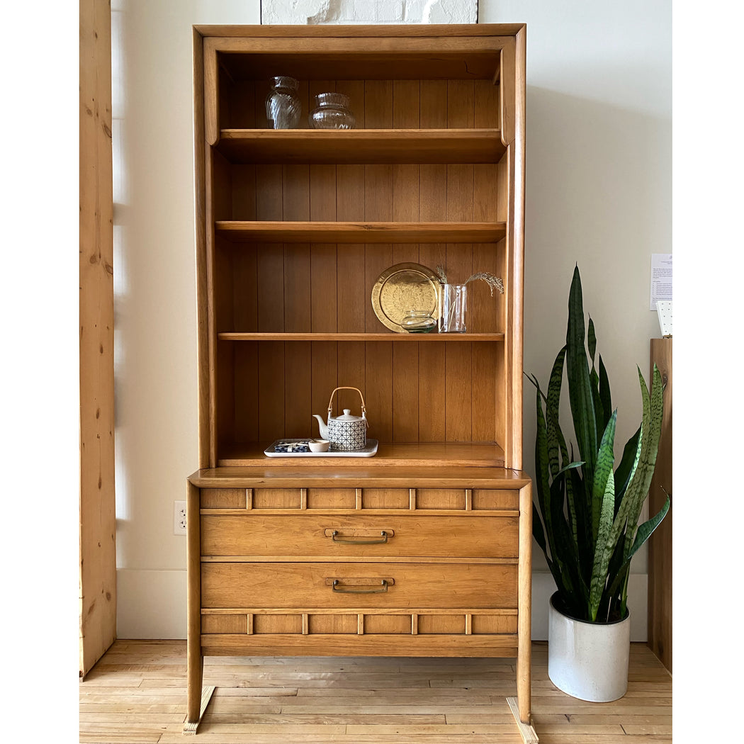 Vintage mid-century two-piece hutch by Drexel— a lovely addition to your dining room, office, or anywhere you could use a stylish piece to store and display your favorite objects!