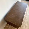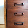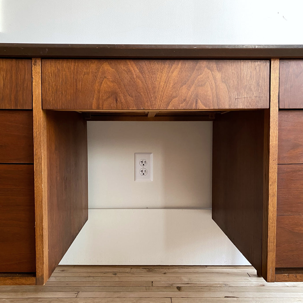 It features a beautiful dark walnut wood body, a durable easy-to-clean formica top, 8 drawers, and fantastic sculpted wood handles. The back is finished so it could be placed away from the wall or floating in the middle of the room.