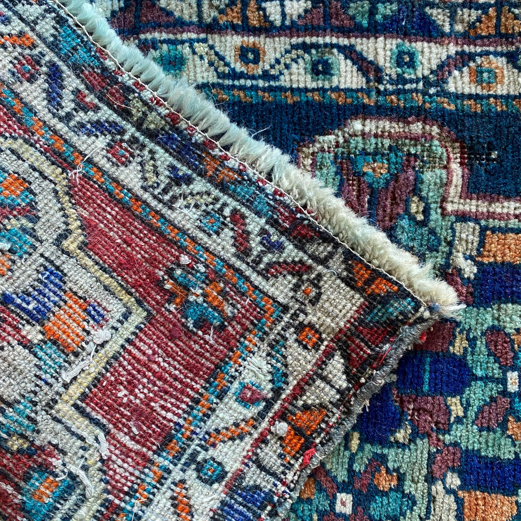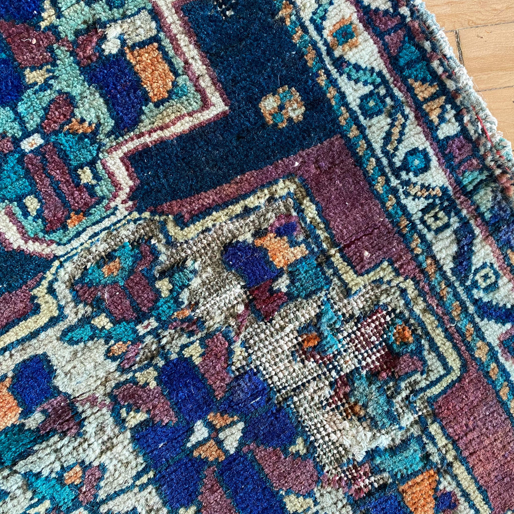 This is a beautiful and moody vintage hand-knotted rug! It's a perfectly petite size, and would be great in front of a sink, bathtub, in an entryway, or even a wall or tabletop!