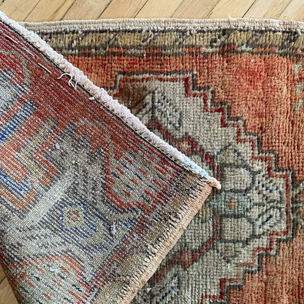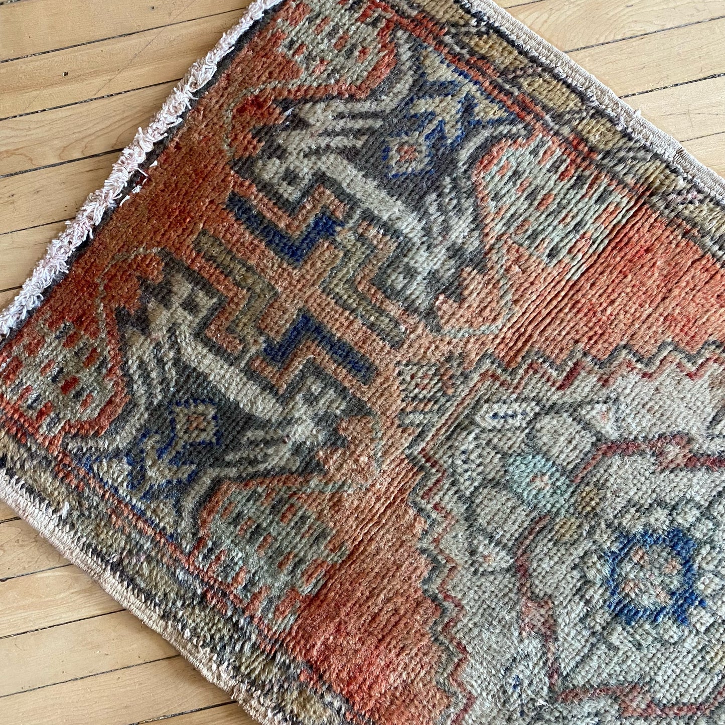 Add some color and texture to your home with this beautiful vintage hand-knotted rug! It's a perfectly petite size, and would be great in front of a sink, bathtub, in an entryway, or even a wall or tabletop!