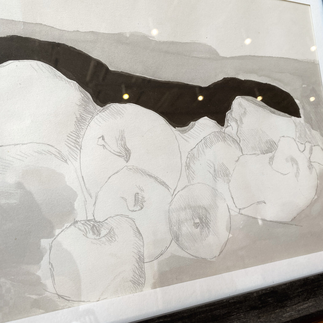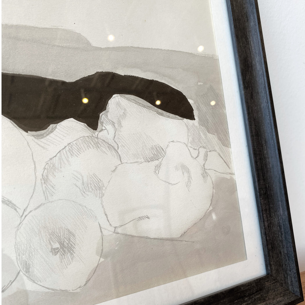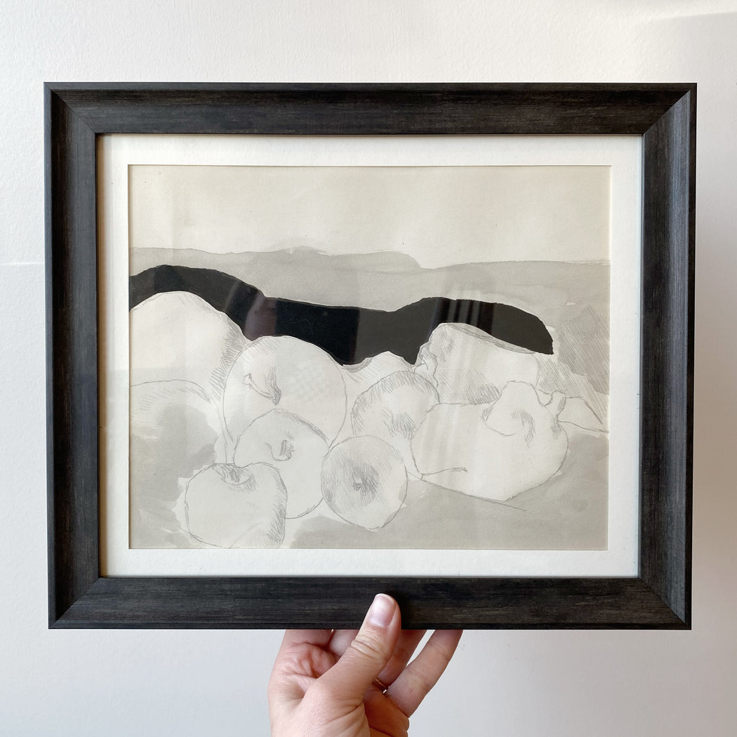 Vintage original pencil and ink still-life drawing, in a new black stained frame.