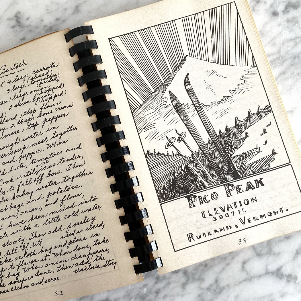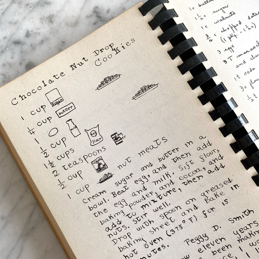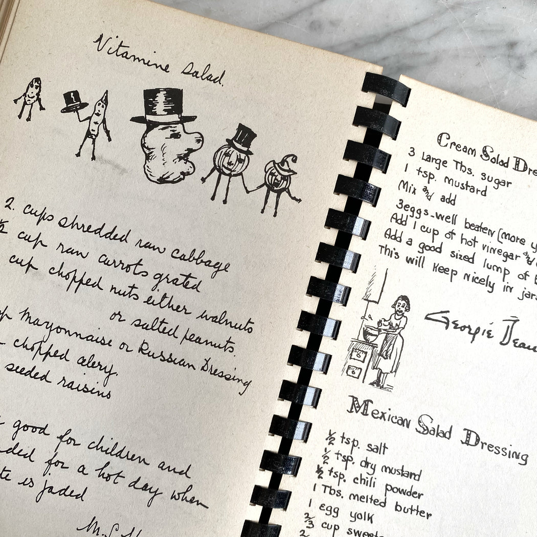Charming vintage cookbook with handwritten recipes and hand-drawn illustrations throughout.