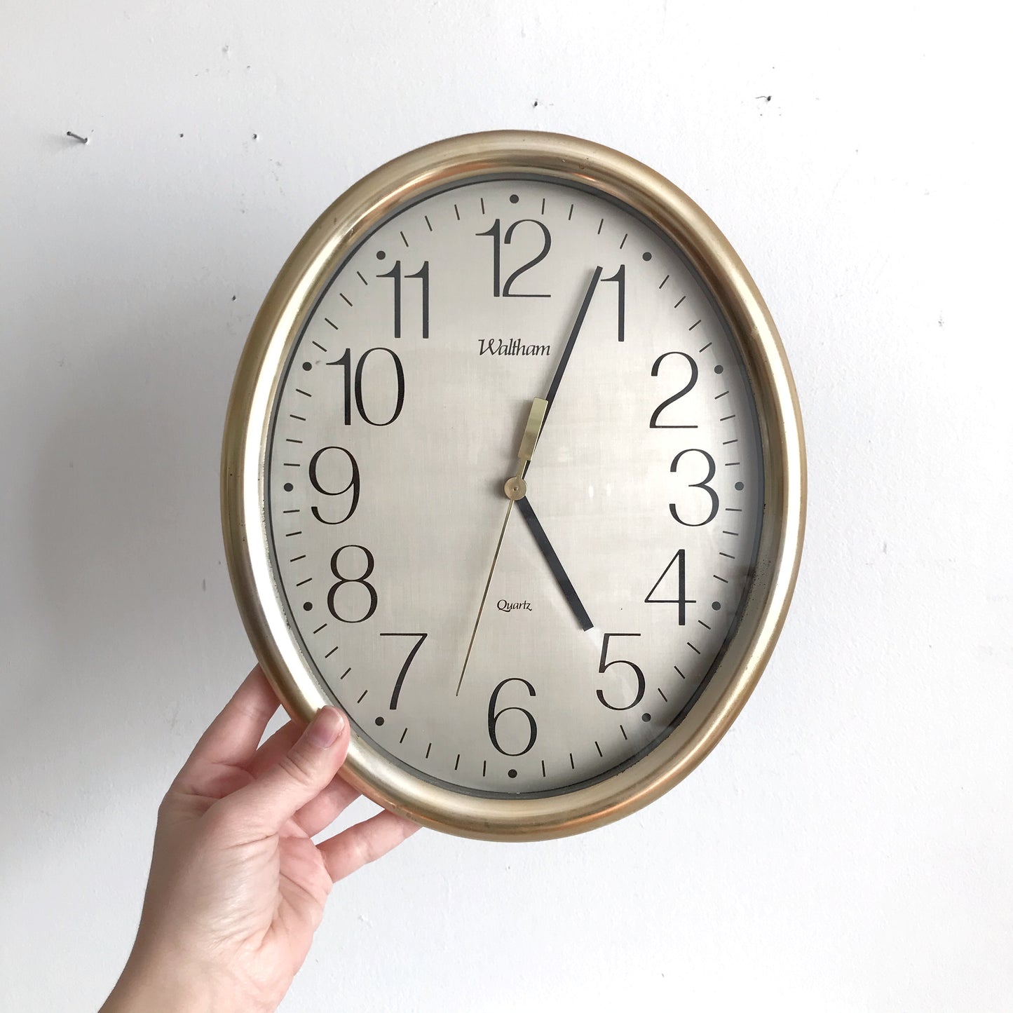 A beautiful and lovely Waltham Quartz analog clock with soft gold-tone frame and oval shape. Takes one AA Battery. In working order.