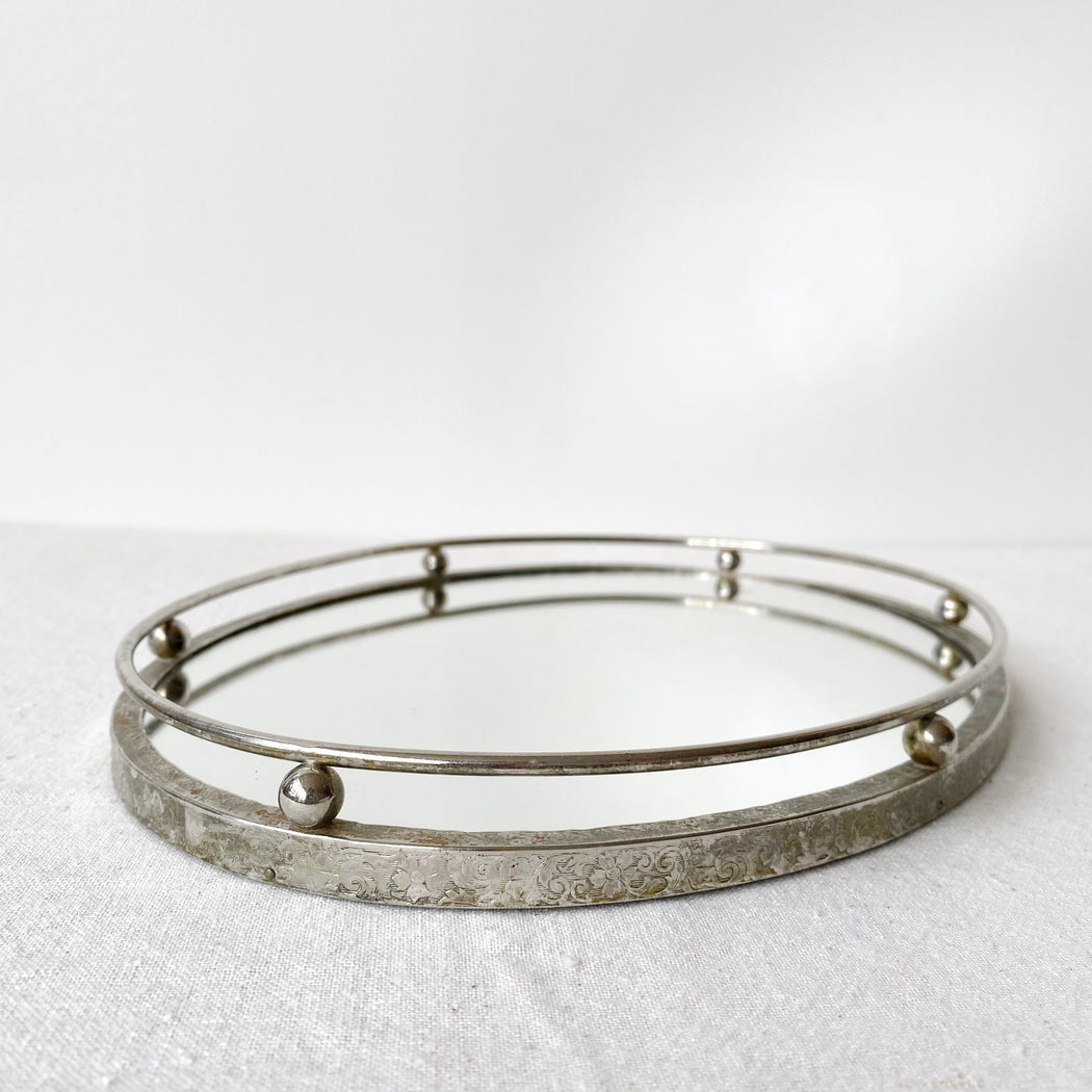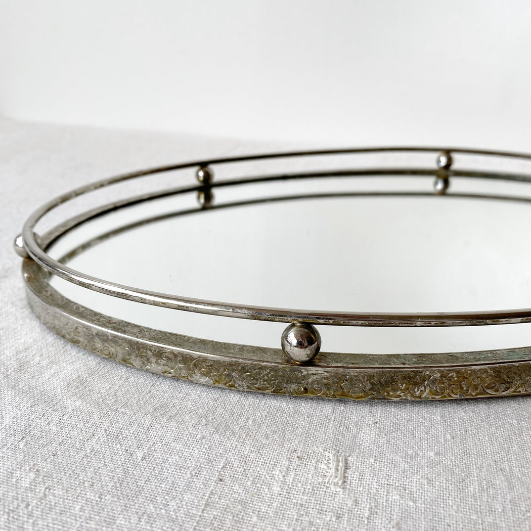 Vintage Oval Mirrored Tray with Silver Rim + Rail