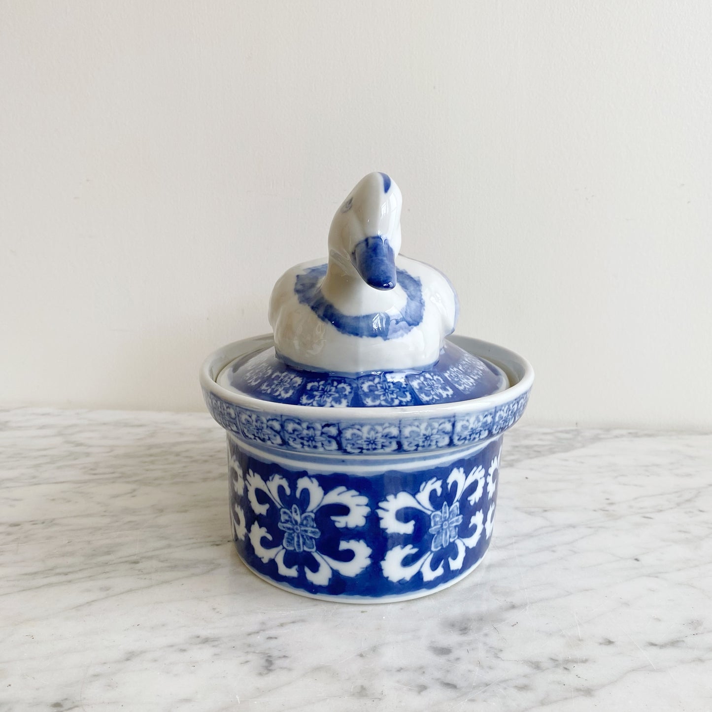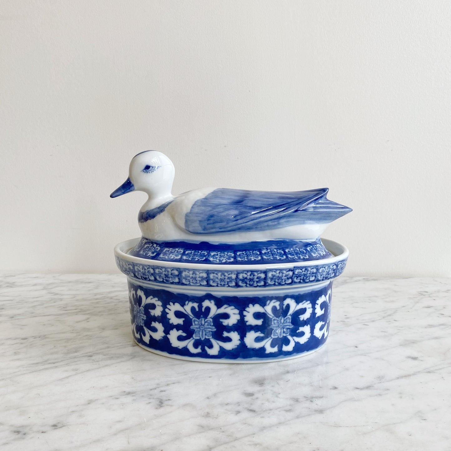 Vintage white porcelain duck soup tureen with blue hand-painted details. This is such a beautiful piece, which looks lovely set out even when not in use. The duck sitting on top has such a sweet face and feather details. The floral pattern around the base bold and beautiful as well.
