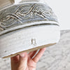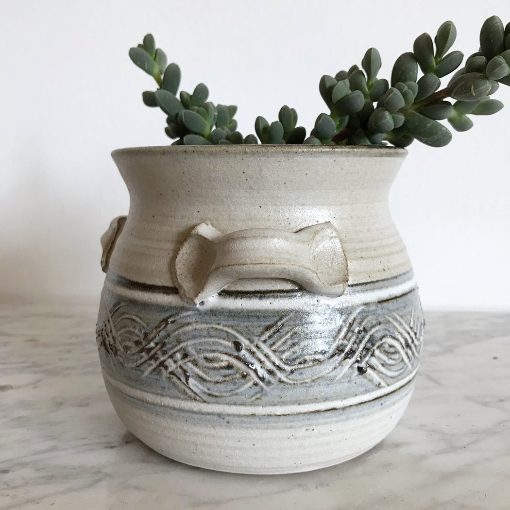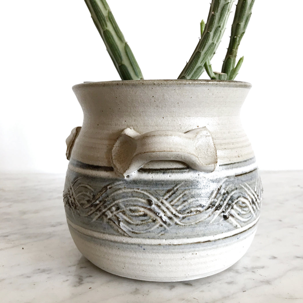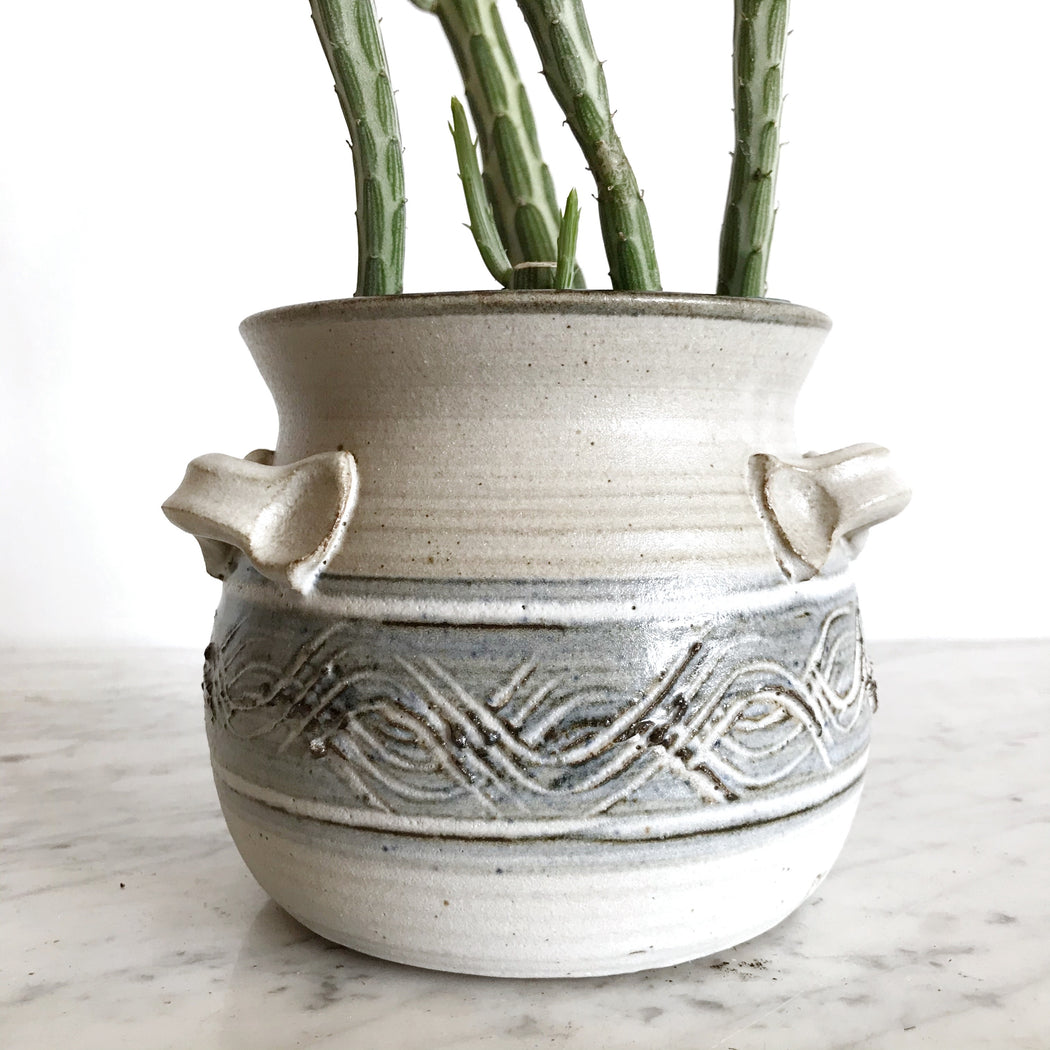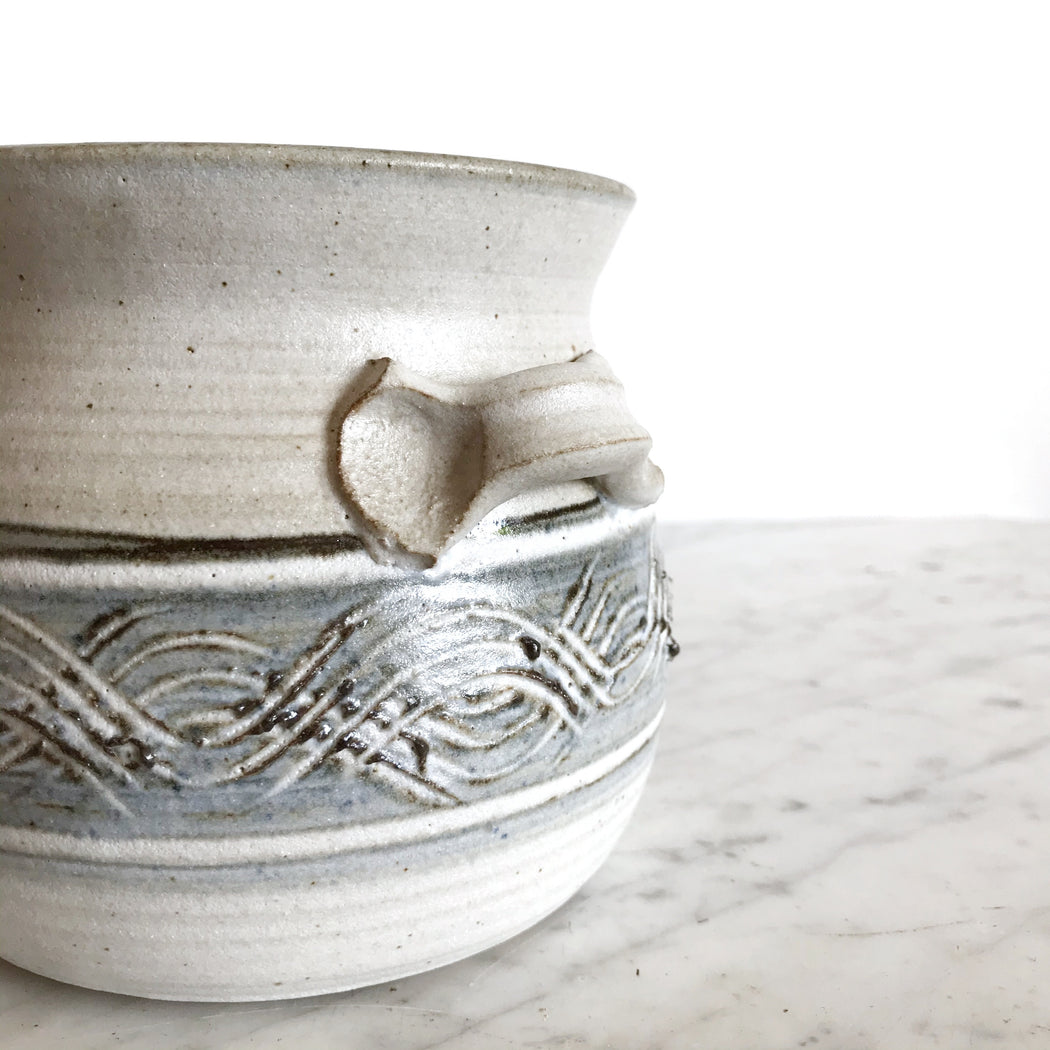 A lovely vintage pottery piece with decorative handles and textured blue wavy pattern around it. Would make a great planter, vase, or container, or as a decorative piece to add to your collection.