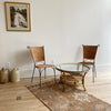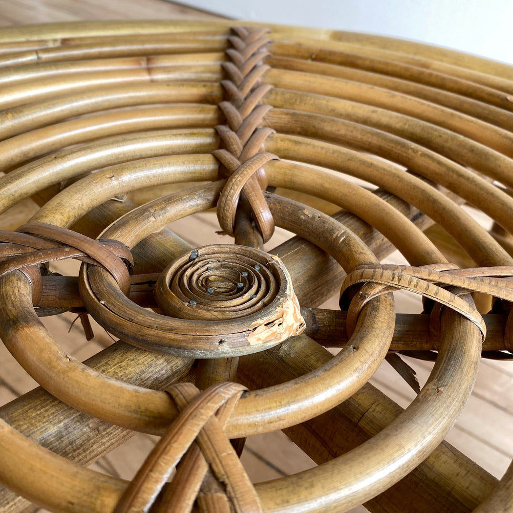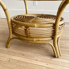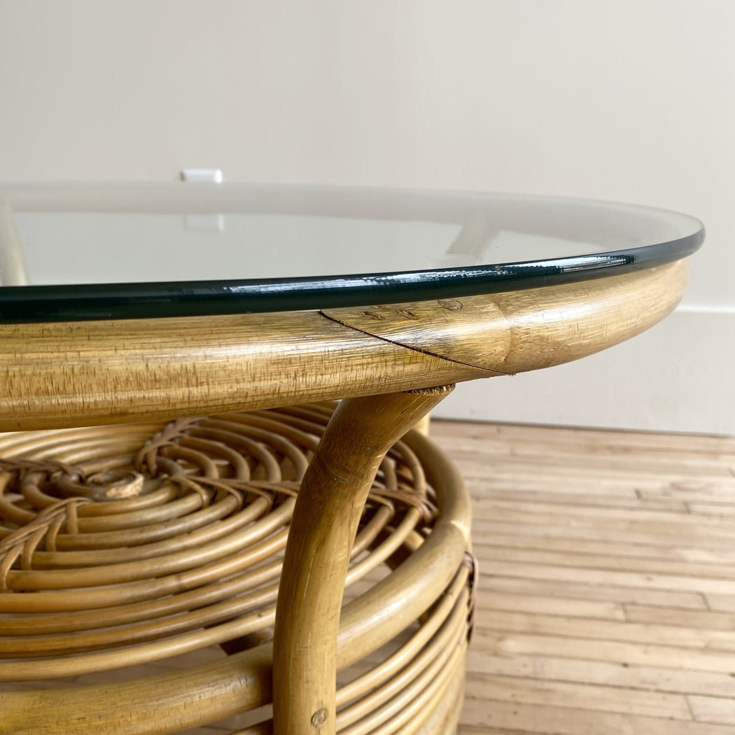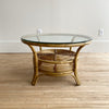 We love this vintage rattan coffee table! The glass top allows tons of light through to see what's on the handy-dandy shelf below!