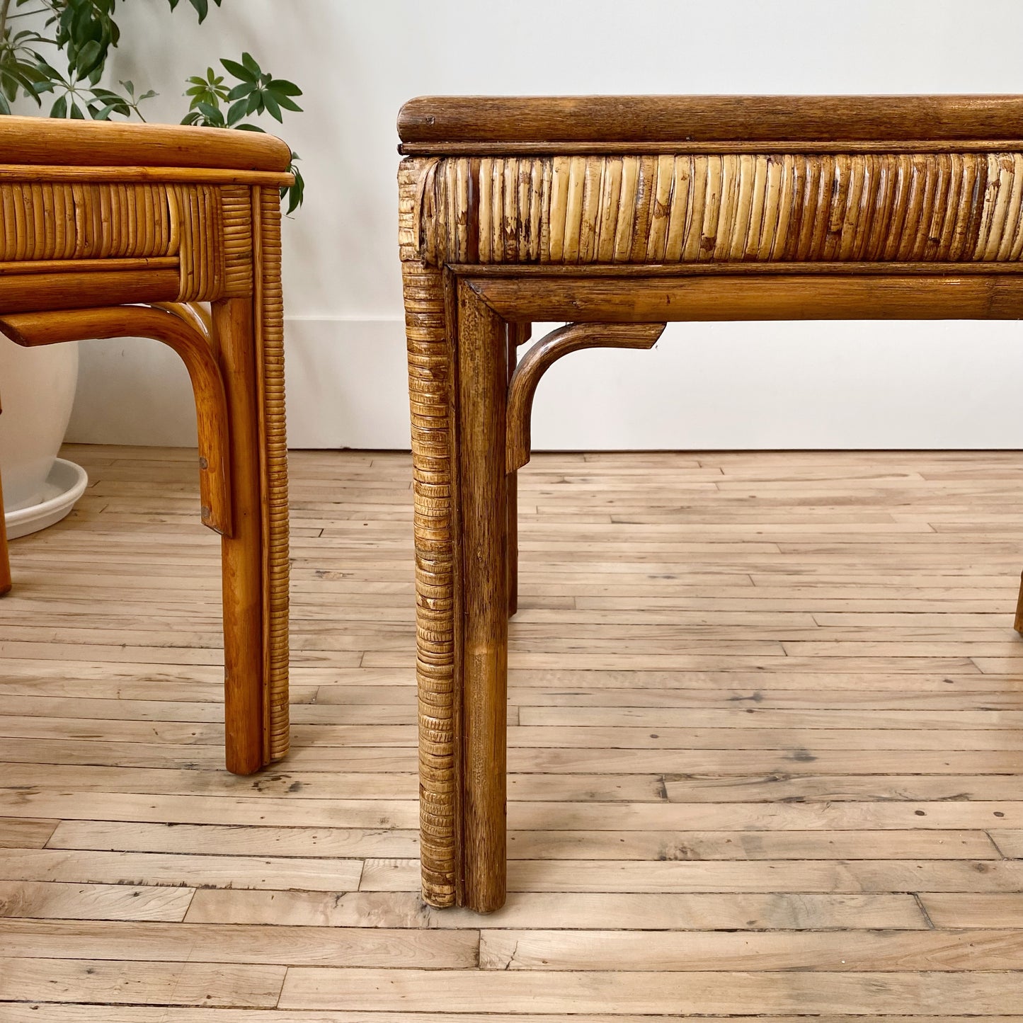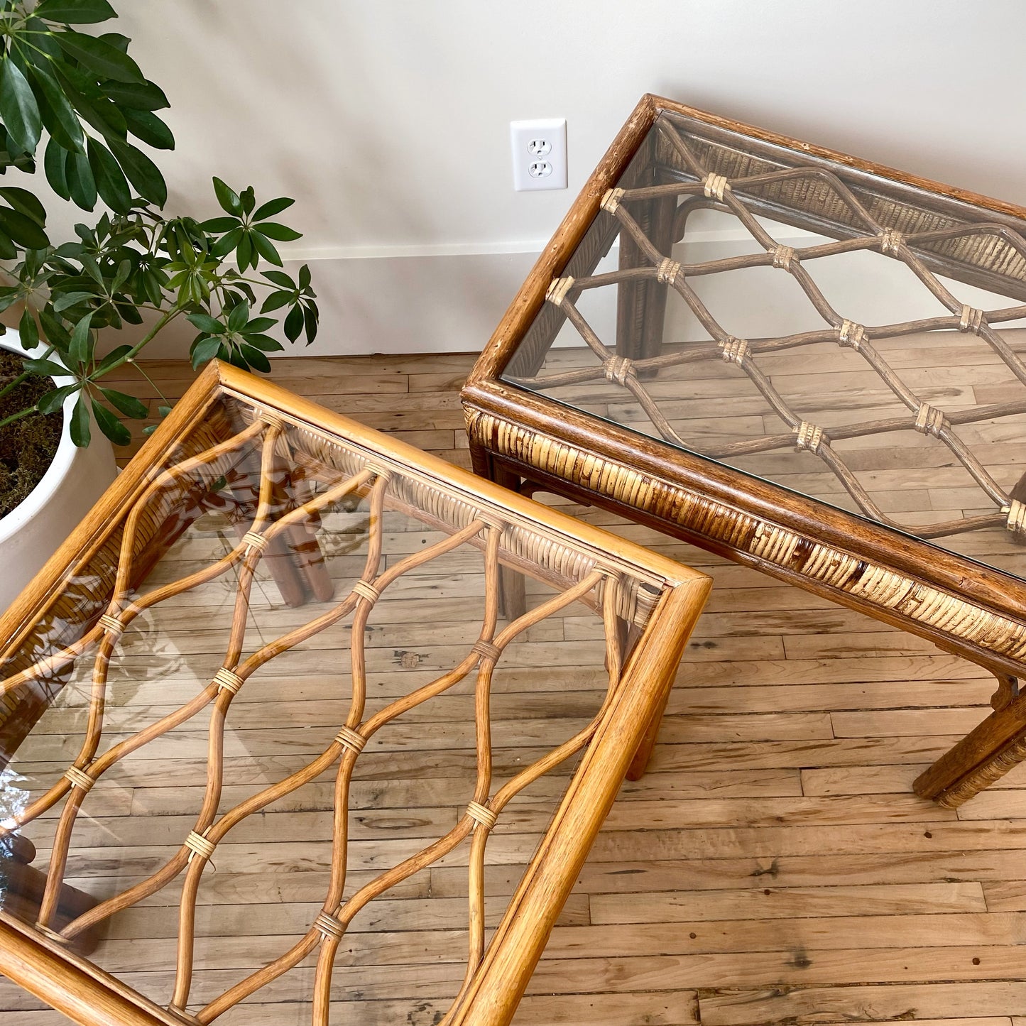 Beautiful vintage rattan end tables, featuring a lovely woven trellis-like design supporting the glass tops. Sold separately.