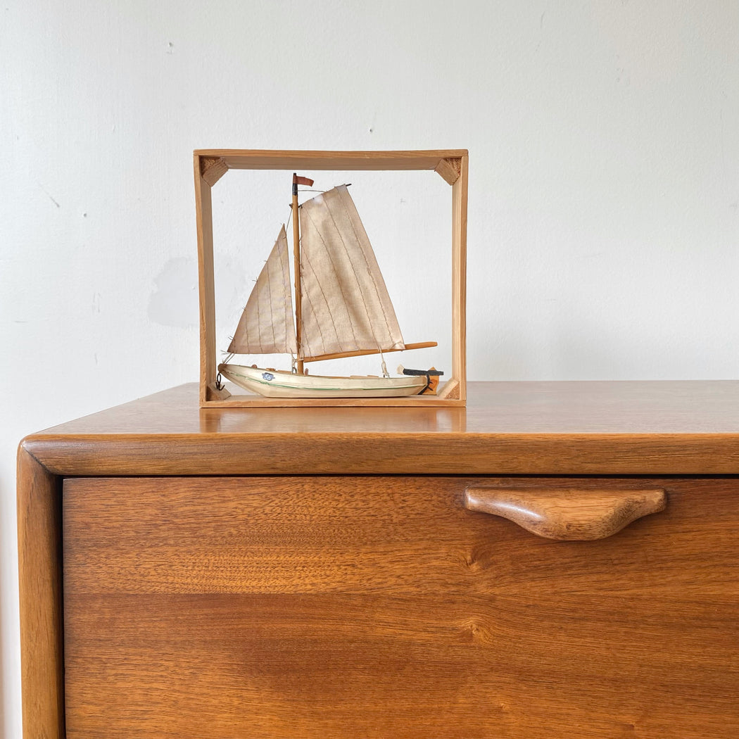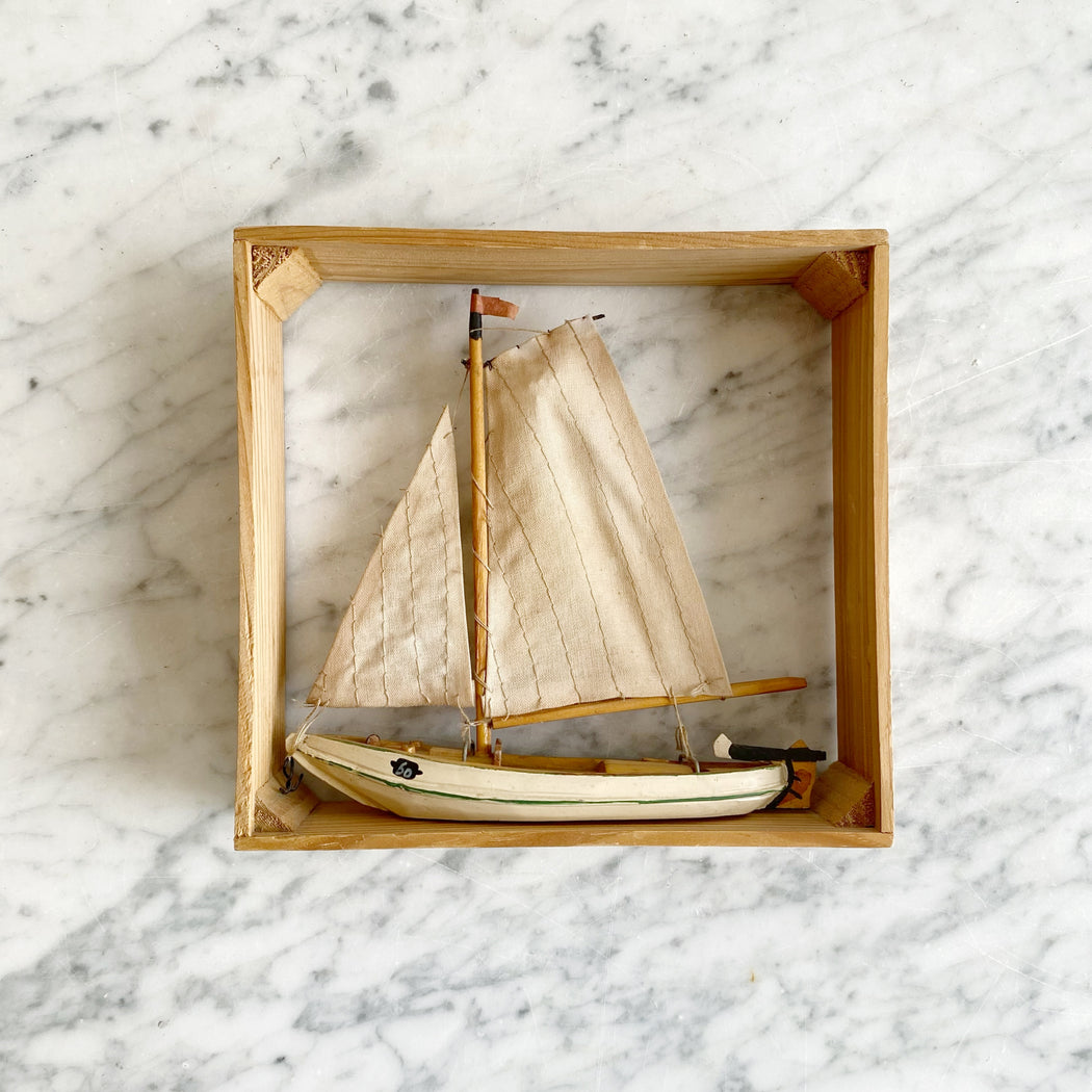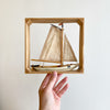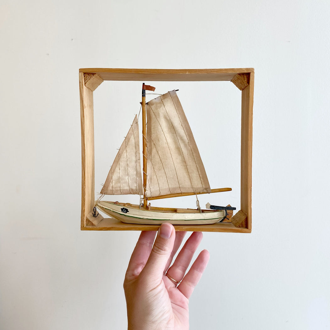 Words can hardly describe just how charming this vintage sailboat is! Sitting within a wooden frame / shadow box, it can sit nicely in any windowsill or bookshelf!