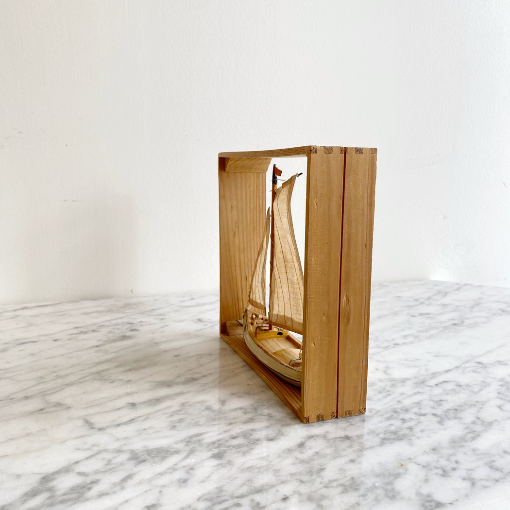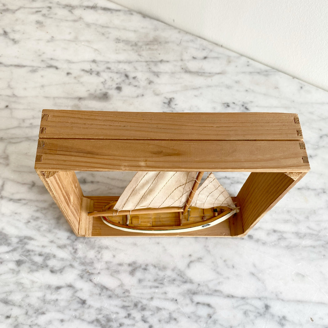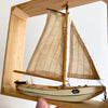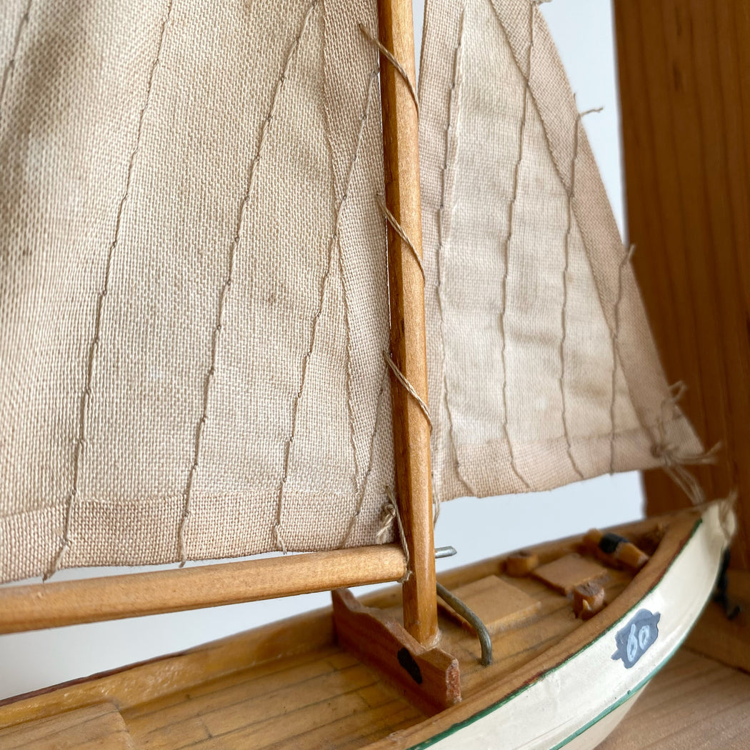 Words can hardly describe just how charming this vintage sailboat is! Sitting within a wooden frame / shadow box, it can sit nicely in any windowsill or bookshelf!
