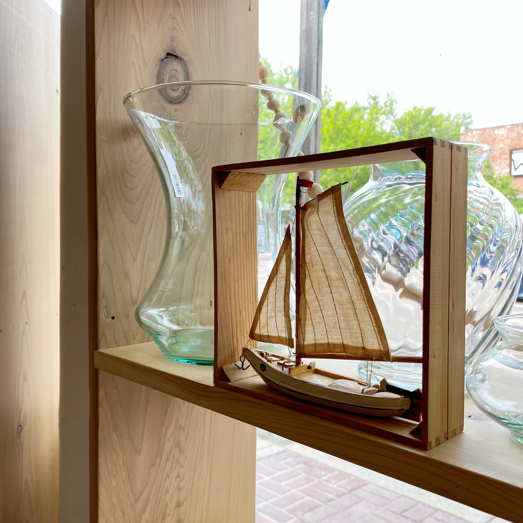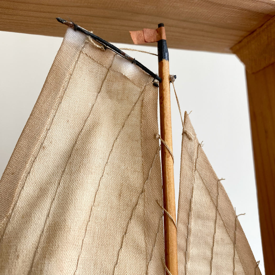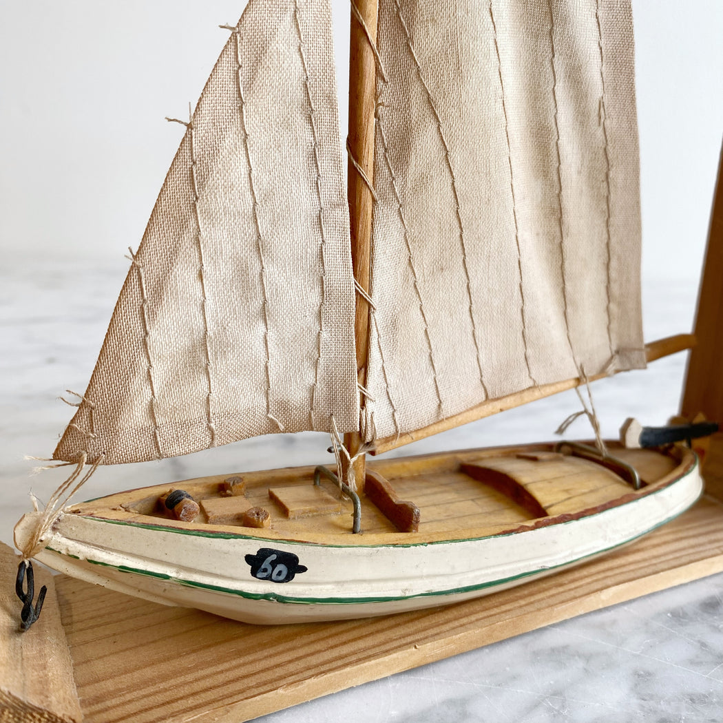 The sailboat is meticulously crafted and carved from wooden pieces and fabric sails. Hand-painted details for extra charm!